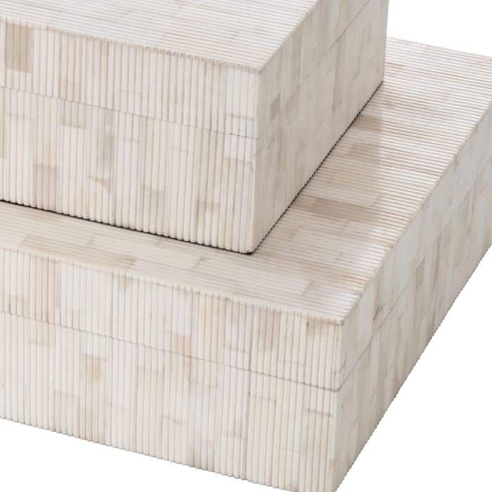 Box Scoop är en elegant och praktisk förvaringslösning från Eichholtz som förenar stil med funktionalitet. Denna vackra låda har en klassisk design med rena linjer och är tillverkad av äkta ben. Dess kompakta storlek gör den perfekt för att organisera små föremål som smycken, nycklar eller andra accessoarer. Oavsett om den placeras på en byrå, en hylla eller ett skrivbord, kommer förvaringslåda Scoop att tillföra en touch av elegans och ordning till ditt hem eller kontor och kombineras gärna med de två storlekarna tillsammans.