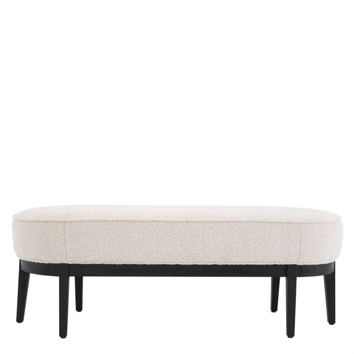 Om du gillar 70-talets organiska former men i modern tappning i din inredning så är bänk Jarrett helt rätt för dig. Den här bänken har en mjuk slät form med rundade hörn och kommer att vara ett elegant och praktiskt komplement till din hall, vardagsrum, sovrum eller klädkammare. Sitsen är klädd i Bouclé Cream. Ramen med svart finish har tre istället för två ben på vardera sidan, vilket gör den här bänken till ett riktigt statement.