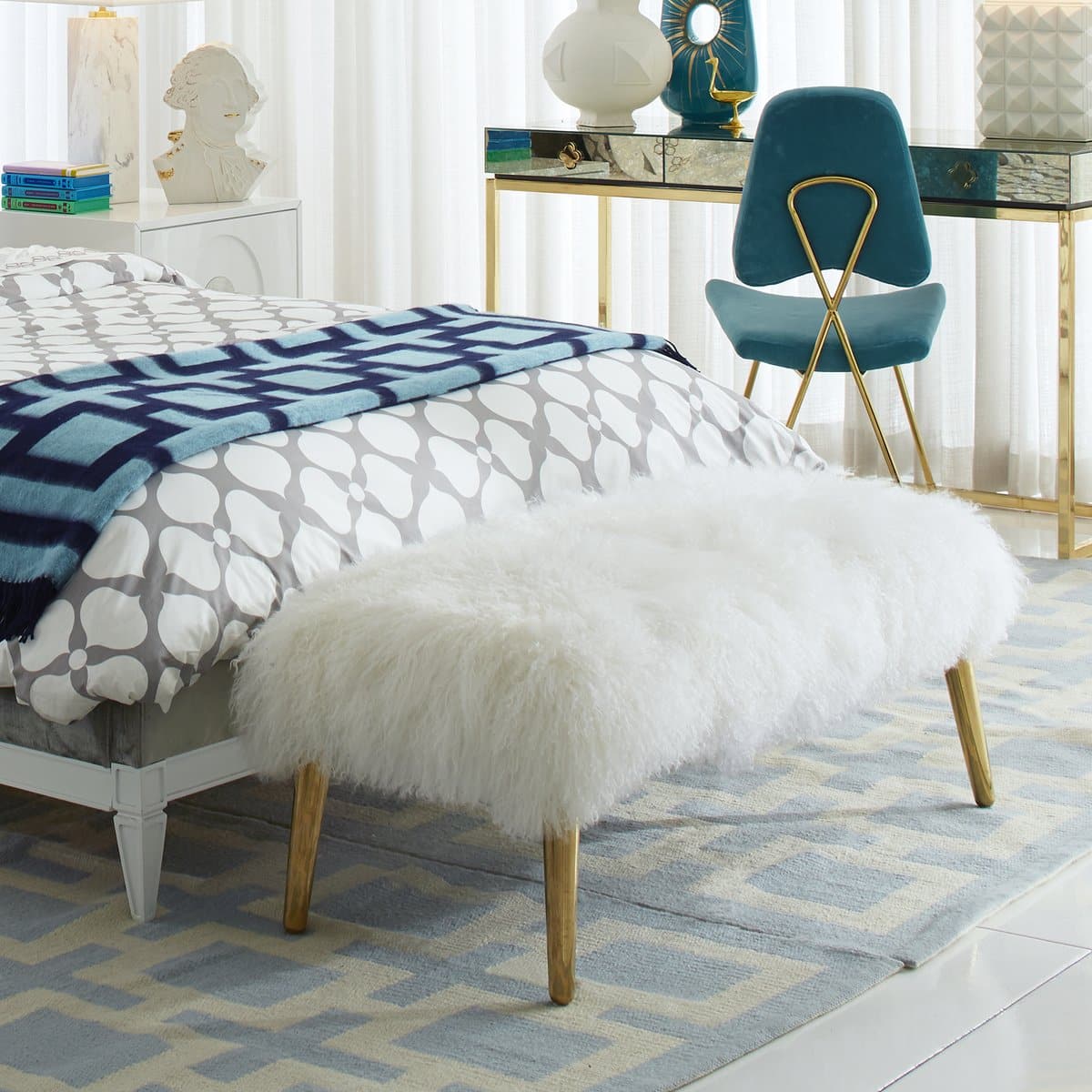 A plush Mongolian lamb bench with brass legs for a surprising and glamorous twist. It’s the perfect perch at the foot of a bed, a natural opposite a sofa, and fab in an entryway.