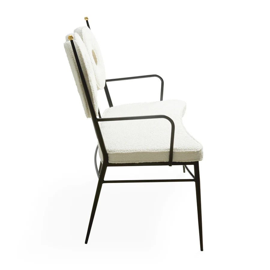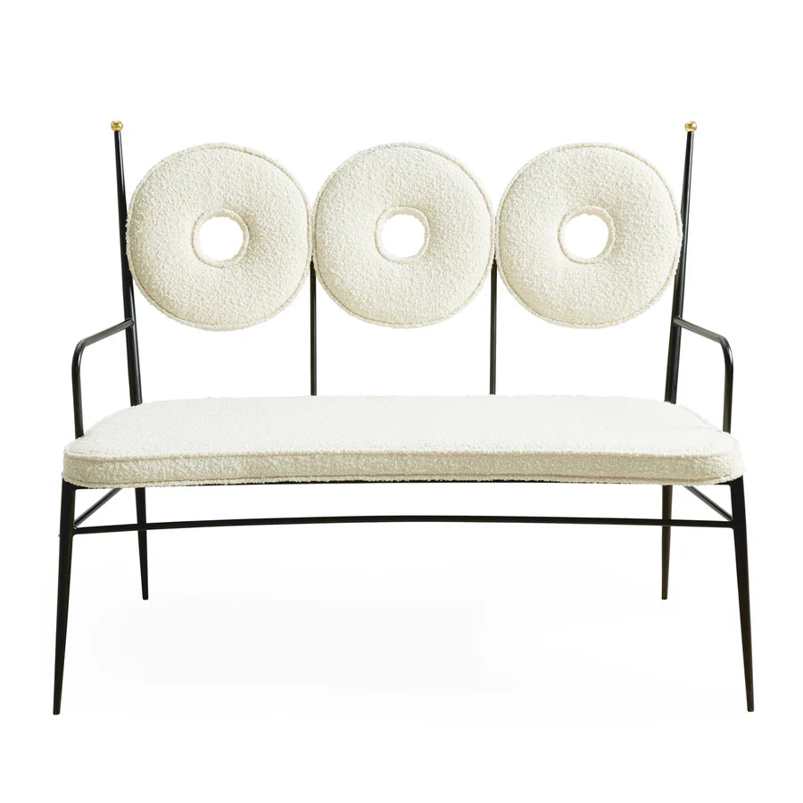 Vår bänk Rondo i bouclé white imponerar med sin unika design: en svart stålram håller upp tre runda ryggkuddar som verkar sväva. Toppad med polerade mässingskulor för en extra touch av glamour och utrustad med en mjuk och inbjudande sits i varm oatmeal bouclé, kombinerar denna bänk både komfort och stil.