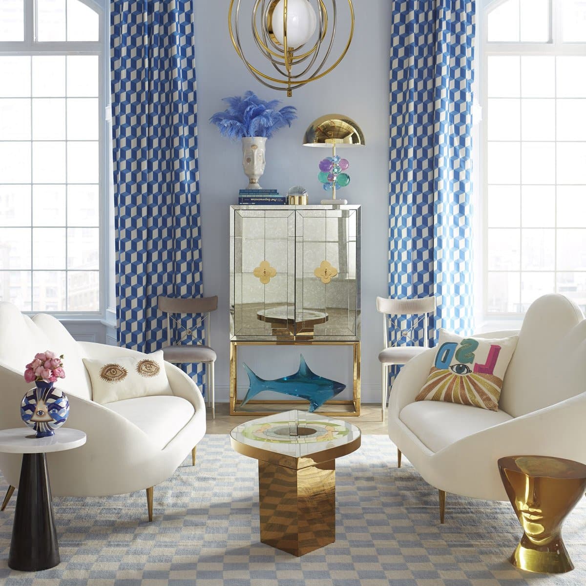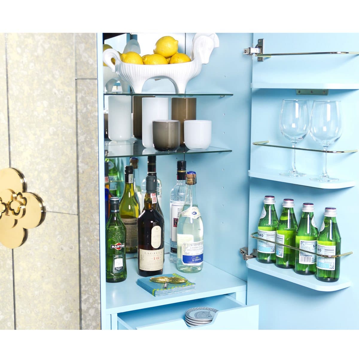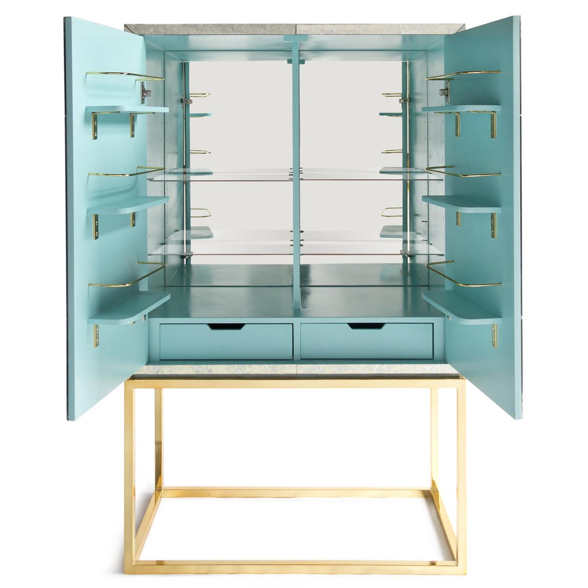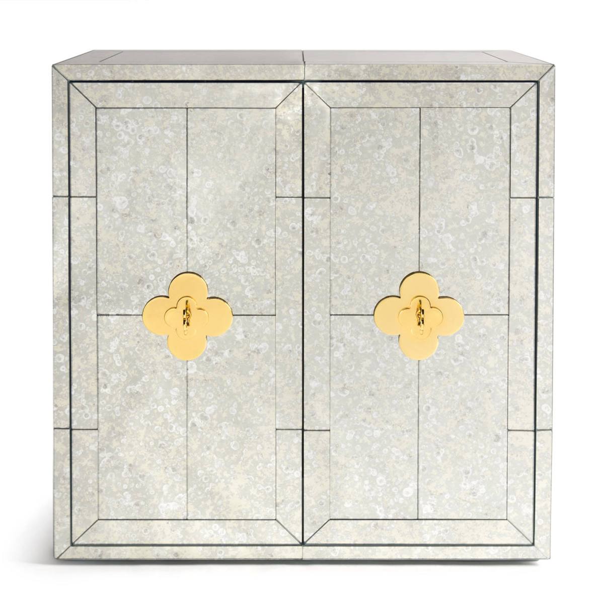 Minimalist forms meet Maximalist glamour. Antiqued mirror with a polished brass base. The robin’s egg blue interior is fitted with four adjustable tempered glass shelves, plus six wire-bound drinking glass shelves inside the doors. Two drawers at the base will keep all your mixing accoutrements at hand. The finishing touches—quatrefoil handles and escutcheons—give our Delphine Bar over-the-top allure.