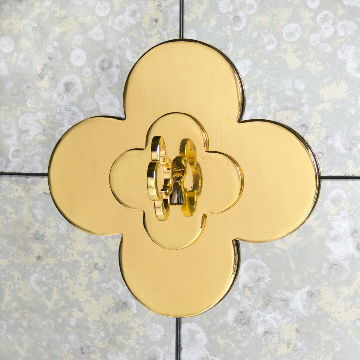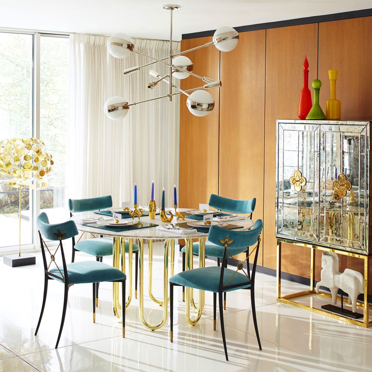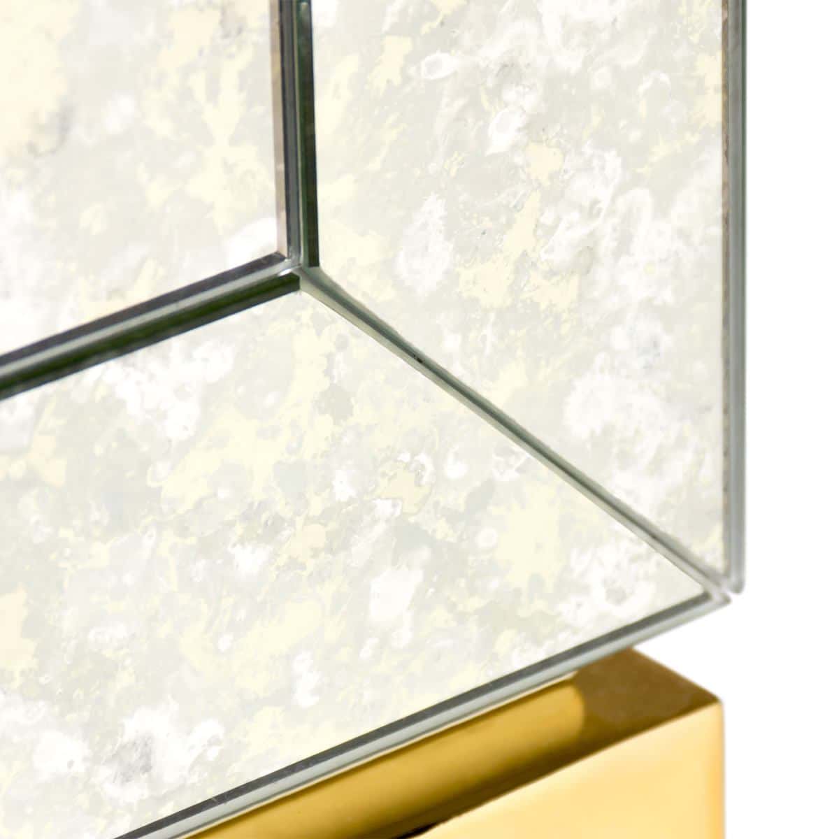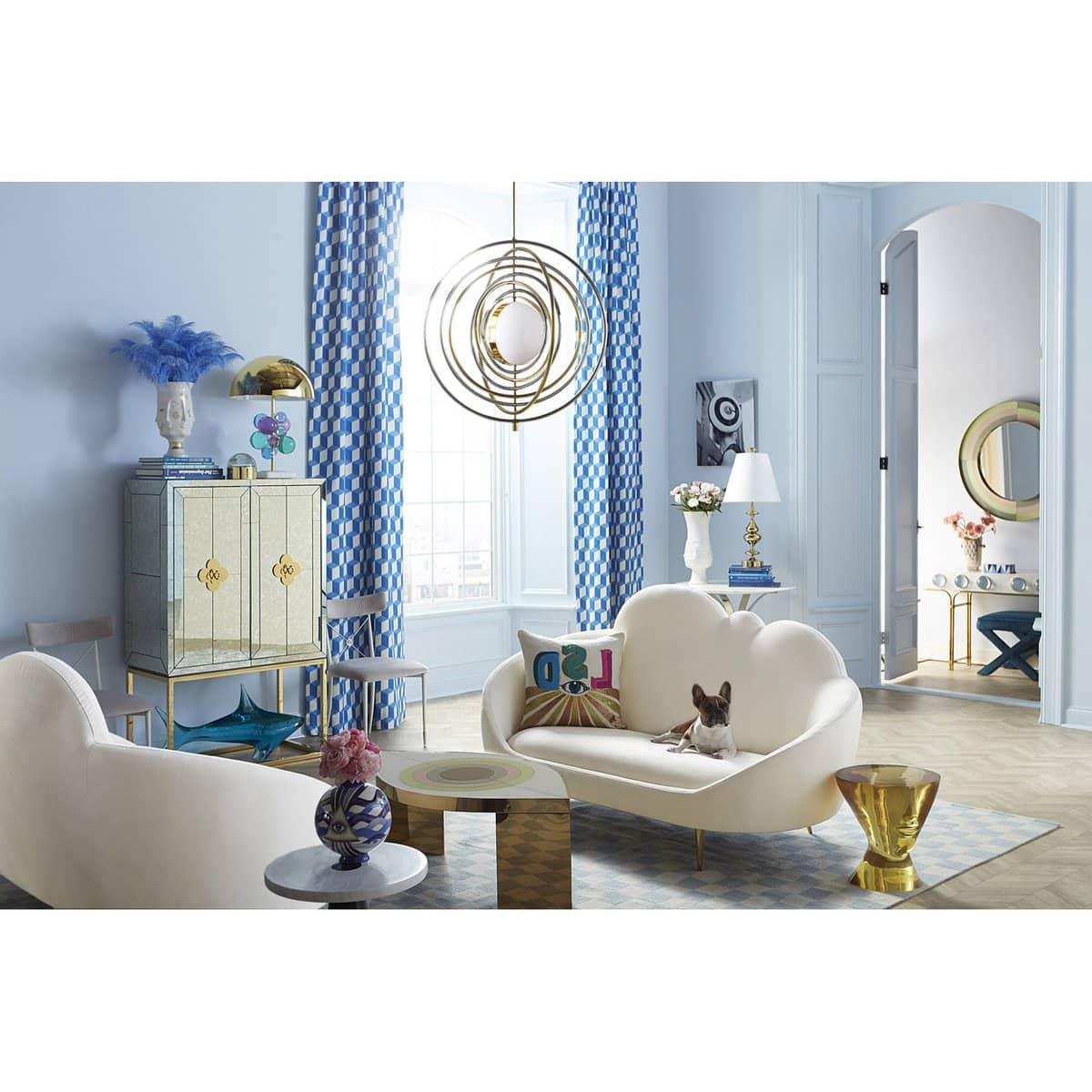 Minimalist forms meet Maximalist glamour. Antiqued mirror with a polished brass base. The robin’s egg blue interior is fitted with four adjustable tempered glass shelves, plus six wire-bound drinking glass shelves inside the doors. Two drawers at the base will keep all your mixing accoutrements at hand. The finishing touches—quatrefoil handles and escutcheons—give our Delphine Bar over-the-top allure.