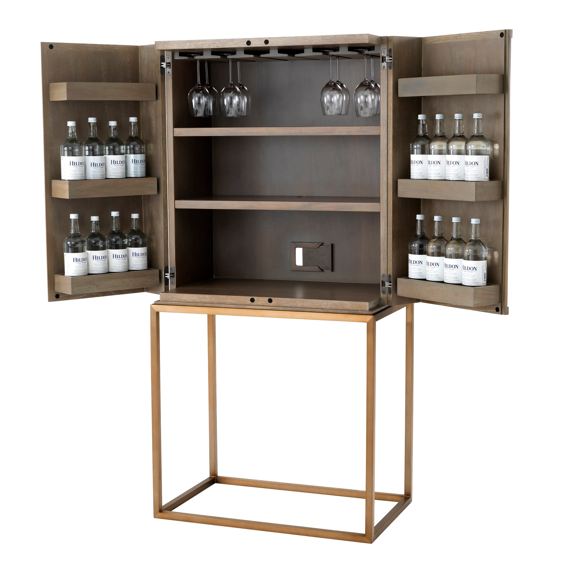 Presentera din samling av sprit och viner med stil och klass i detta läckra barskåp. Med sin ekfanér och metallstativ i borstad mässingsfinish blir detta dryckesskåp ett elegant och användbart tillskott till ditt vardagsrum. Tack vare sina triangulära och rektangulära silhuetter kommer skåpdörrarna med högsta sannolikhet att bli fantastiska blickfång. Öppna dörrarna för att avslöja din ultimata hemmabar och bjud dina gäster på deras favoritdrinkar.