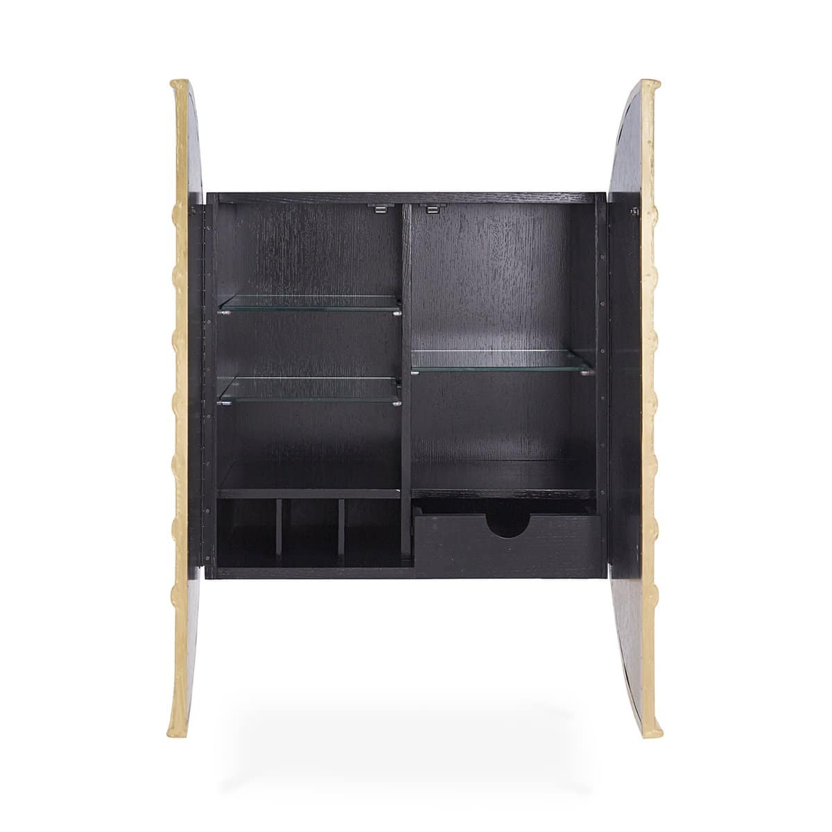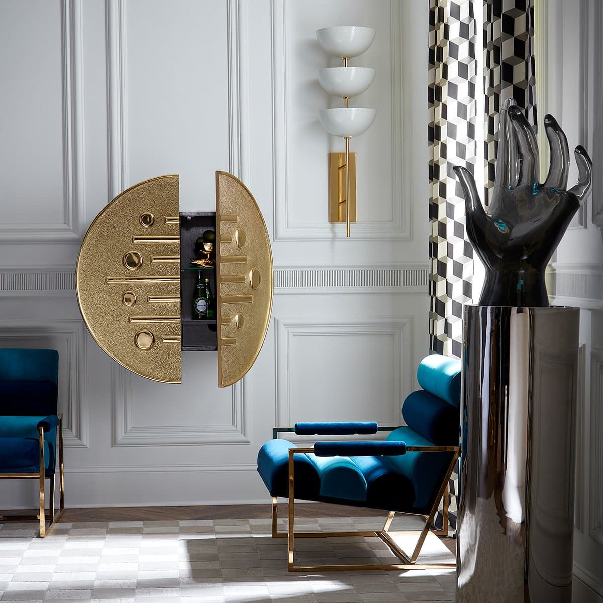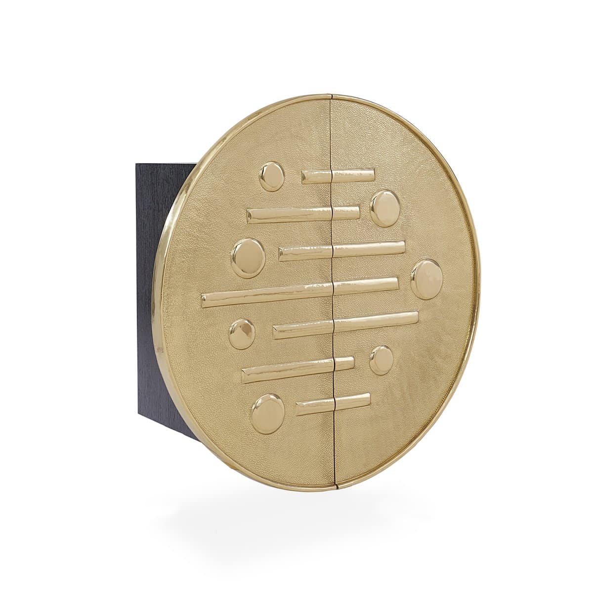 Designed to mount to the wall or stand on polished brass legs, our Reform Circle Bar is a must-have for couture cocktail hours. Interior features include adjustable shelves, a soft-close drawer and three organizational compartments.