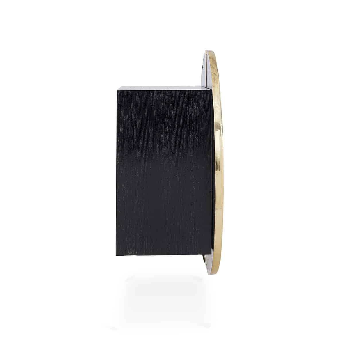 An ebonized and limed oak cabinet with doors featuring a relief texture originally sculpted in our Soho pottery studio—clad in a sheet of brass, then hand-hammered and polished to perfection.