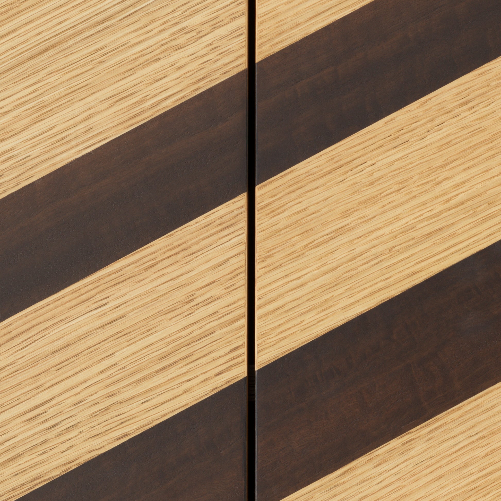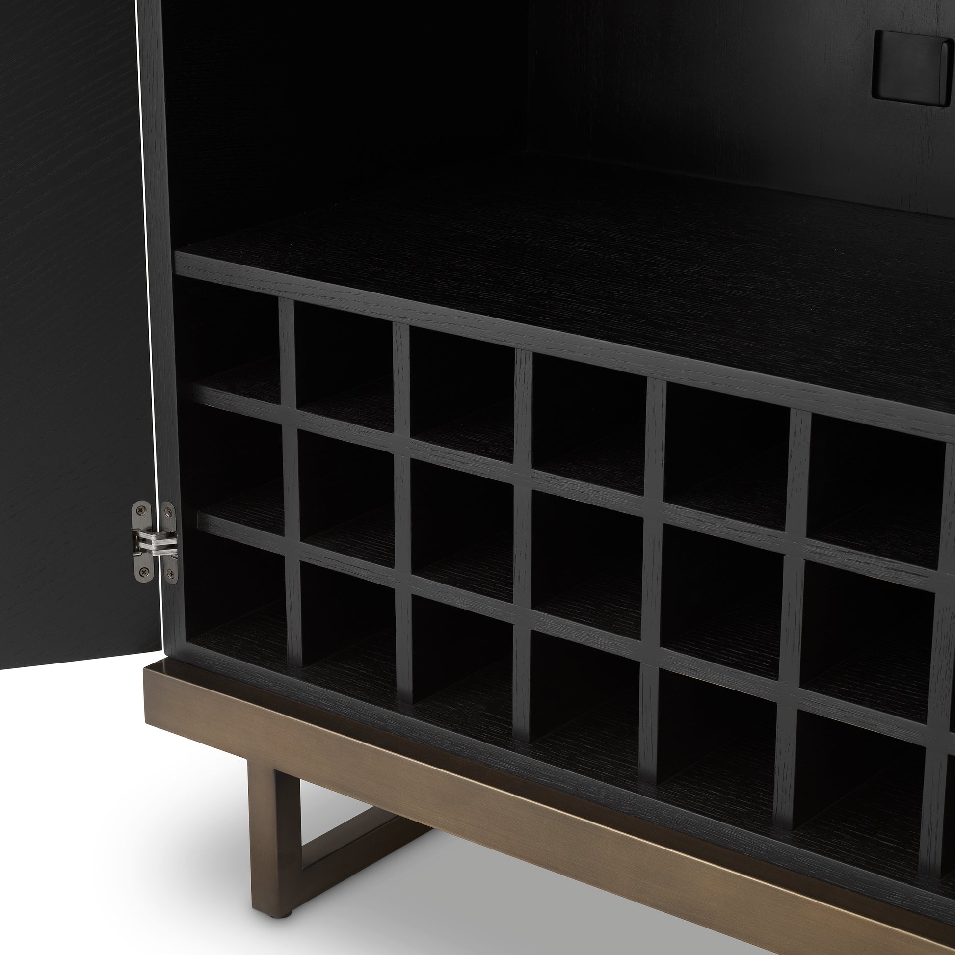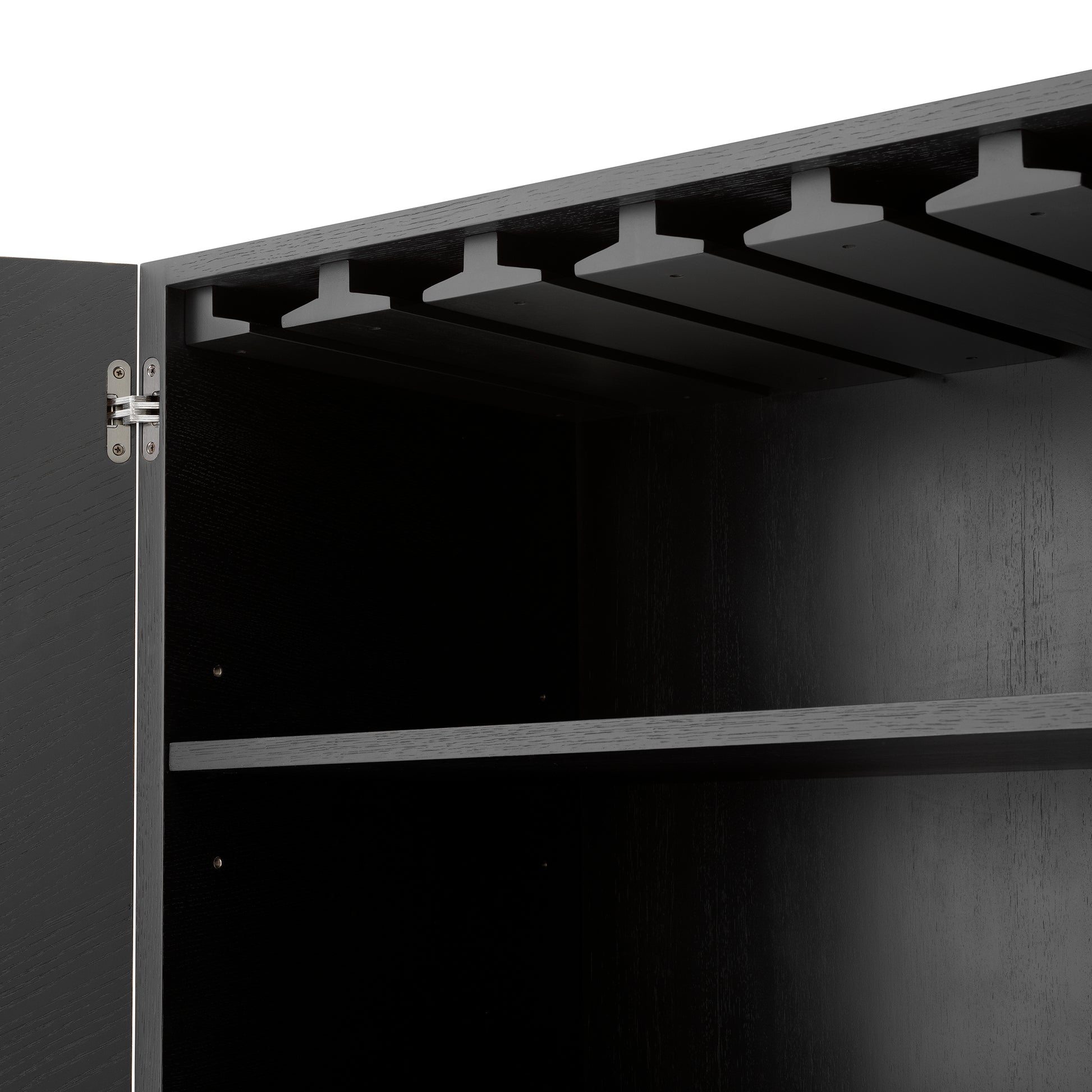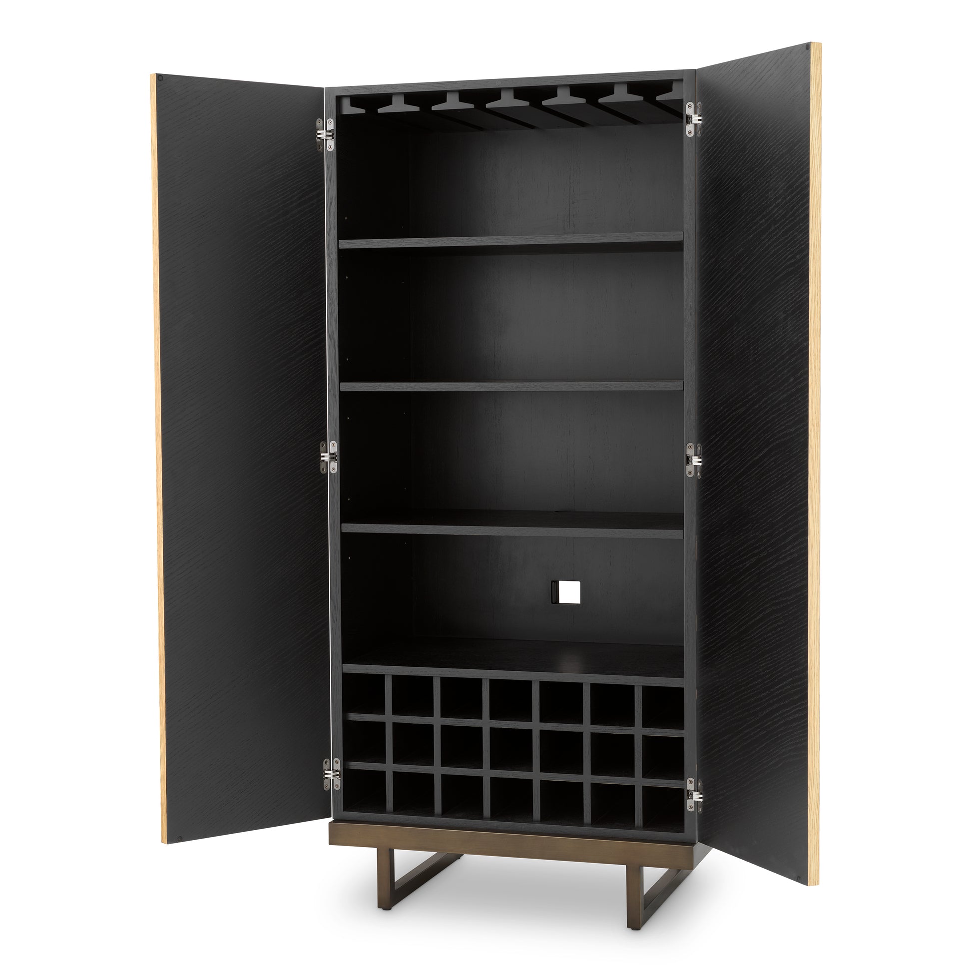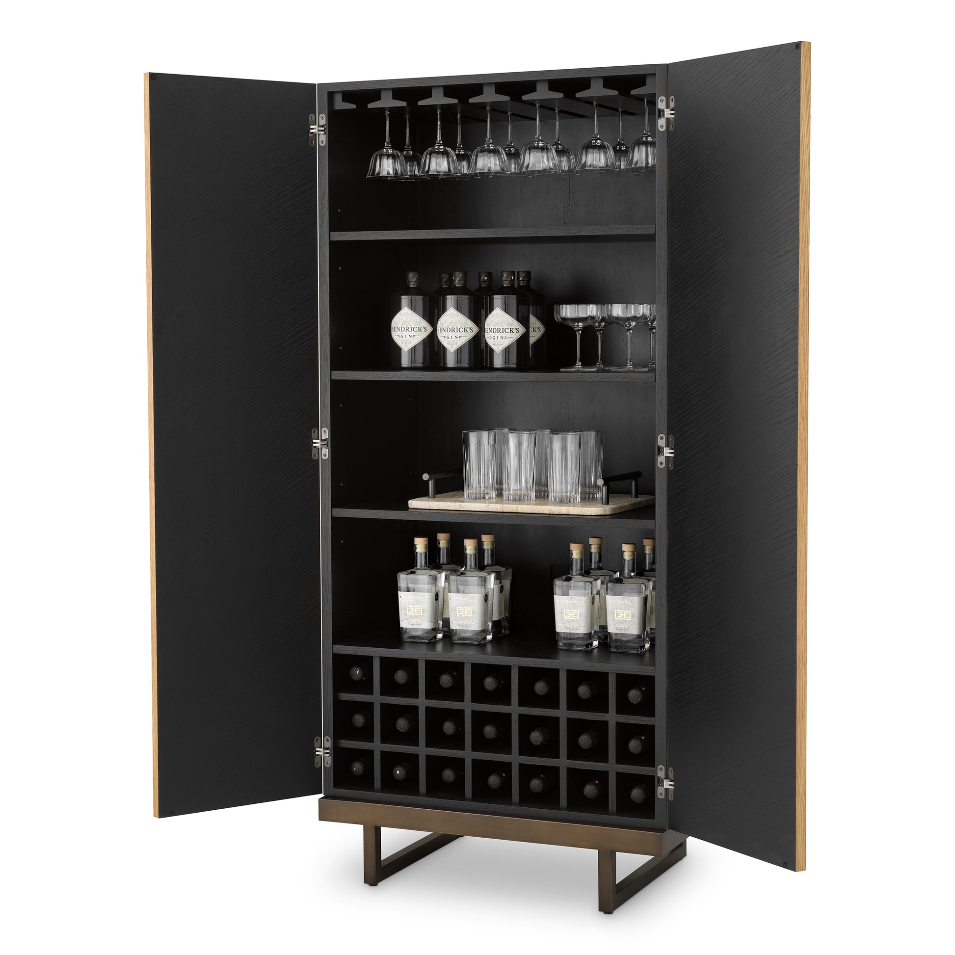 Barskåp Wexford från Eichholtz kombinerar den varma karaktären hos naturlig ekfanér med den subtila rikheten i eucalyptusfanér, vilket skapar en harmonisk blandning av texturer och toner. Bakom de eleganta dörrarna finns plats för upp till 21 flaskor, gott om utrymme för glas och ett hängande ställ för vinglas, vilket förenar smart design med tidlös stil för enkel och elegant servering.