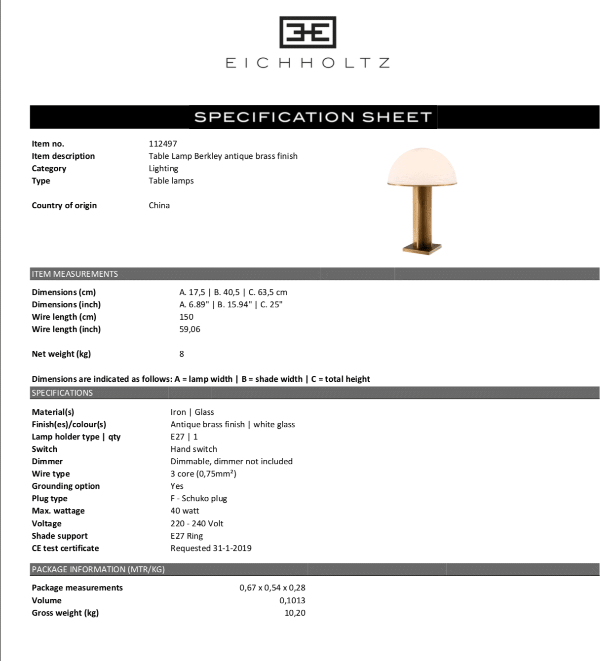 Table Lamp Berkley från Eichholtz. Ståtlig och läcker bordslampa med vitfärgat glas.