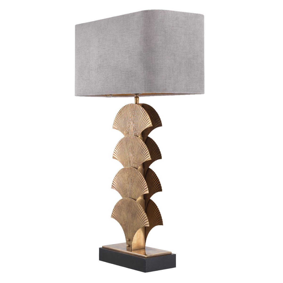 Bordlampa Iris från Eichholtz är en mycket vacker designlampa med en bas av svart granit och fot i vintage mässingsfinish formad med inspiration av palmblad. Elegant toppad med en gråaktig lampskärm som rundar av med sin mjuka framtoning på ett mycket läckert och elegant sätt.