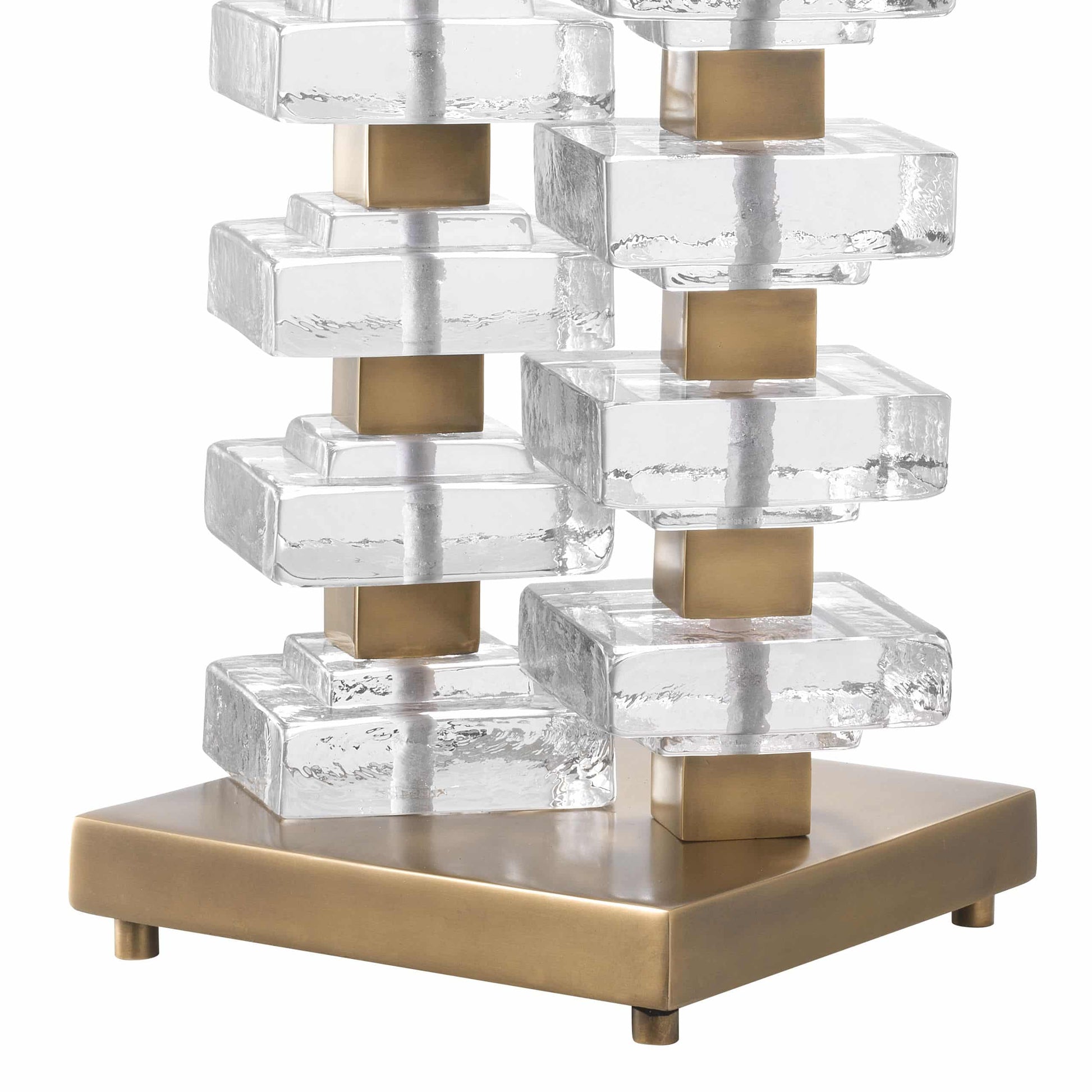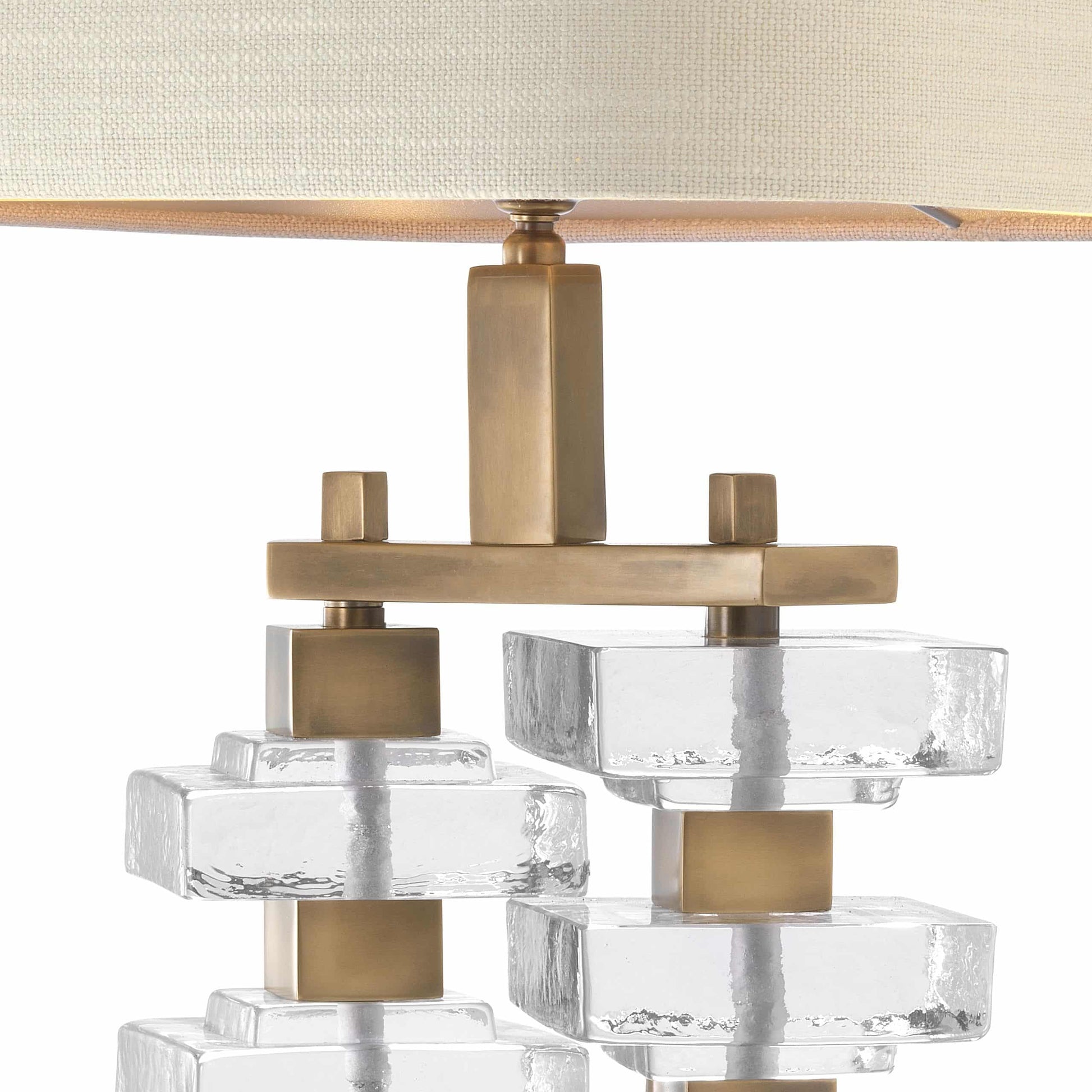 Härlig bordslampa i handblåst klarglas och skärm i linne. En lyxig och exklusiv lampa som passar de flesta inredningsstilar.