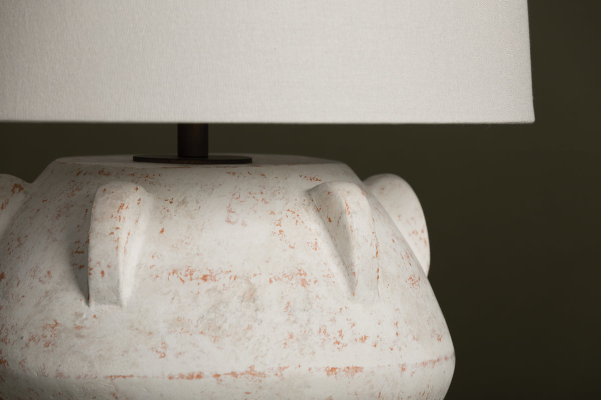 Vanda Bordslampa från Hudson Valley Lighting Group är inspirerad av antika keramiska föremål som grävts fram. Lampan har en rund bas i en vitvaxad keramisk finish, vilket ger den en vacker, väderbiten look. Den vida skärmen i vitt linnetyg sprider ett mjukt, varmt ljus som reflekteras på basen nedan. Vanda är den perfekta lampan för att skapa en jordnära och organisk känsla i vilket rum som helst. Placera den på ett bord för att ge ditt hem ett stilfullt och naturligt uttryck.