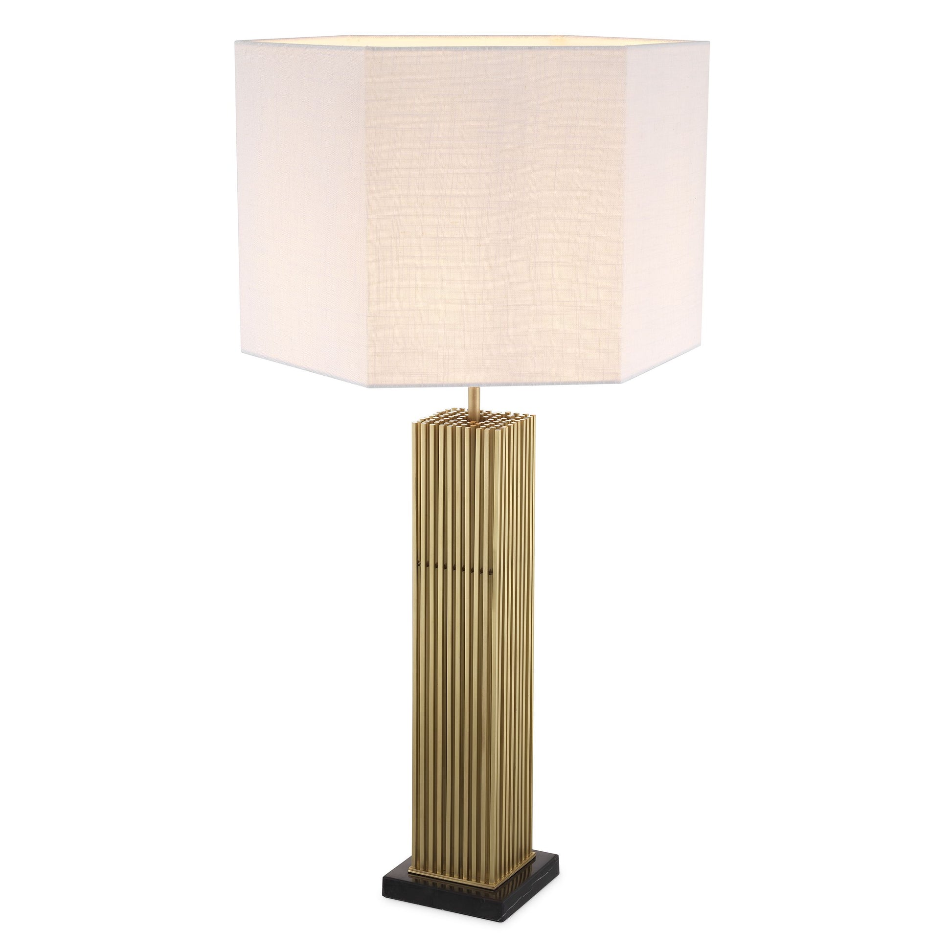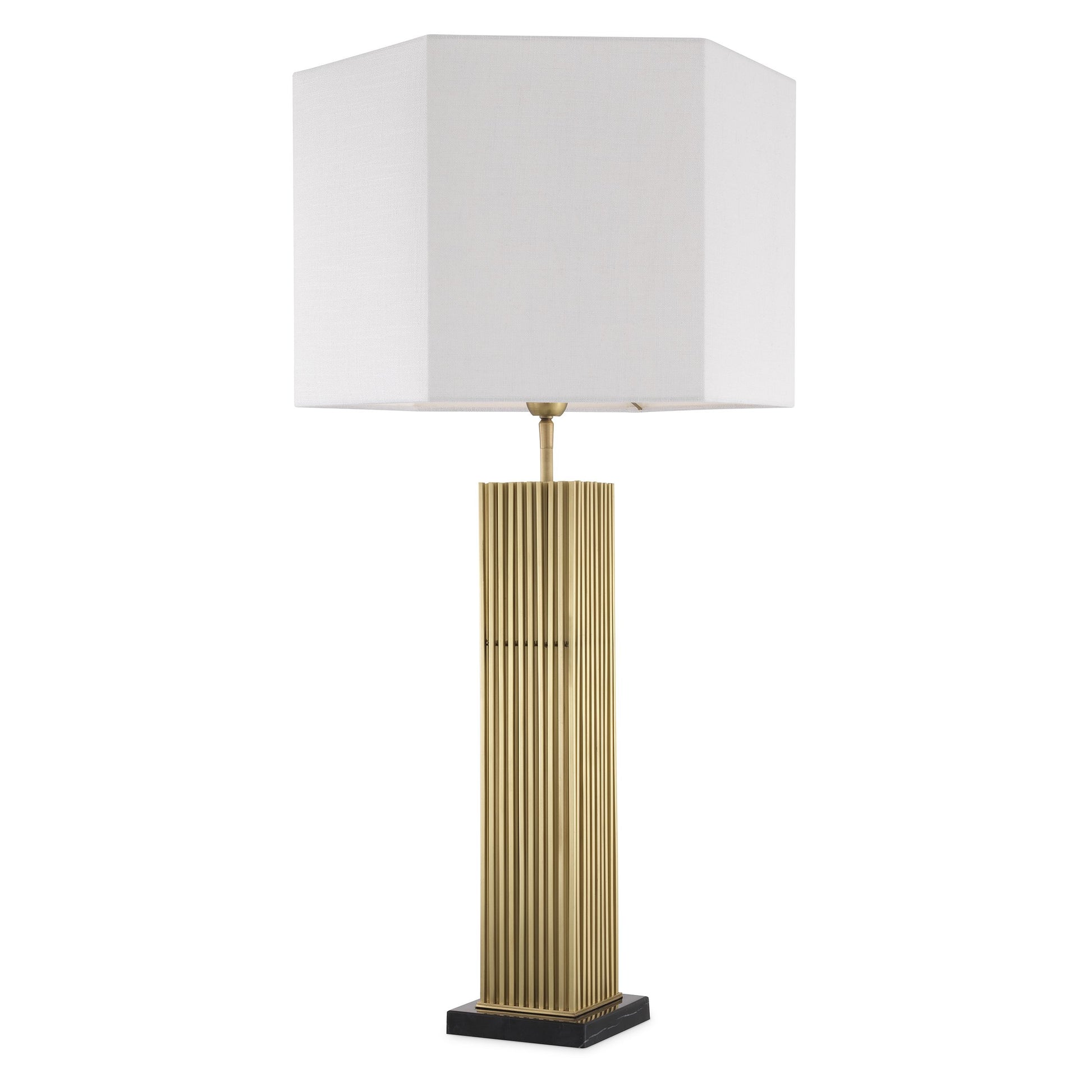 En läcker och exklusiv designlampa i vintage mässingsfinish, fot i svart granit och vit skärm. Mycket elegant och härlig inredningsdetalj som inte bara blir en lampa utan även ett smycke i hemmet.