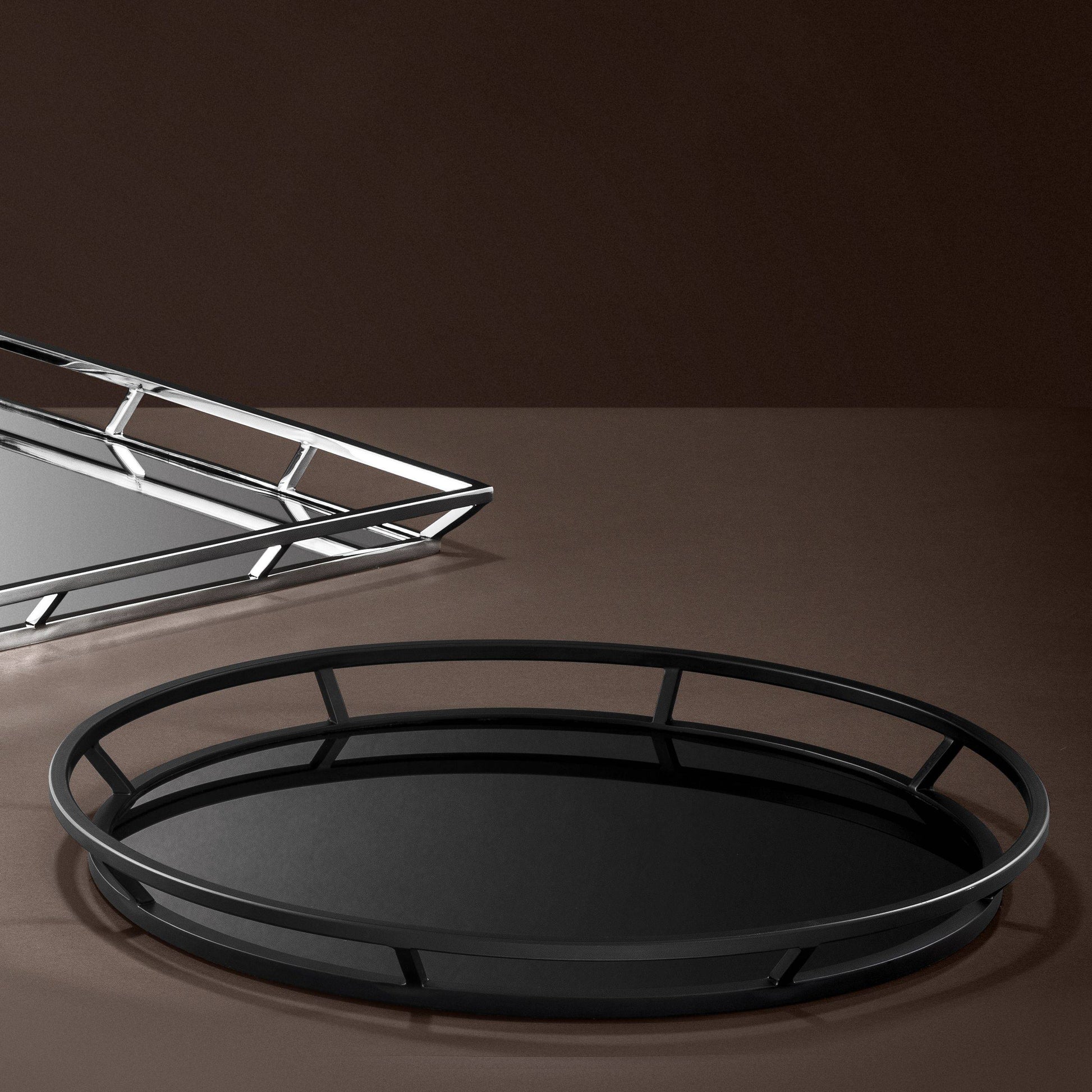 Exklusiv och utmärkande bricka med botten i svart spegelglas och ram i mattlackad, svart finish. Mycket exklusiv och iögonfallande inredningsdetalj. Extremt läcker att servera drinkar eller snittar och annat småplock på.