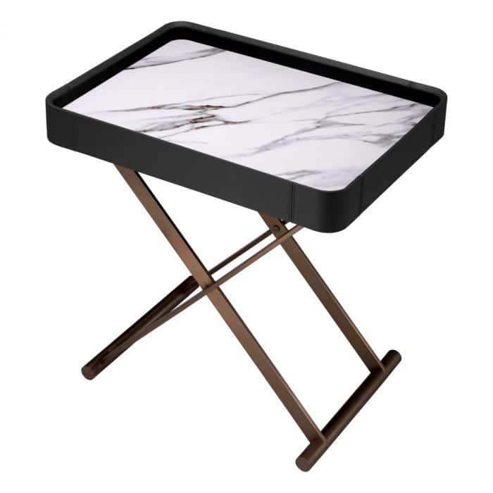 Här har vi härliga brickbordet Monarch, en smakfull och praktisk inredningsdetalj som smälter samman elegans med funktionalitet på ett sömlöst sätt. Den genuina svarta läderdetaljen och det hopfällbara stativet ger en praktisk dimension, medan den vita marmorliknande stenstoppen utstrålar en aura av lyx. Brickbord Monarch är inte bara ett praktiskt serveringsredskap utan också en dekorativ accent som förhöjer inredningen med sin förtrollande charm och tidlösa elegans.