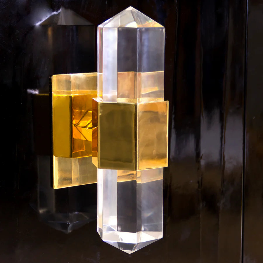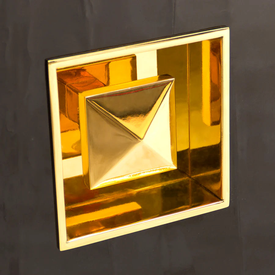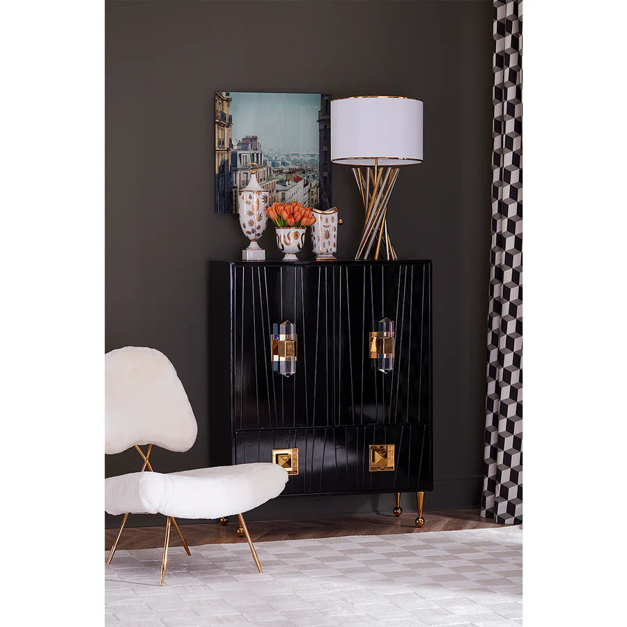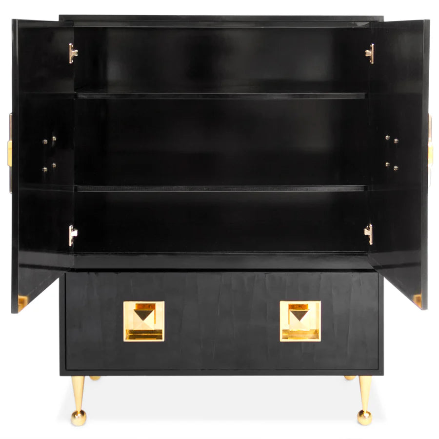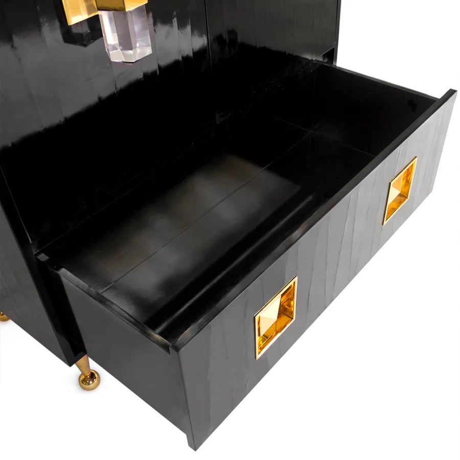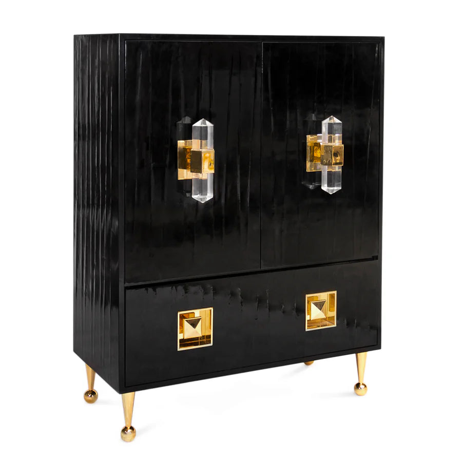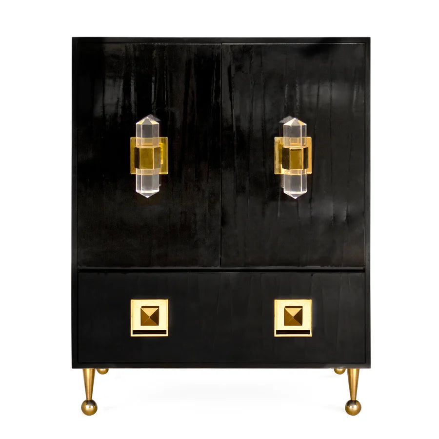 Hollywoodglamour möter Studio 54-hedonism i vårt svarta skåp / byrå Crawford från Jonathan Adler. Glänsande svart lack med en subtil vågstruktur vilar på våra signaturben i polerad mässing, formade som kulor och koner. Pricken över i:et – facetterade akrylhandtag som liknar gigantiska juveler. Perfekt för en stilsäker ungkarlslya eller en stjärnas penthouse.