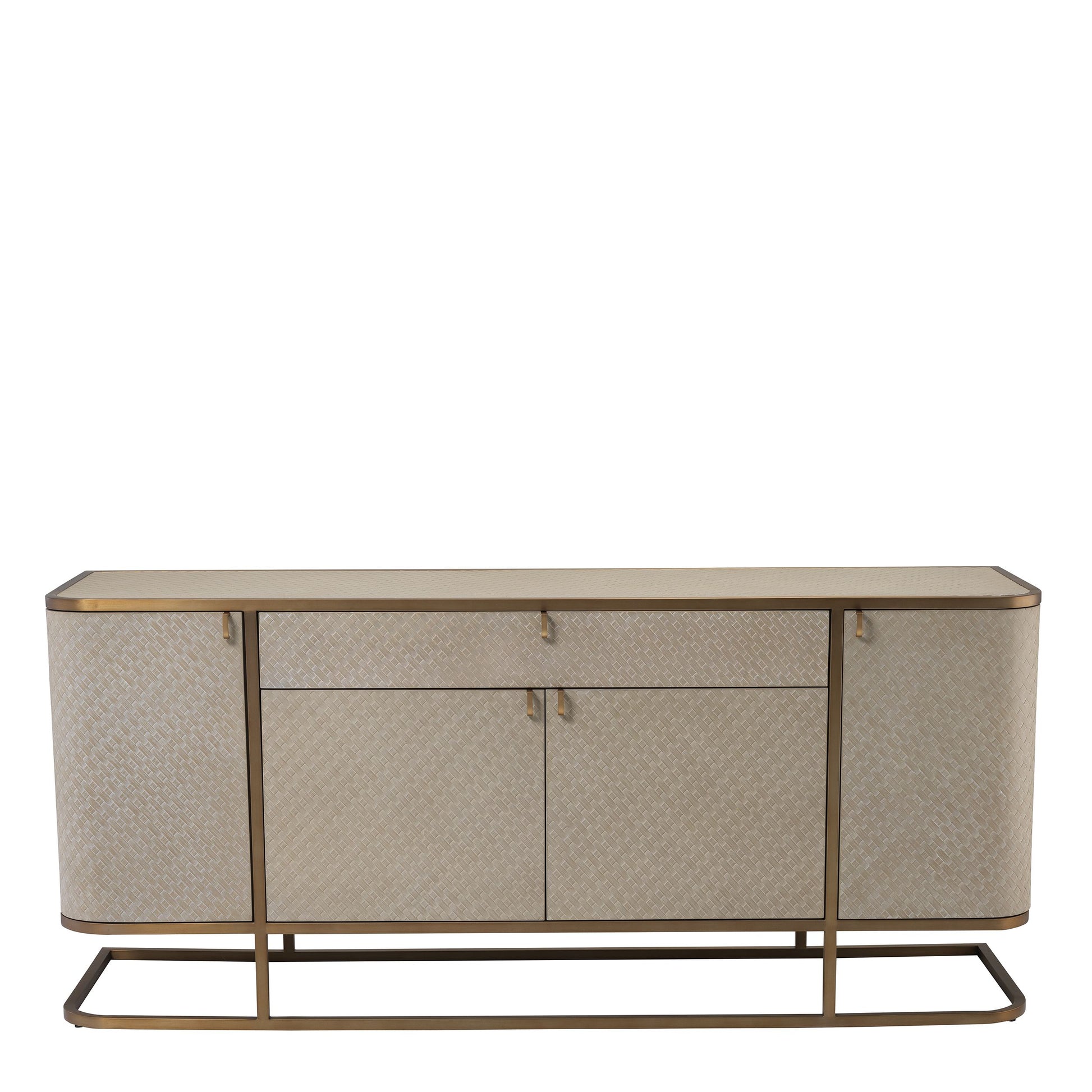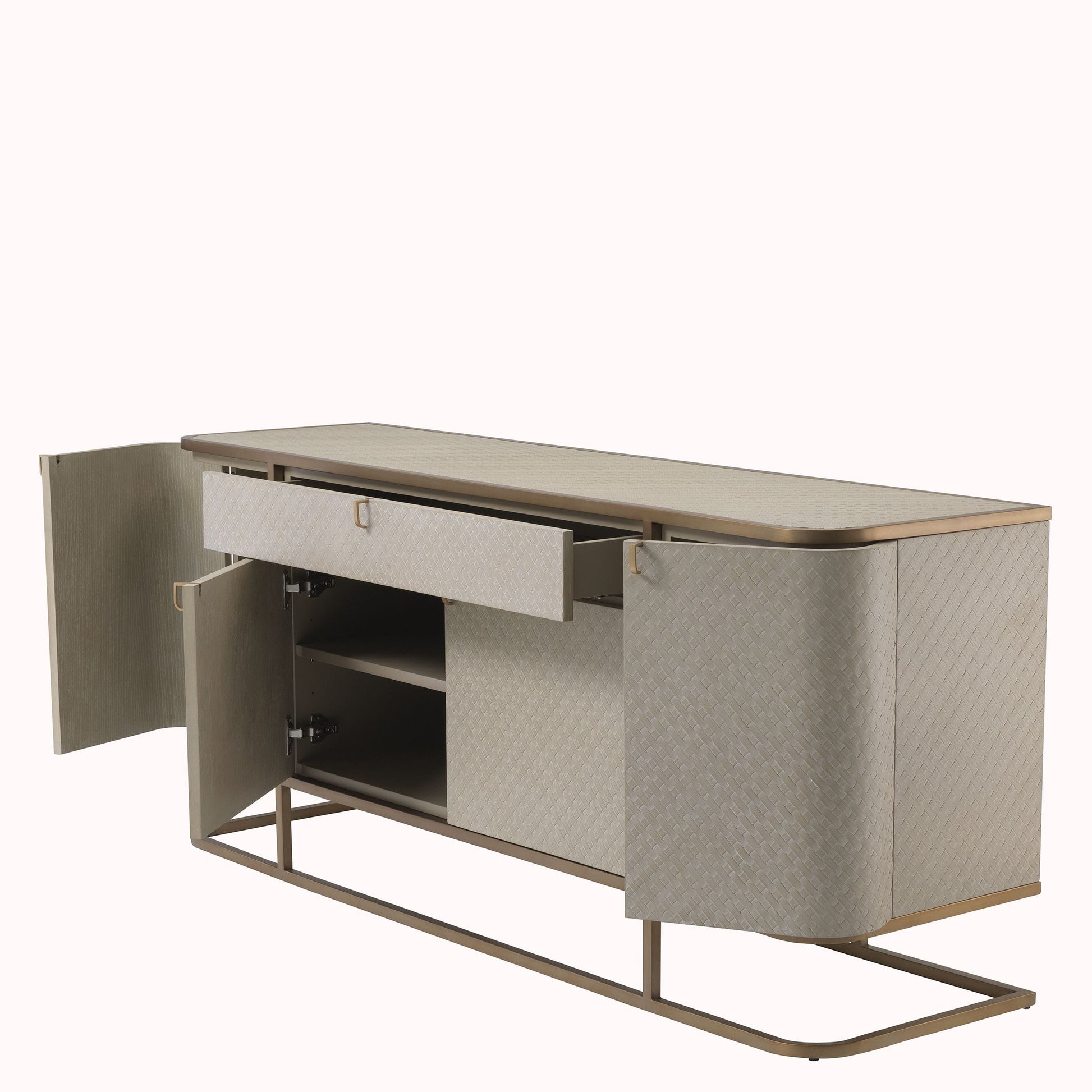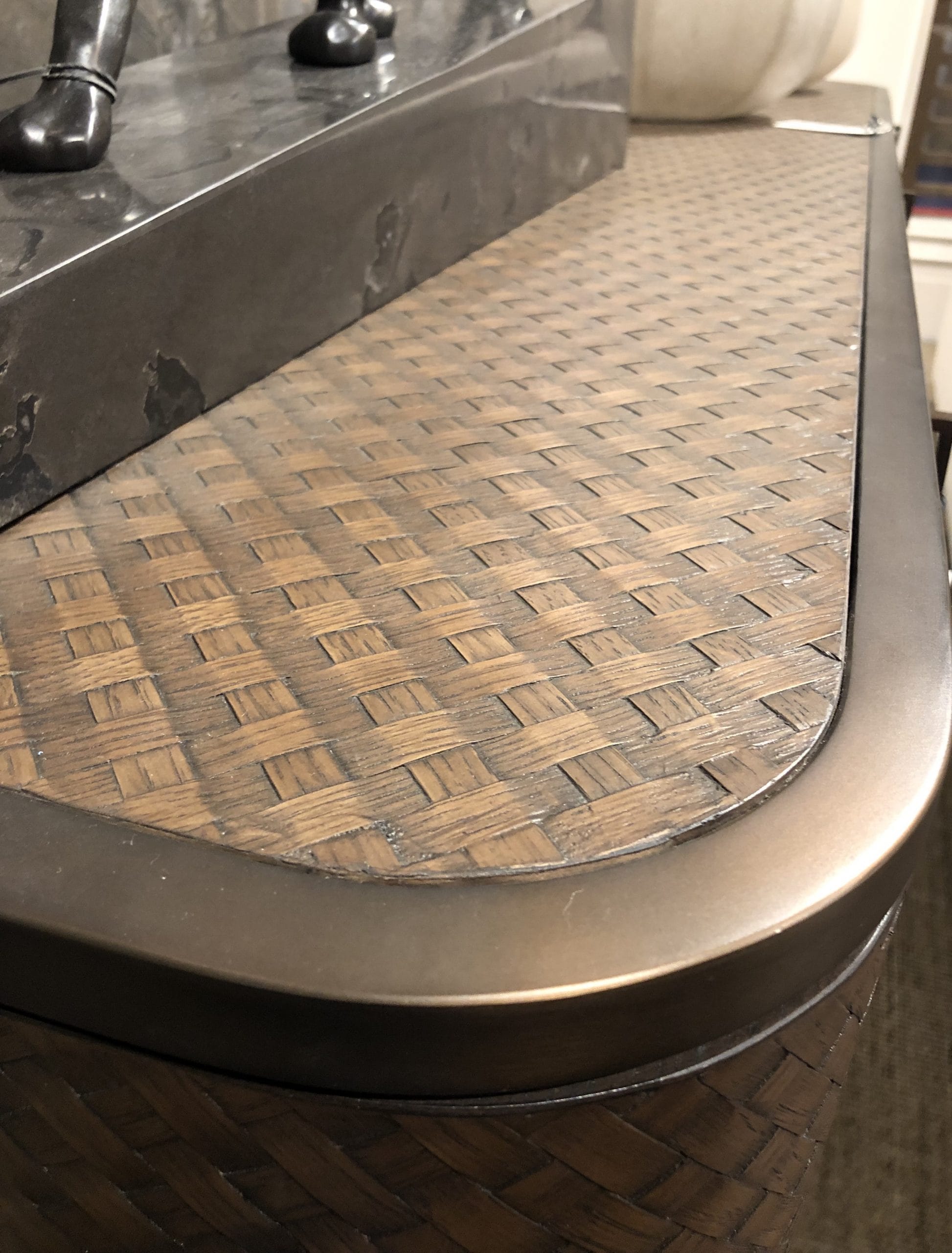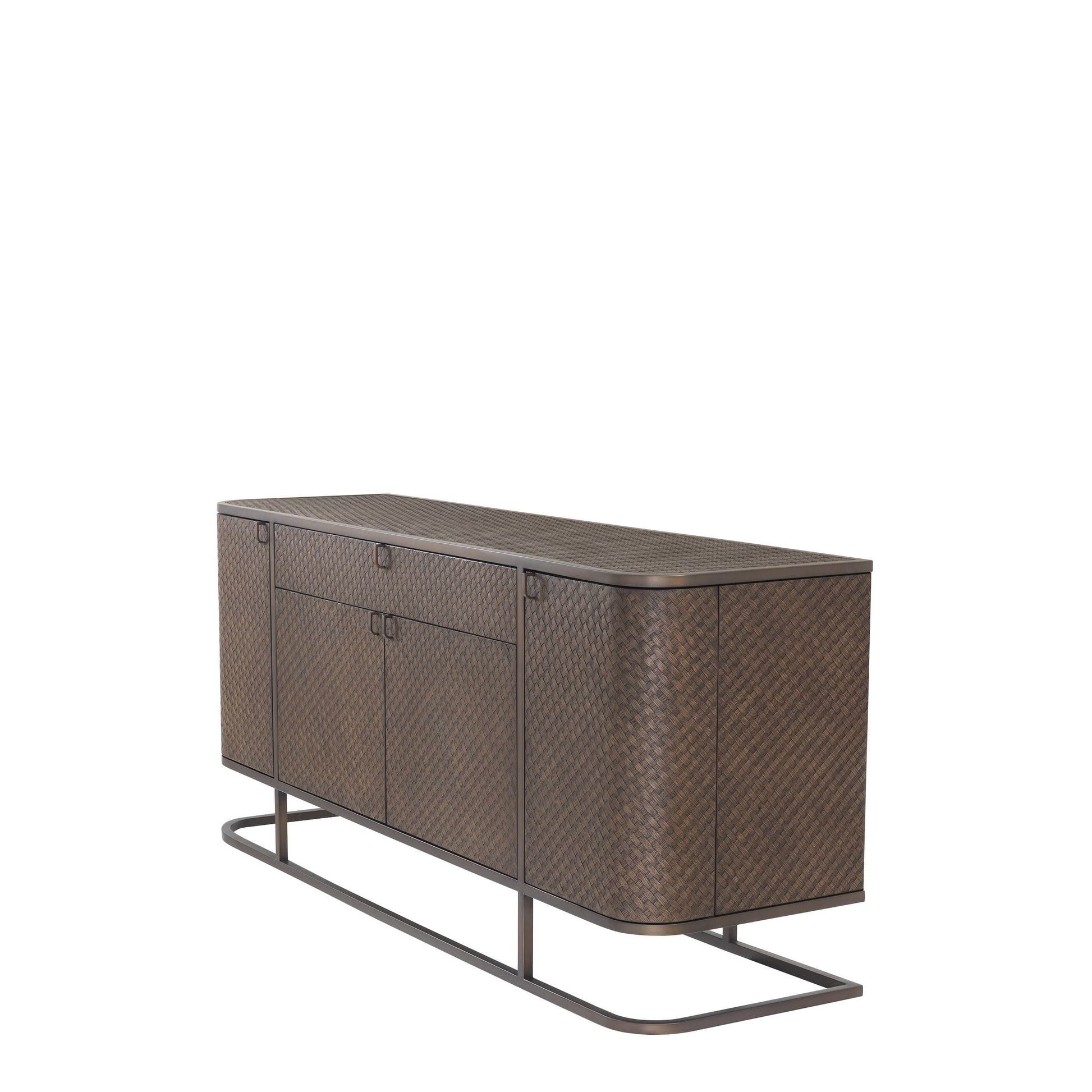 En härlig blandning av tyska designskolan Bauhaus och ett modernt utseende från mitten av århundradet, förgyller denna otrolig läckra byrå er inredning med en elegant ram av rostfritt stål i brons- eller borstad mässingsfinish, vävd ekfanér och massor av praktiskt förvaringsutrymme.