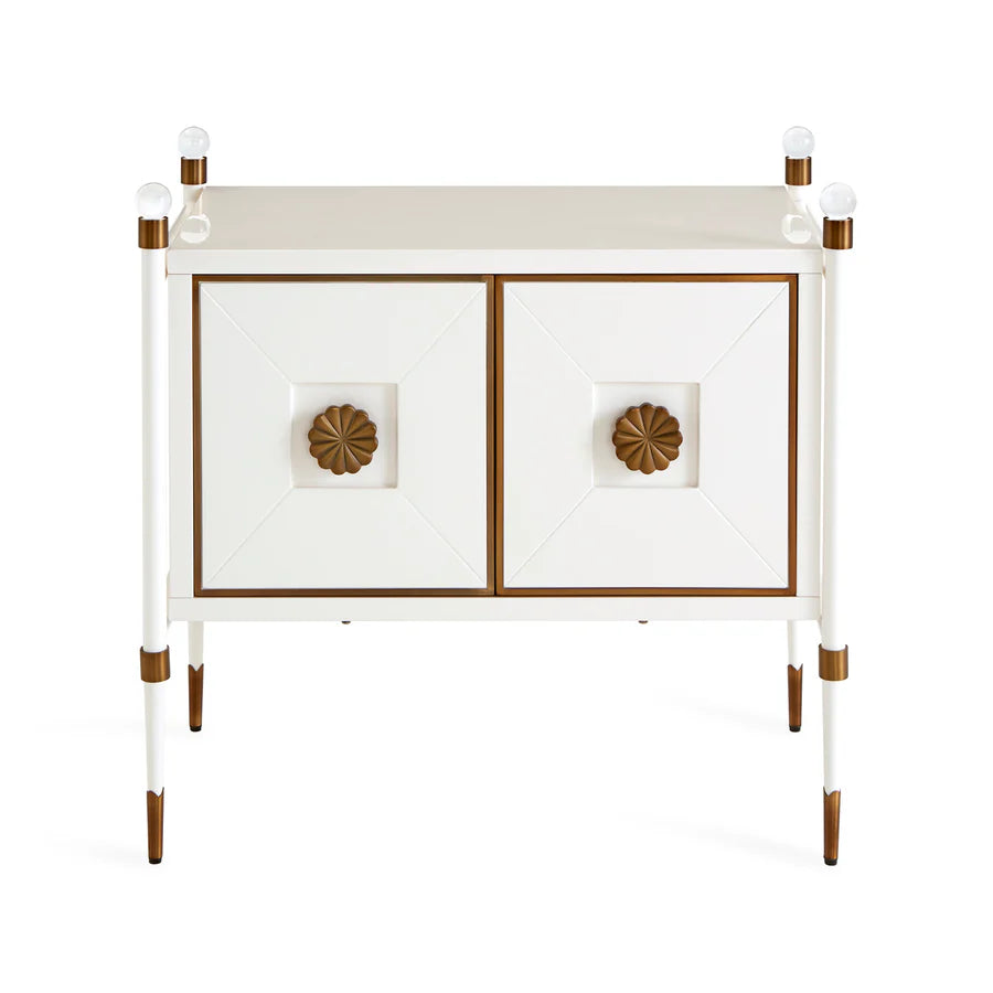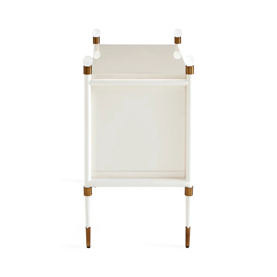 Jonathan Adlers Limited Edition Rider är en liten byrå med uppdaterad tolkning av fransk empirestil. Glänsande vit lack med antikbehandlade mässingsdetaljer och dramatiska dekorationer i akryl utstrålar modern glamour. Den höga, smala basen ger denna funktionella möbel en lätt och livfull känsla. Utrustad med en justerbar hylla och dubbeldörrar är den en elegant förvaringslösning för din entré, eller lika stilig som ett sängbord.