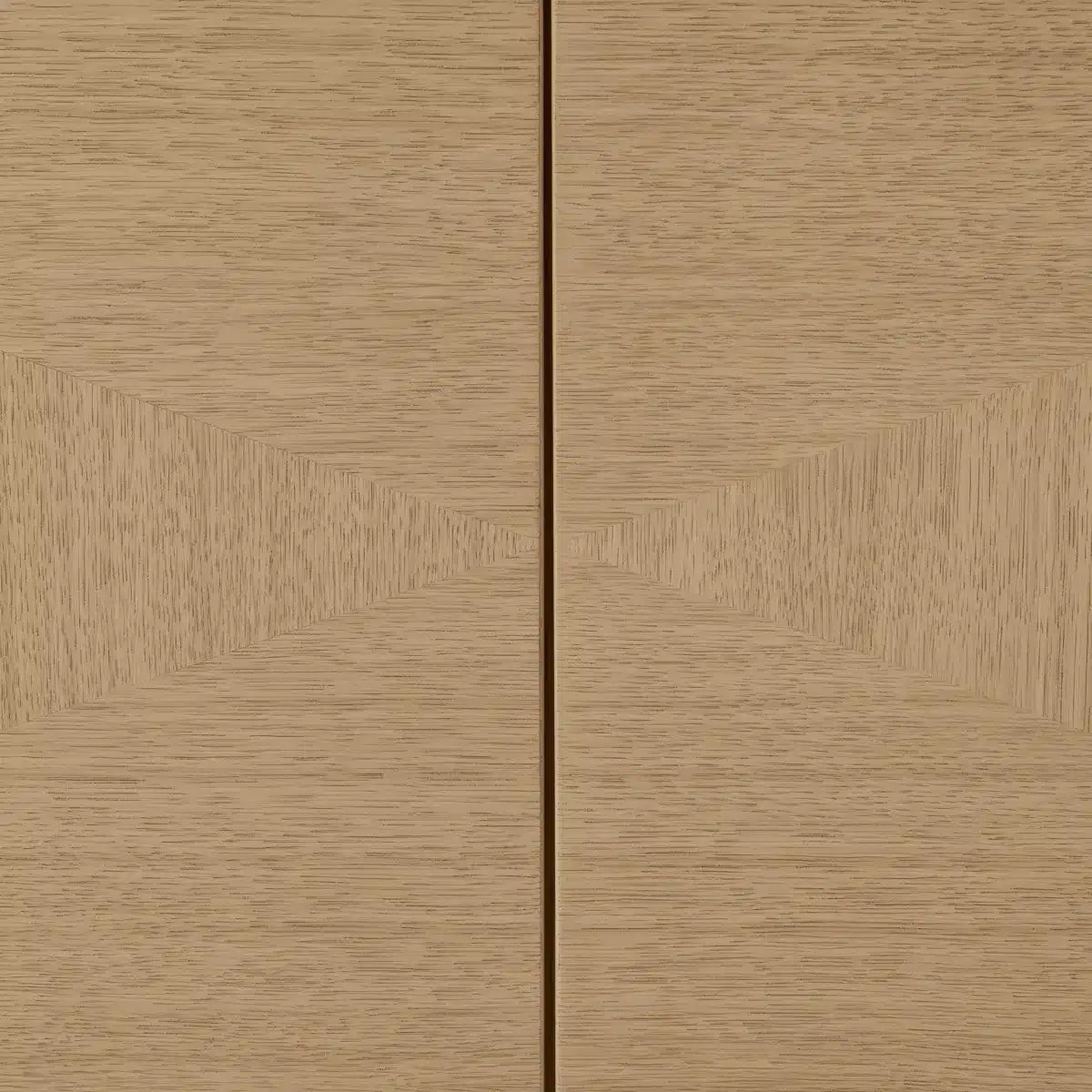 Klädd i en naturfärgad ekfanér, utstrålar byrån en subtil men kraftfull skönhet. Det intrikata mönstret som pryder dörrarna är noggrant designat för att fånga ljuset och skapa en förfinad textur som förhöjer rummets atmosfär. Ekens naturliga toner ger en känsla av harmoni och lugn, vilket gör att byrån smälter in i rummet samtidigt som den står ut med sin tidlösa design.
