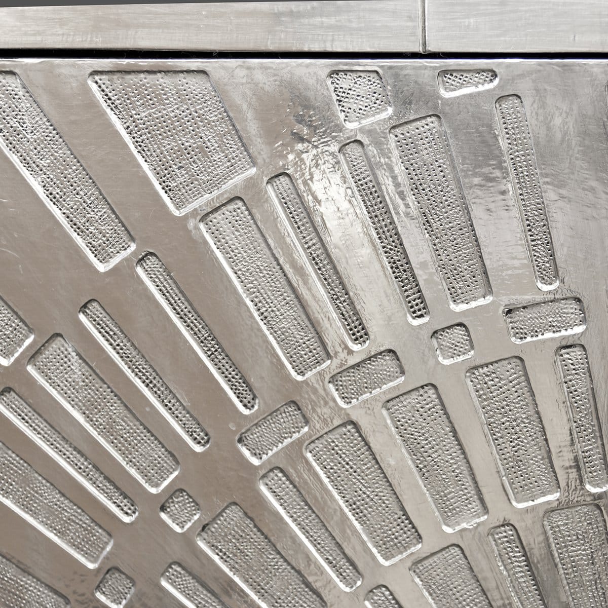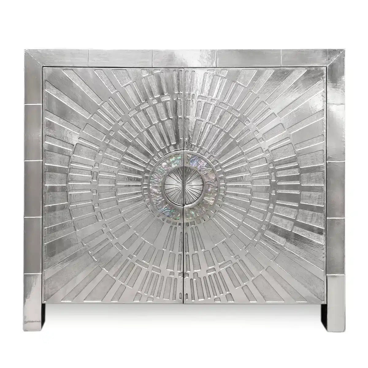 Our Talitha Cabinet features sheets of nickel-plated metal, hand-stamped into a modern starburst pattern routed onto solid wood. Each is capped with jewel-like door pulls featuring a luminous, hand-cut abalone shell mosaic.