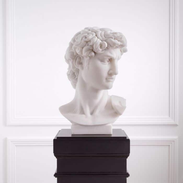 Bysten David är en imponerande skulptur skapat i ett enda stycke av marmor från Eichholtz som fångar essensen av klassisk skönhet och styrka. Denna magnifika skulptur är en hyllning till den ikoniska figuren av David, skulpterad med enastående detaljrikedom och precision. Här utstrålar skulpturen David en aura av tidlös elegans och historisk betydelse där Eichholtz läckert kombinerar blankpolerad med matt marmor. Placerad på en piedestal eller en bokhylla blir denna skulptur en enastående prydnad och samtalsämne i vilket rum som helst. Med sin imponerande närvaro och skönhet är byst David ett måste för alla som uppskattar konst och historia.