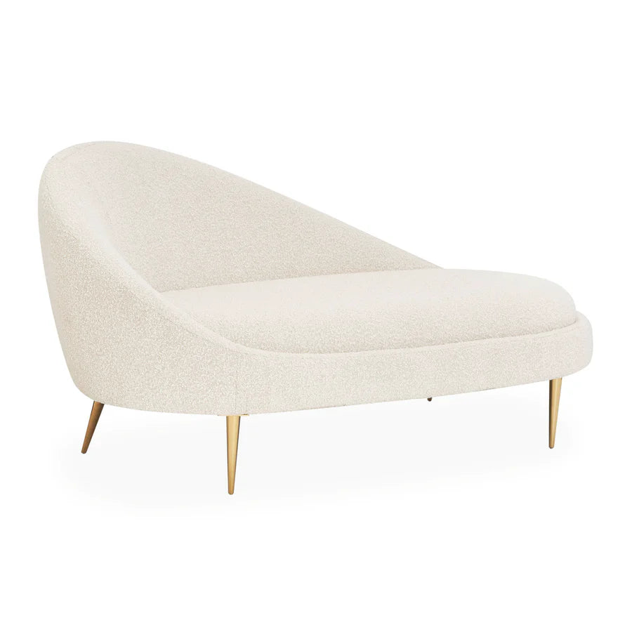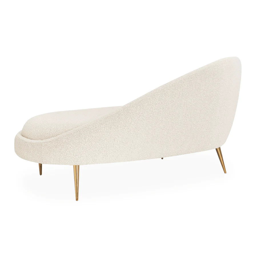 De stilrena mässingsbenen ger en subtil glans och sofistikerad kontrast till boucléns varma, naturliga ton. Den välvda designen omsluter dig på ett sätt som känns inbjudande och lyxigt, vilket gör denna schäslong till en plats för både avkoppling och stilfull representation.