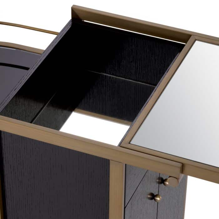 Dina vackra glas och favoritdrycker förtjänar att visas upp på denna oumbärliga vagn med svart ekfanér och detaljer i borstad mässingsfinish. Den spegelblanka glastoppen kan vändas för enkel åtkomst till den övre avdelningen. Två halvrunda hyllor och ett skåp erbjuder gott om plats för visning och förvaring. Skåpet är tillgängligt från framsidan med dörrar. Hjul gör det enkelt att transportera denna vagn genom hemmet eller restaurangen.