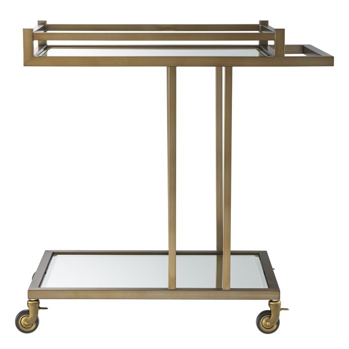 Ge ditt hem lite Hollywood-glamour med drinkvagn Beverly Hills. Med en ram i rostfritt stål och en finish i borstad mässing som har två hyllor av fasade spegelglas, är denna charmiga barvagn ett fint tillskott för att servera drinkar och cocktails. Den är mycket lätt att flytta på grund av sina länkhjul och eleganta handtag.