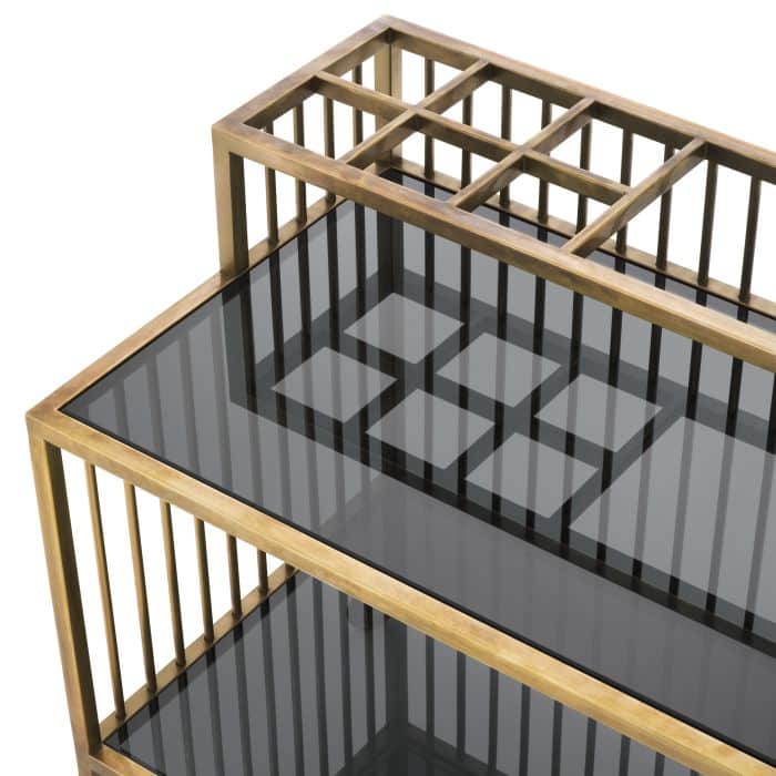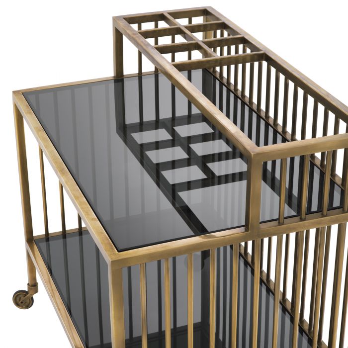 Drinkvagn Rutherford kombinerar design med funktion på ett ypperligt sätt. Vintage mässingsfinish och rökfärgat glas i kombination med smidiga hjul och praktiska fack till dina flaskor gör denna serveringsvagn mycket mångsidig och en god vän för den som tycker om att blanda cocktails med stil.