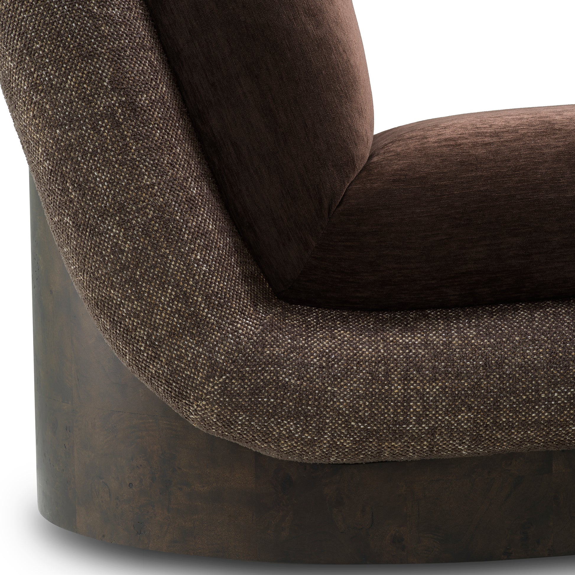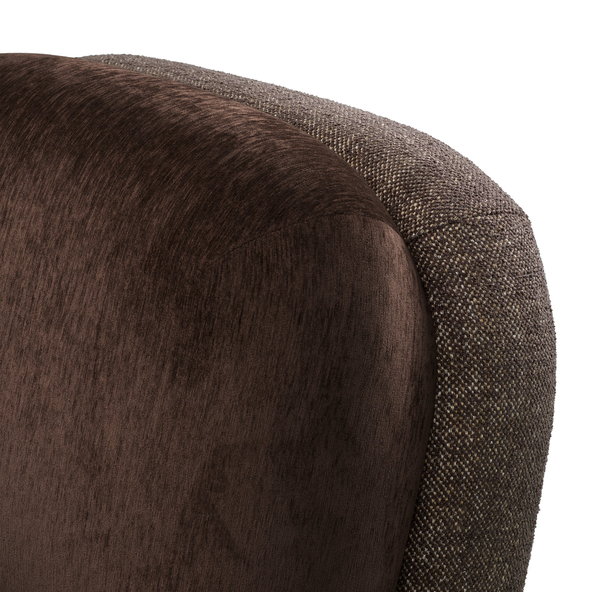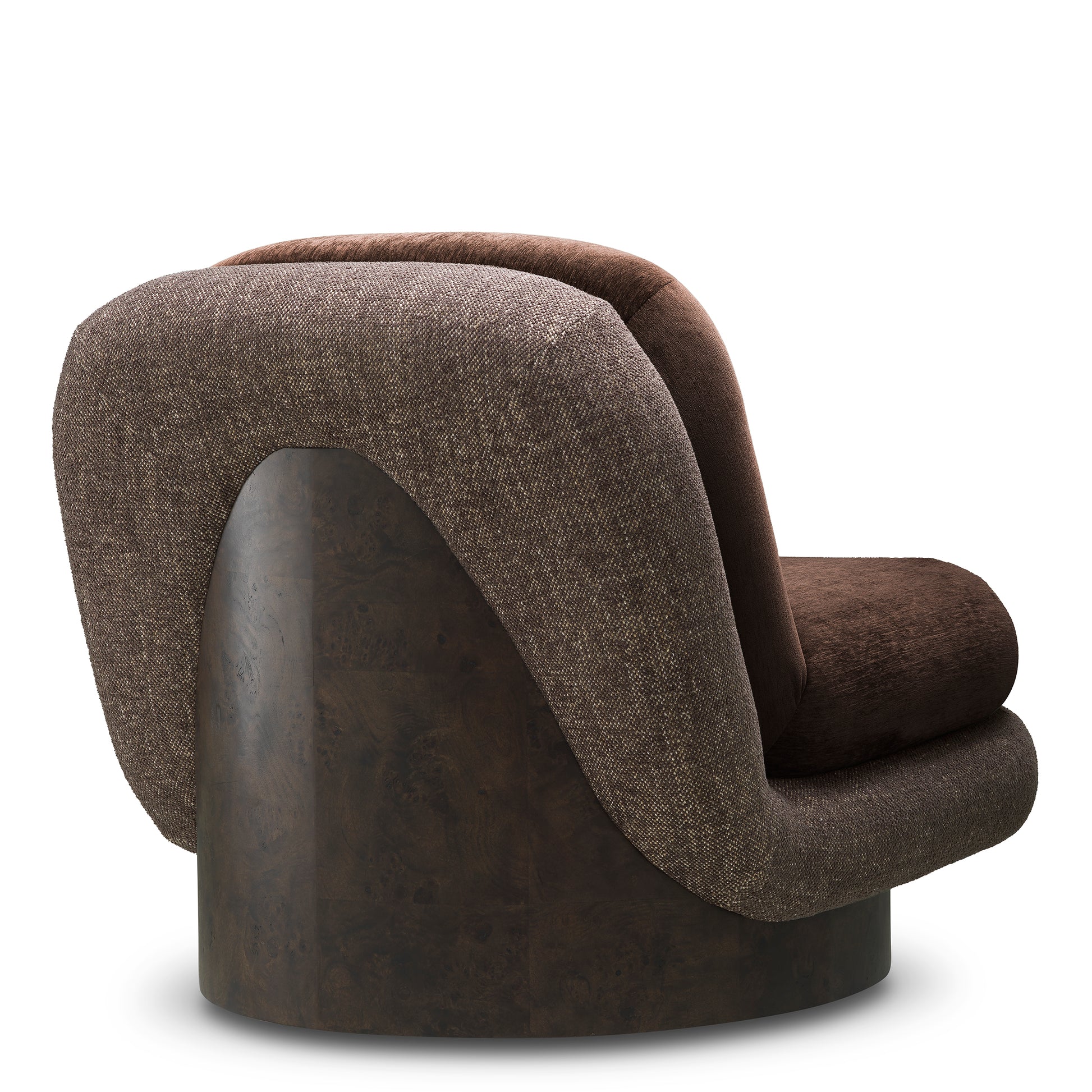 Fåtöljen Galiano från Eichholtz kombinerar tyger i Bayard och Renato-bruna nyanser och vilar på en elegant snurrbas i mörkt brunt fanér. Designen harmoniserar varma jordtoner med modern form och erbjuder en sofistikerad sittupplevelse som förenar taktil komfort med visuellt tilltalande estetik.