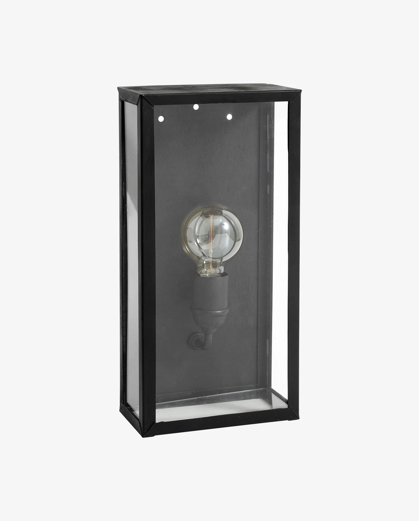 EOS utomhusvägglampa från Nordal är tillverkad av mässing med en elegant svart pulverlackering. Lampan har glas på sidorna och i botten, vilket skapar ett vackert ljusflöde.