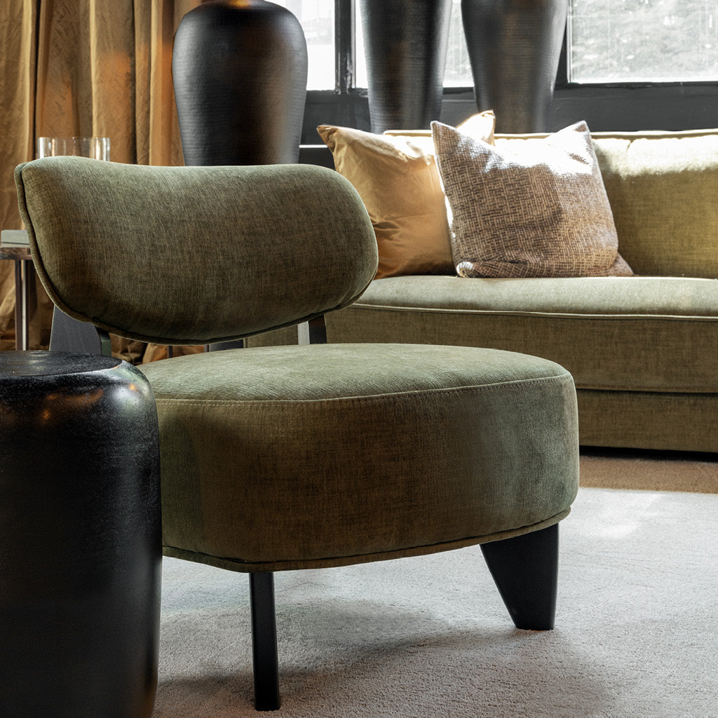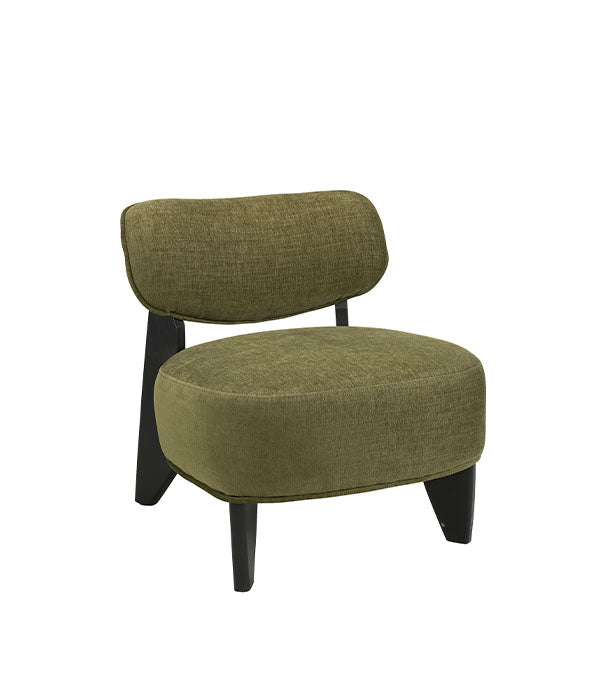 Cadiz är en elegant och stilren loungefåtölj som med sin genomtänkta design kombinerar komfort och estetik på ett imponerande sätt. Den rundade formgivningen i sits och rygg kläs i en behaglig, grön textil i färgen Hailey Army som tillför en mjuk och inbjudande känsla. Detta kontrasteras smakfullt av de raka linjerna och benen i svartbetsad ek, vilket ger möbeln ett modernt och sofistikerat uttryck.