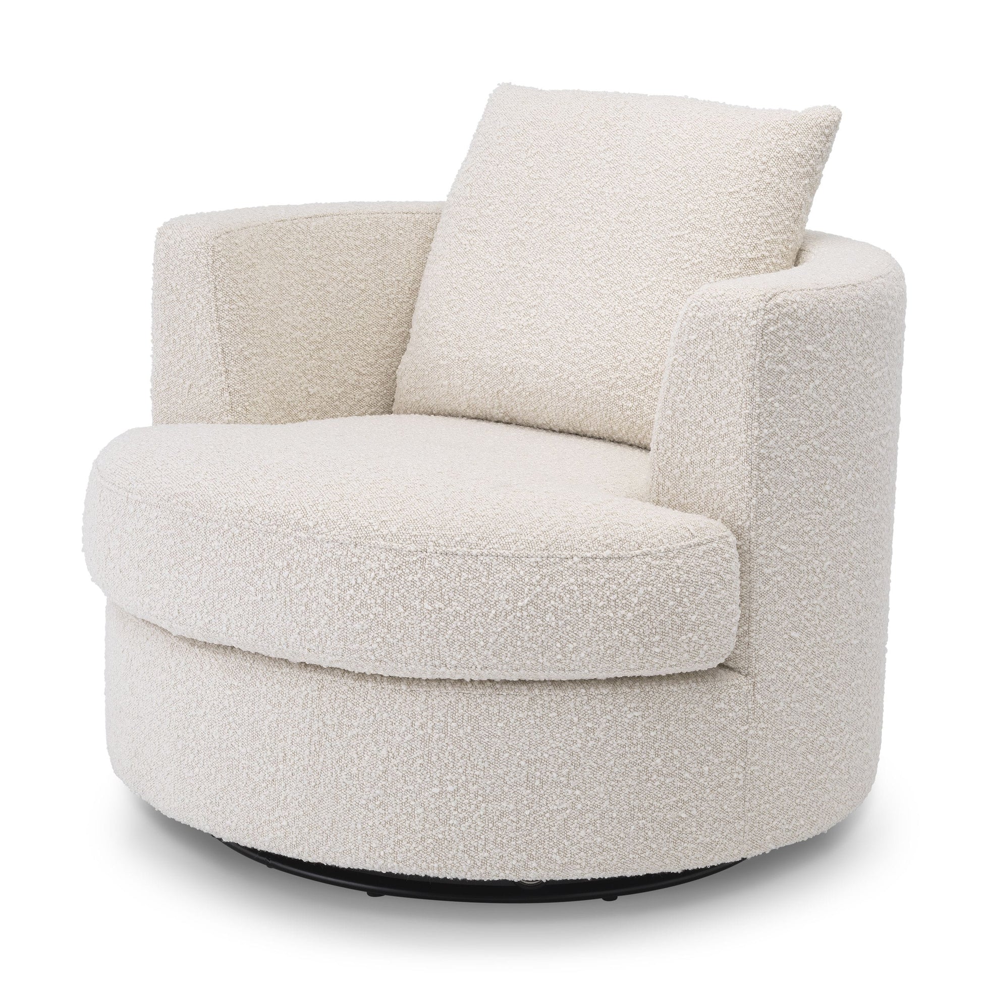 Den runda snurrfåtöljen Felix är ett designmästerverk med runda former och härlig stil. Denna riktigt underbara fåtölj är skickligt klädd i benvit bouclé som ger en mycket ombonad och exklusiv känsla. Den perfekt vadderade sitsen och den lösa ryggdynan ger optimal komfort och en bekväm plats att koppla av på.