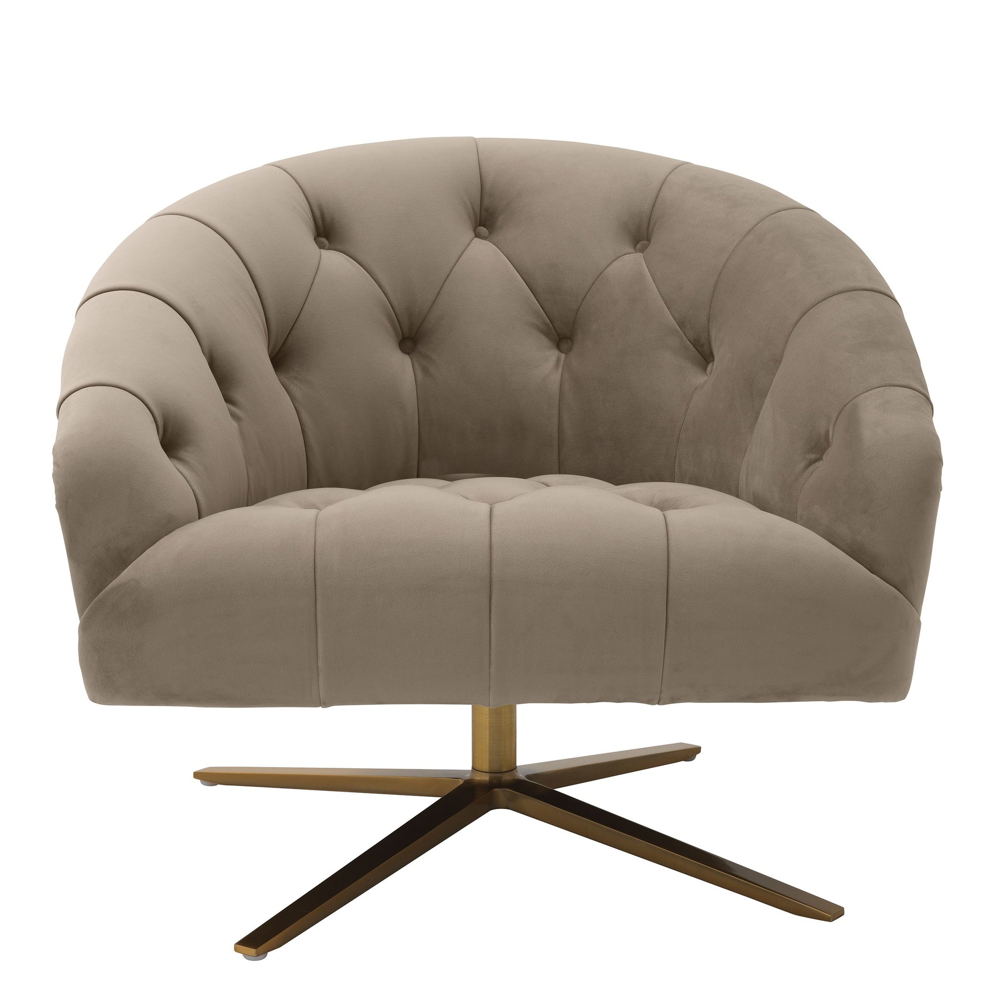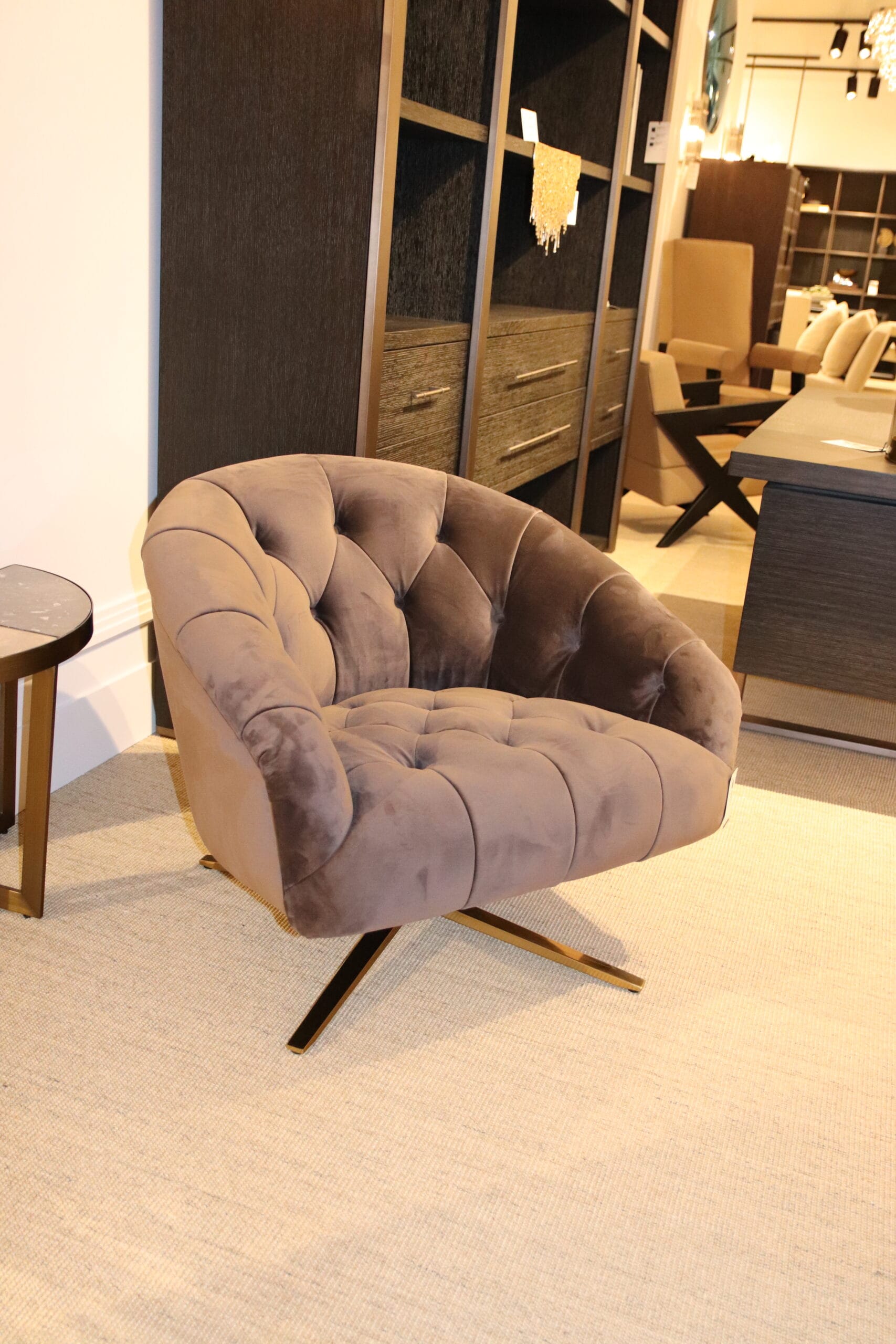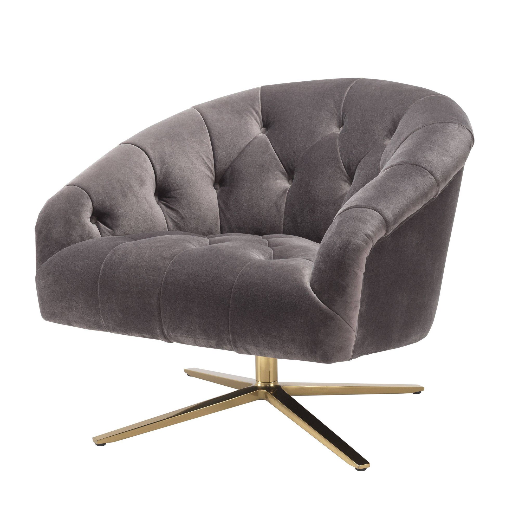 Sjunk ner i denna härliga snurrfåtölj och njut av sittkomforten och härlig retrodesign i modern tappning. Denna stol är skickligt utformad och har en tuftad klädsel i grå eller grenige sammet och en robust ram med en korsformad vridbar bas i borstad mässingsfinish. En inredningsdetalj som garanterat blir mycket omtyckt!