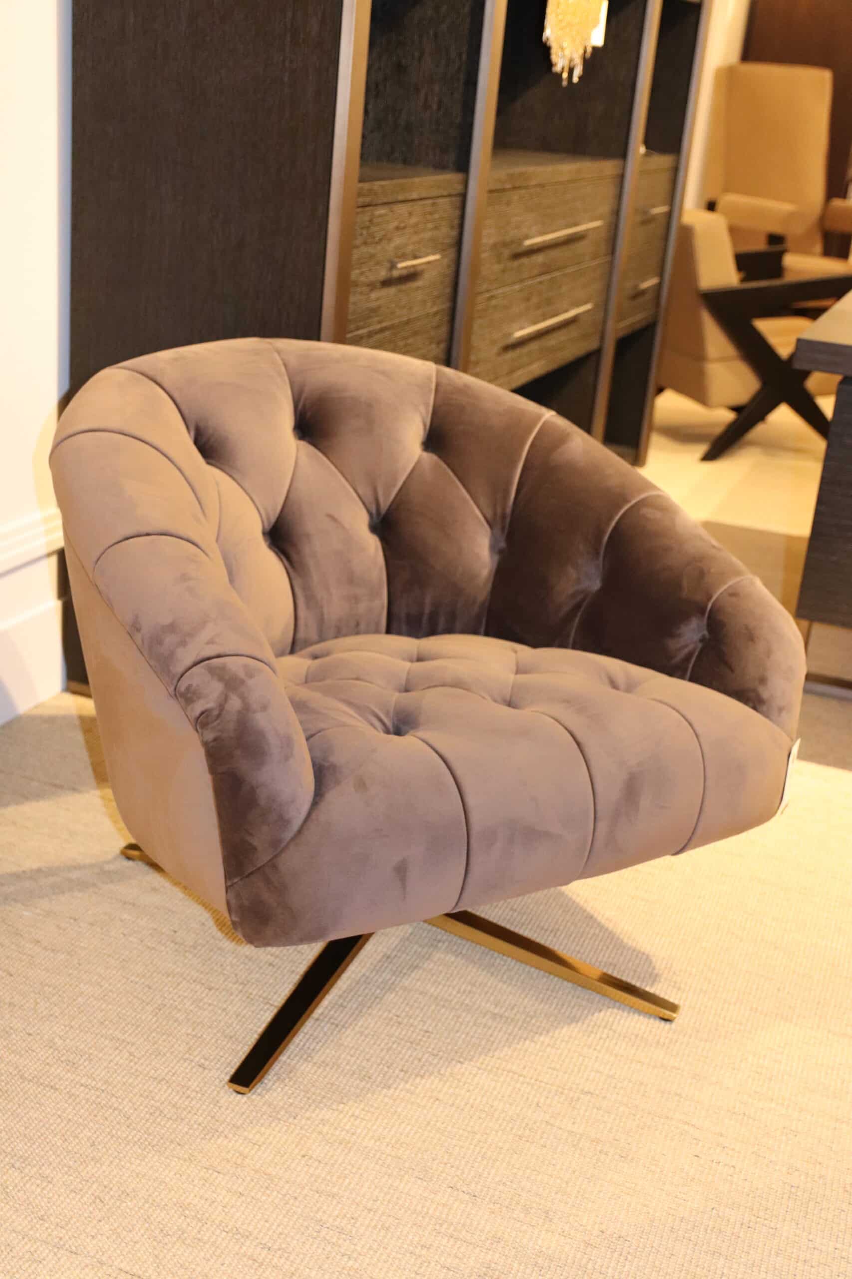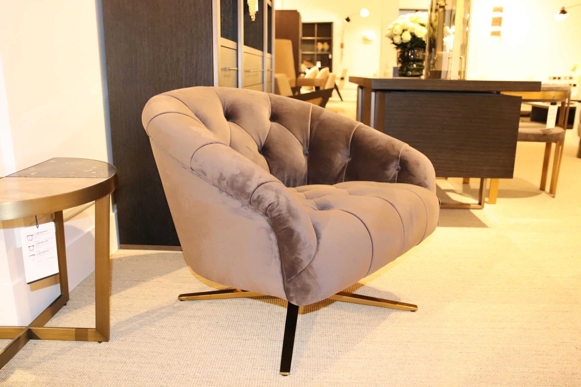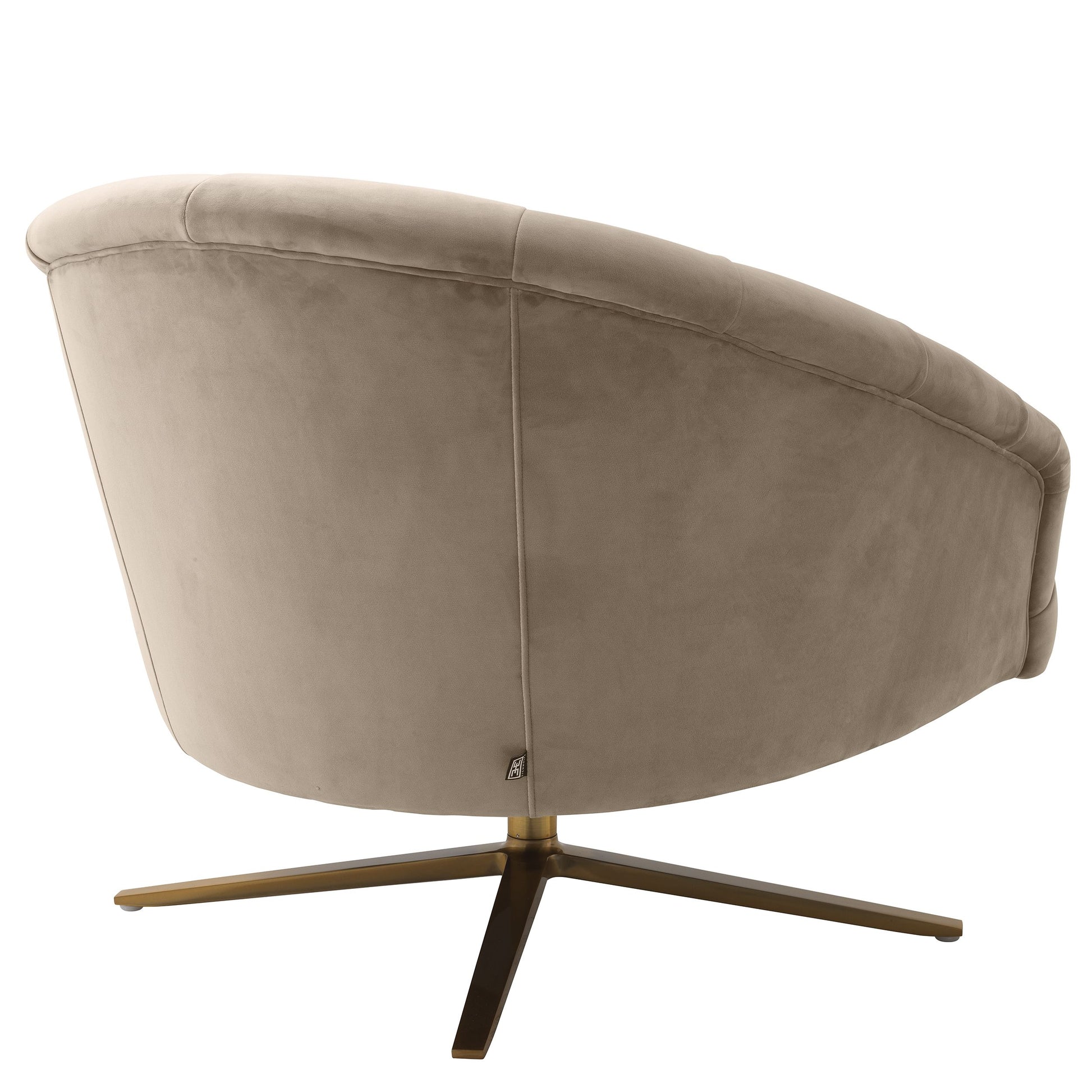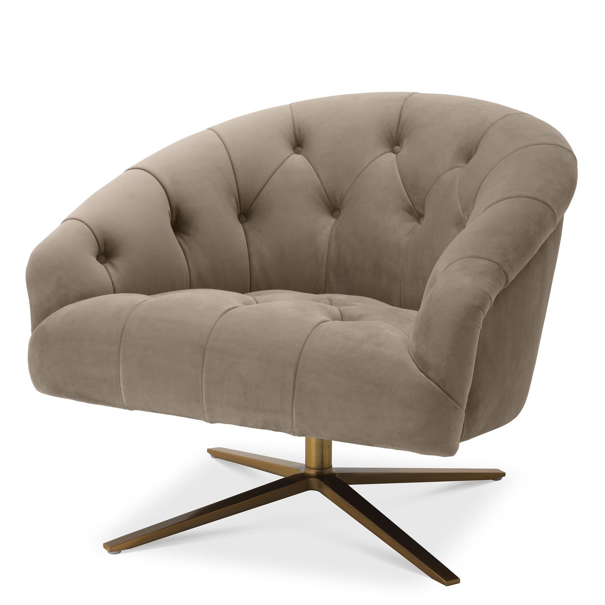 Sjunk ner i denna härliga snurrfåtölj och njut av sittkomforten och härlig retrodesign i modern tappning. Denna stol är skickligt utformad och har en tuftad klädsel i grå eller grenige sammet och en robust ram med en korsformad vridbar bas i borstad mässingsfinish. En inredningsdetalj som garanterat blir mycket omtyckt!