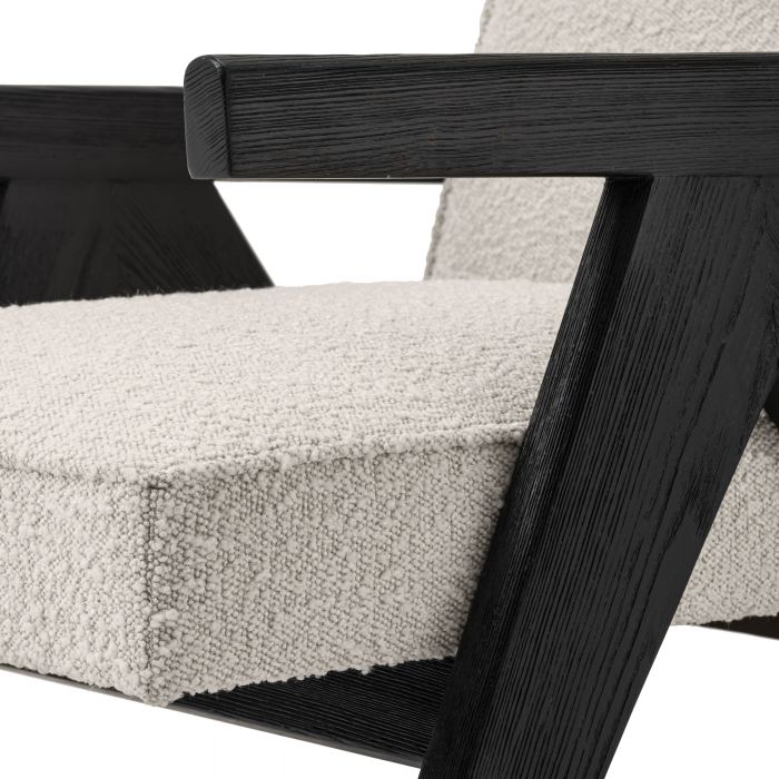 Fåtölj Greta kombinerar modern vintagelook med ultimat sittkomfort. Tillverkad av massivt trä som fått svart finish, bjuder denna vackra fåtölj på V-formade ben som är karakteristiska för de berömda minimalistiska mönster från 1950- och 1960-talen. Sits, ryggstöd och utmärkande armstöd är klädda i off-white Bouclétyg.