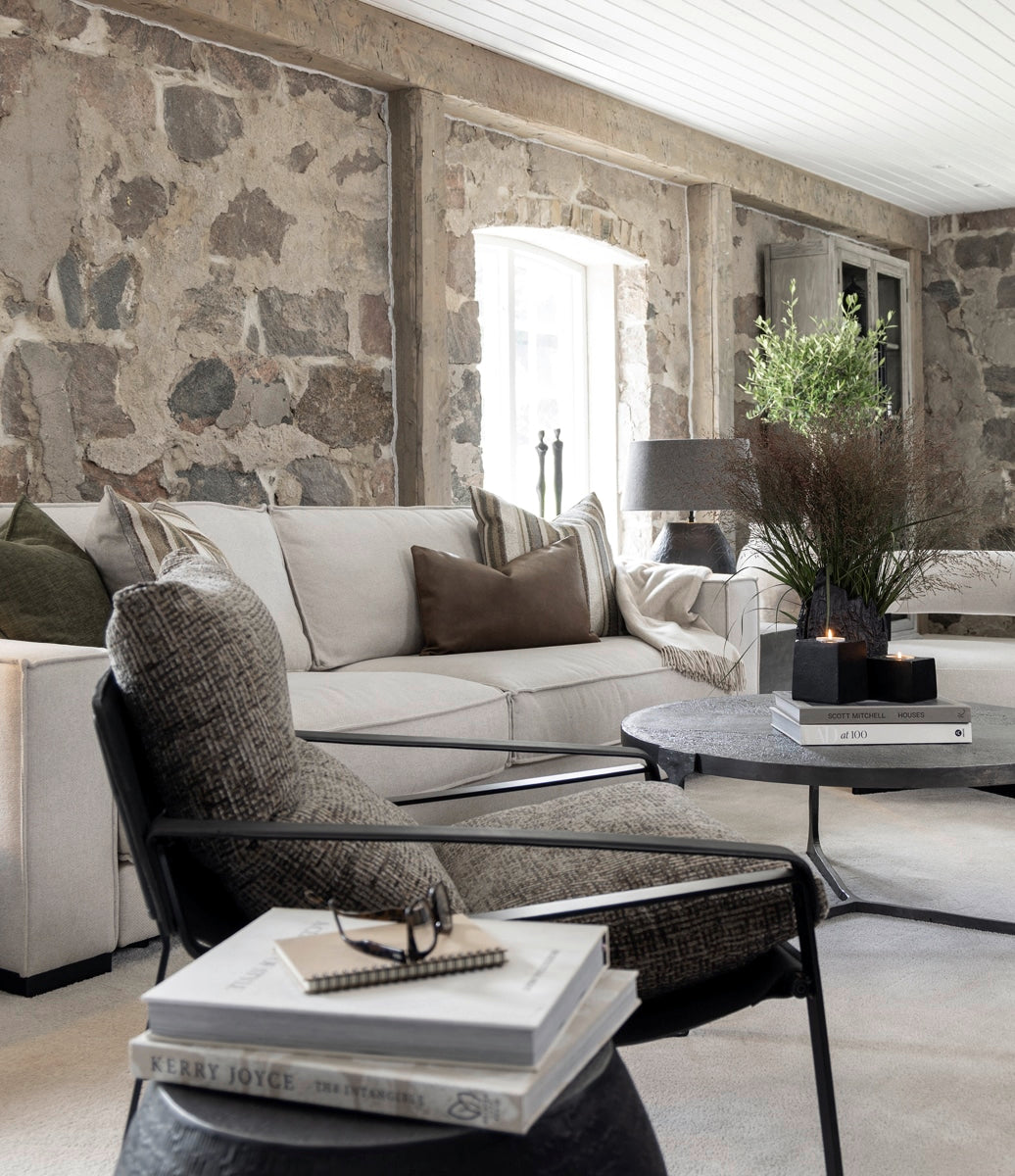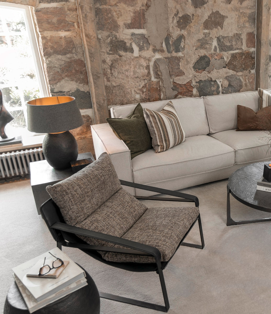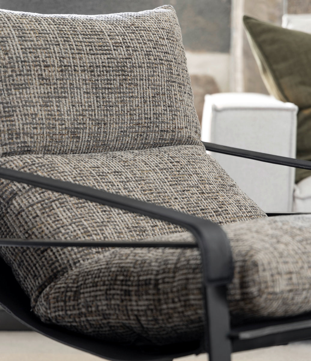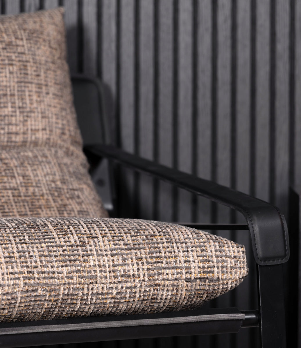 Hillsdale i tyget Chanel Taupe är en stilsäker loungefåtölj med svart metallbas som passar in i det moderna hemmet.