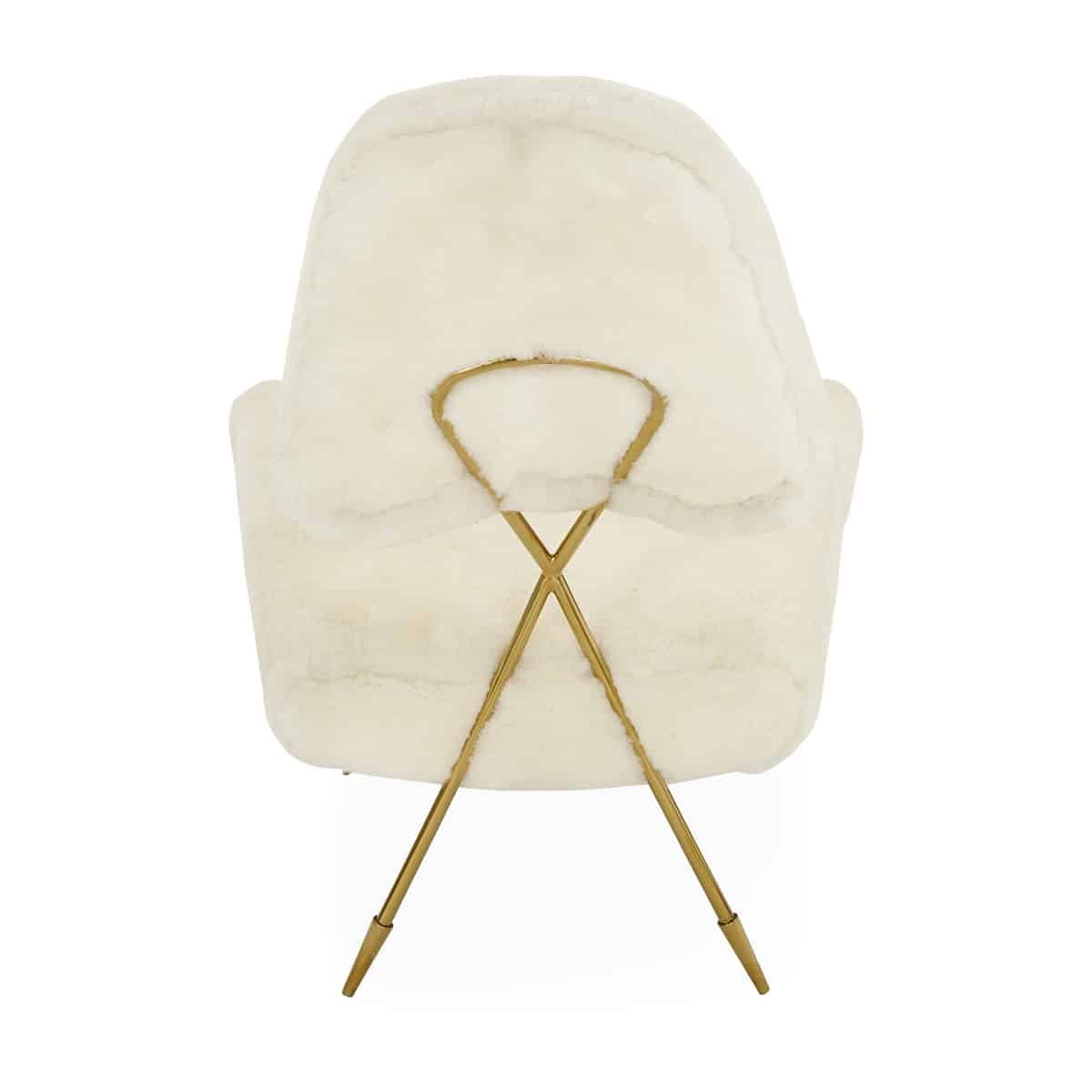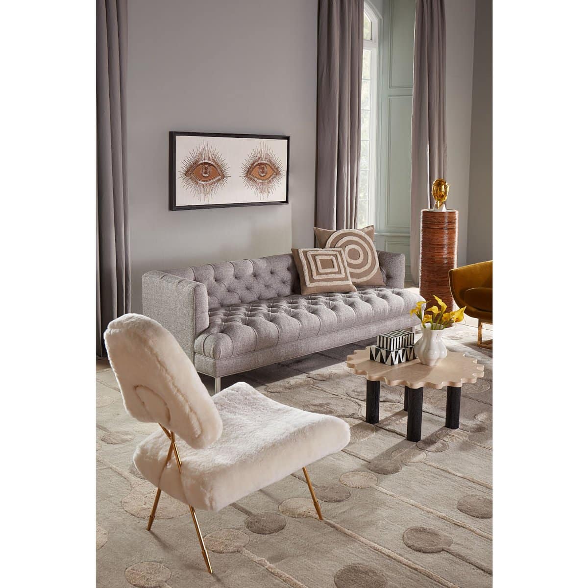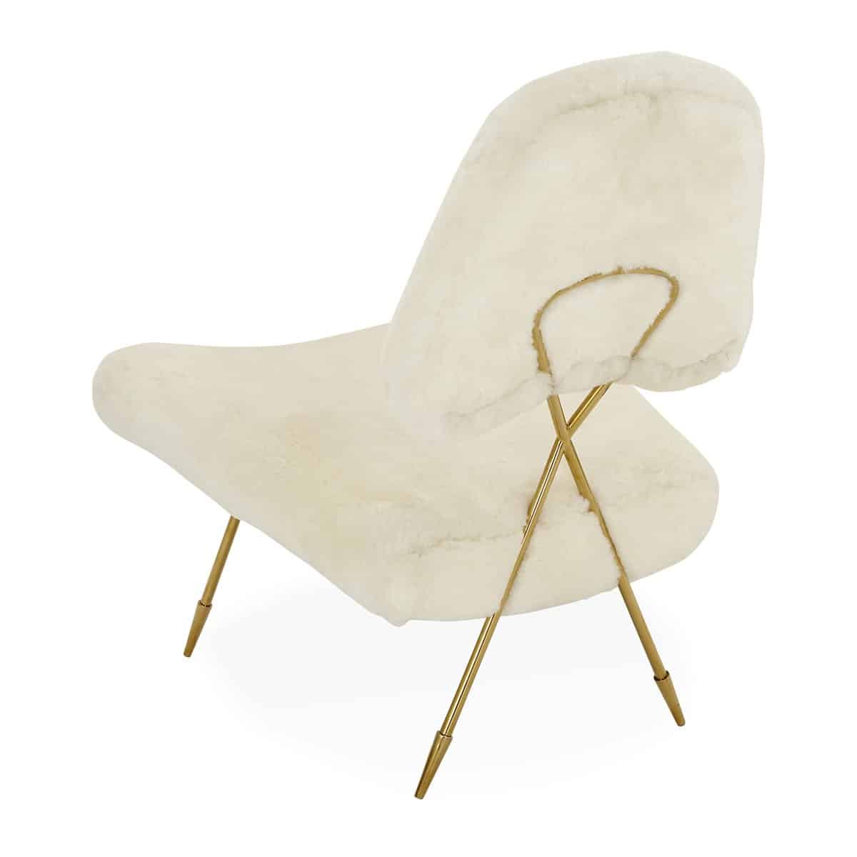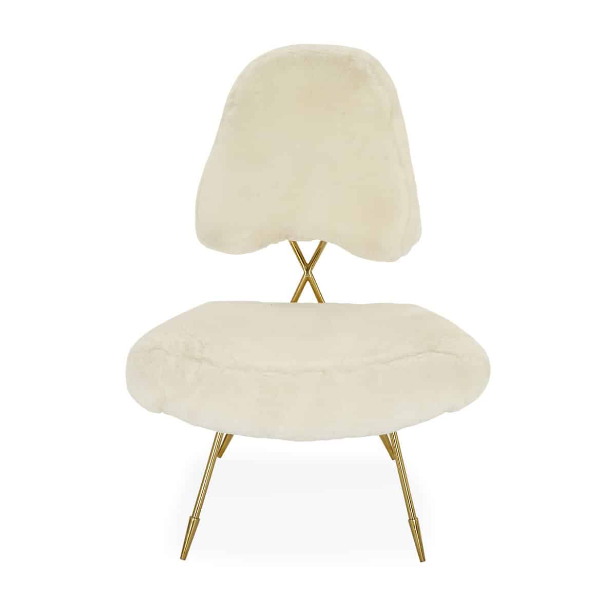 A gleaming brass frame with an intriguing crisscross back and our signature sabots cradles a softly curved seat and sculptural back. But don’t be fooled by the graceful frame—the Maxime Lounge Chair is very comfy. Available in chic and sumptuous shearling or light and luxe celadon velvet. Fab in a glamorous boudoir or living room.