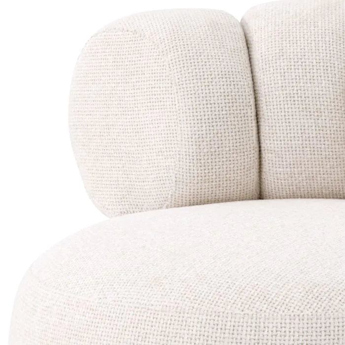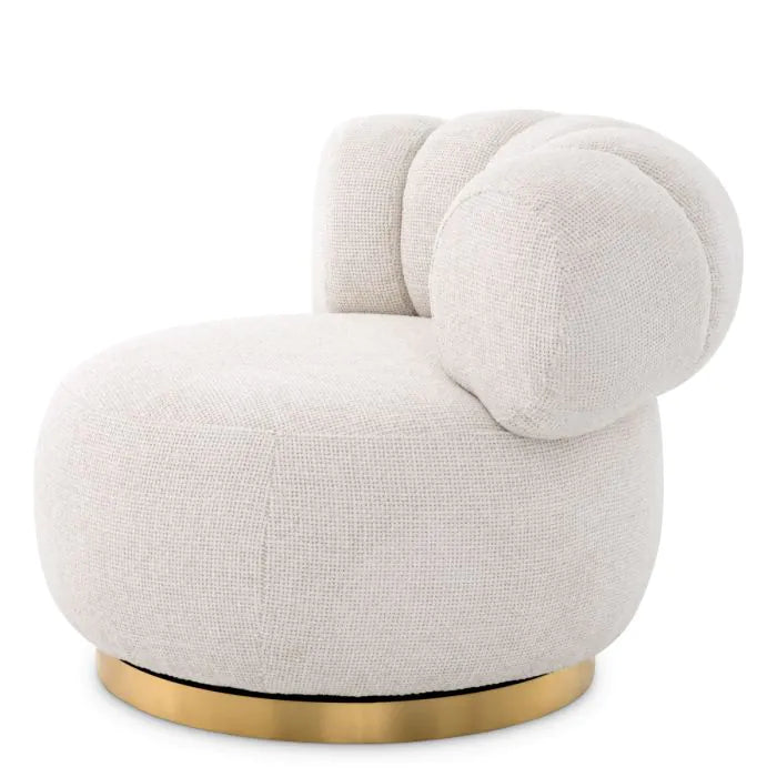Denna imponerande fåtölj är klädd i exklusivt, texturerat Lyssa off-white tyg som ger en mjuk och elegant känsla. Dess generösa, omslutande form skapar en inbjudande sittupplevelse, perfekt för avkoppling. Den borstad mässingsfärgade svängbara basen ger både flexibilitet och en lyxig touch, vilket gör att du enkelt kan rotera och röra dig smidigt.