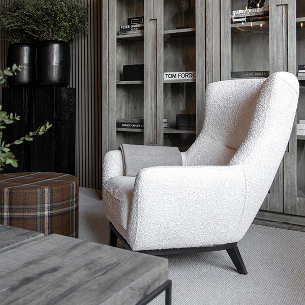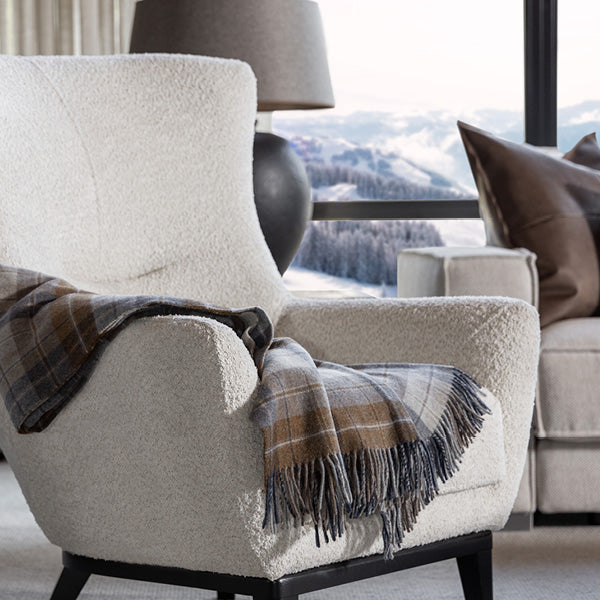 Fåtölj Russel är en möbel som elegant kombinerar sofistikerad design med exceptionell komfort. Med sin höga, skålade rygg erbjuder fåtöljen både inbjudande och ergonomiskt stöd, vilket gör den perfekt för avkoppling i vardagsrummet, biblioteket eller hemmakontoret.