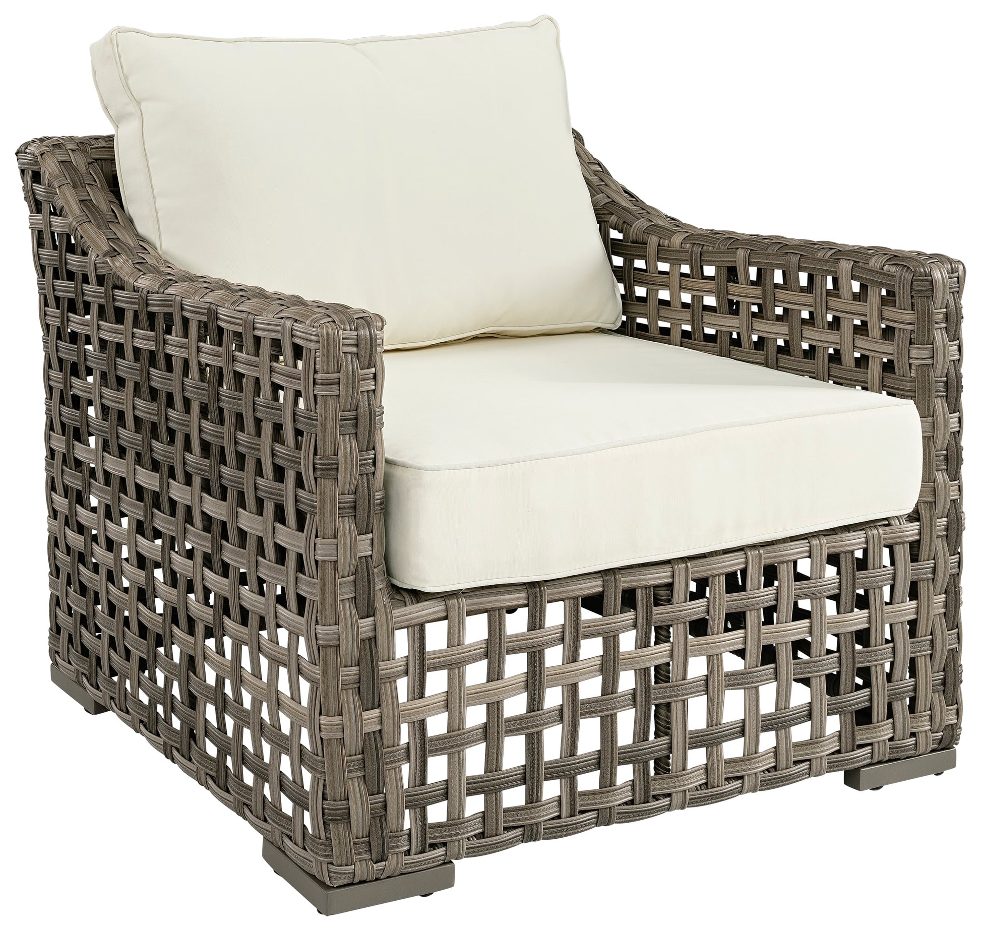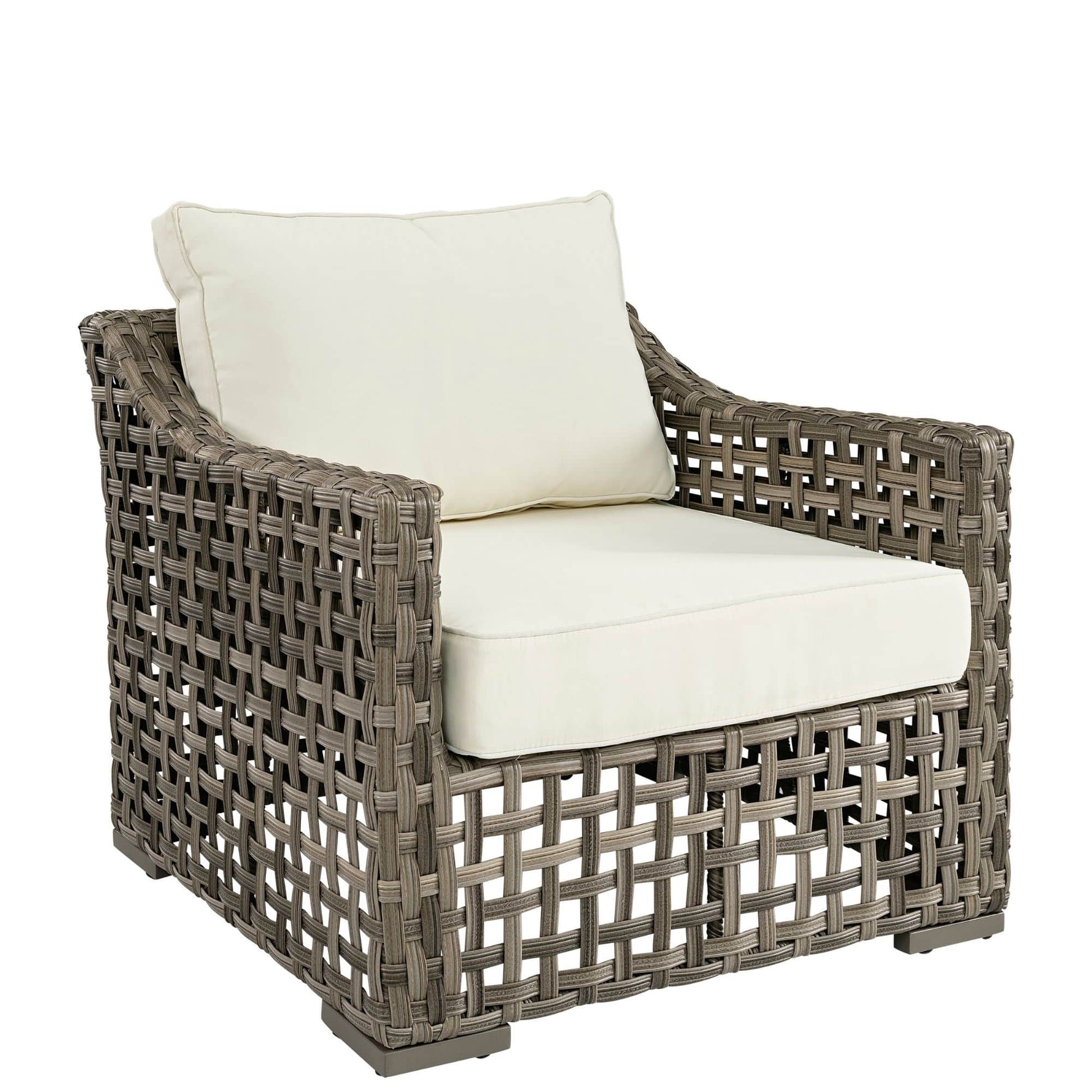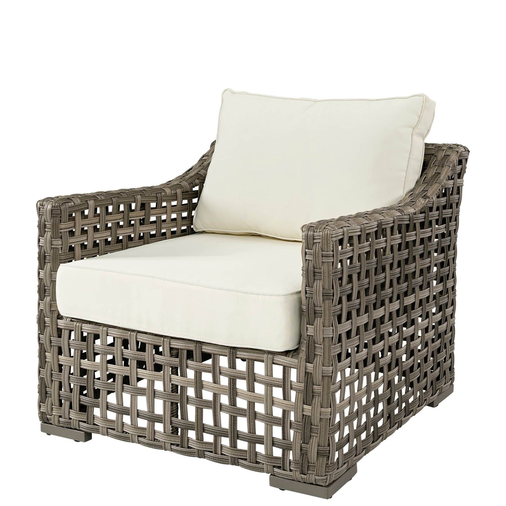 Snygg och rejäl fåtölj med en stomme i aluminium och högkvalitativ konstrotting. Dynorna har avtagbar klädsel och fåtöljen utstrålar luft, elegans och exklusiv känsla.