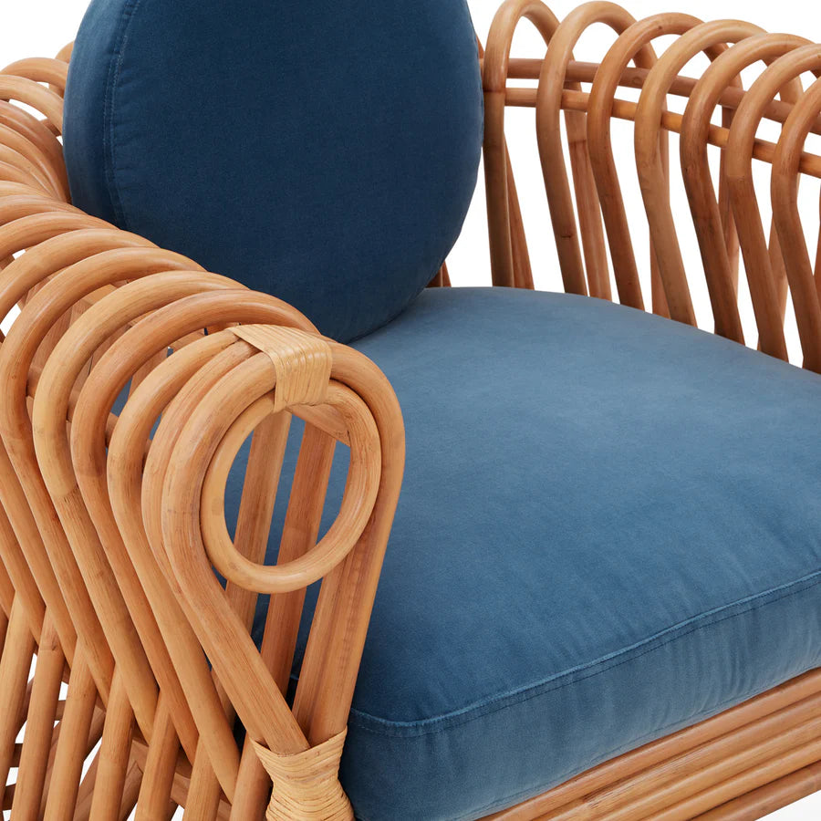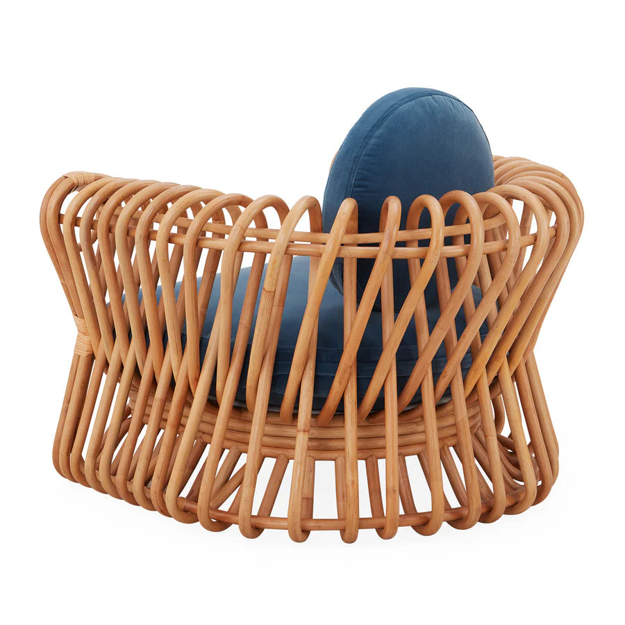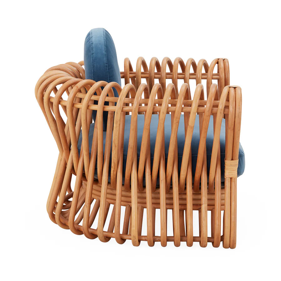 Tillverkad av naturliga material och blå sammetskuddar ger Adlers nya fåtölj St Tropez en känsla av kustnära elegans i staden eller hög modeklass på landet. Stommen blötläggs i vatten, handlindas och fästs på en böljande ram, och avslutas sedan med en satinerad lack som ger en lyxig glans. Den tjocka sitsen och den runda ryggkudden är klädda i en frisk nyans lika uppfriskande som dess namne.
