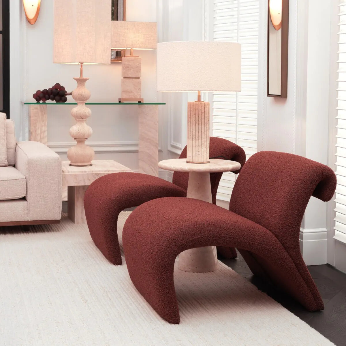 Fåtöljen Vignola från Eichholtz är klädd i slitstarkt rouge bouclé-tyg och ger en känsla av förfining till ditt vardagsrum. Sjunk djupt ner i Vignola och känn dig omfamnad av ryggstödet. Vignolas moderna estetik återspeglar en känsla av enkelhet och elegans, och dess unika moderna design ger en tidlös look i många år framöver.
