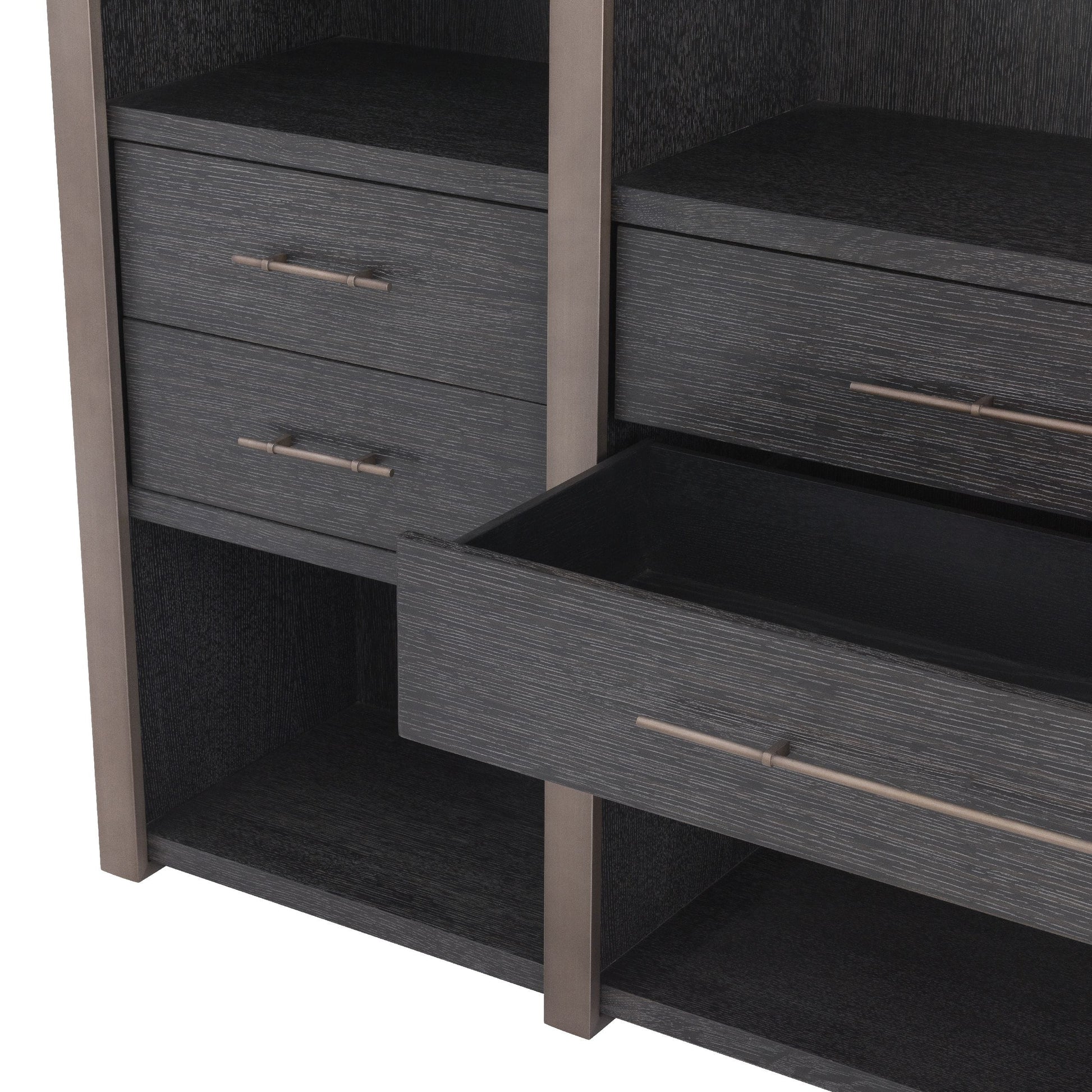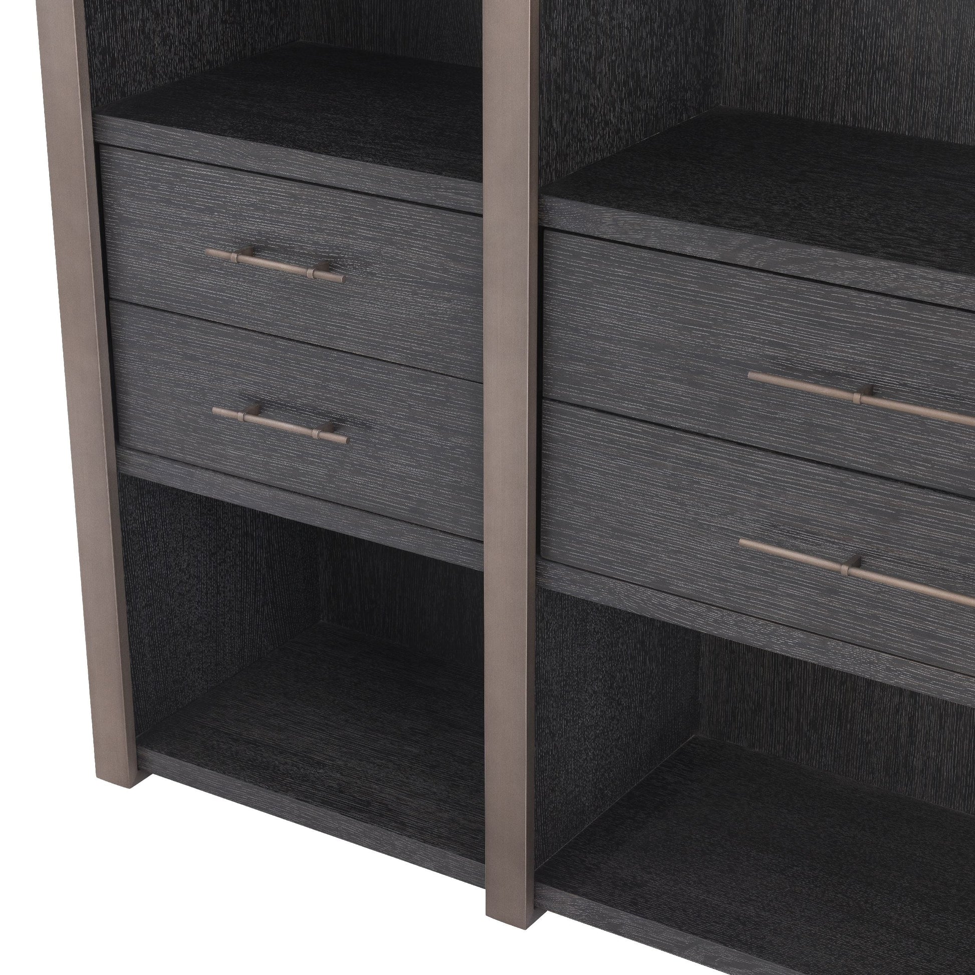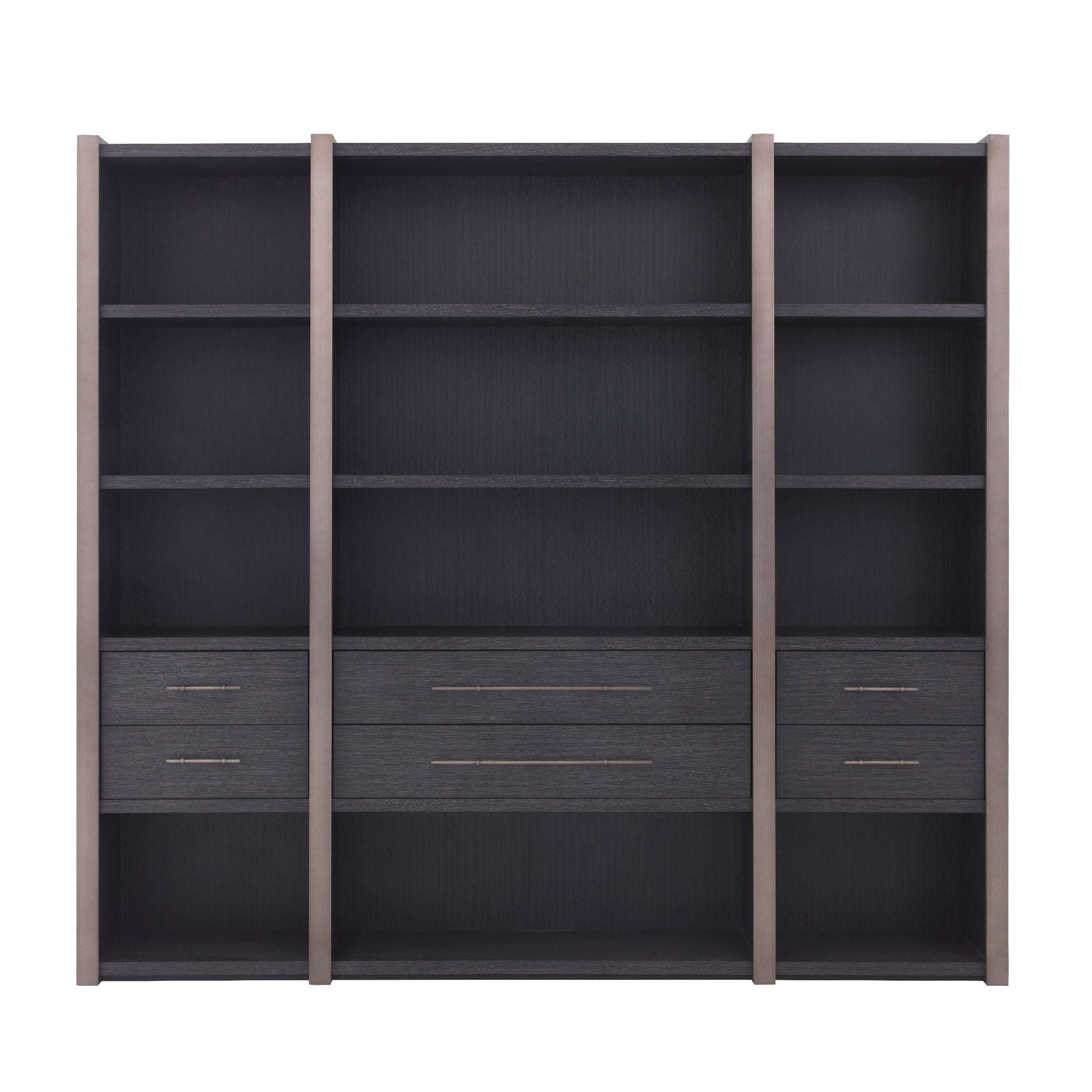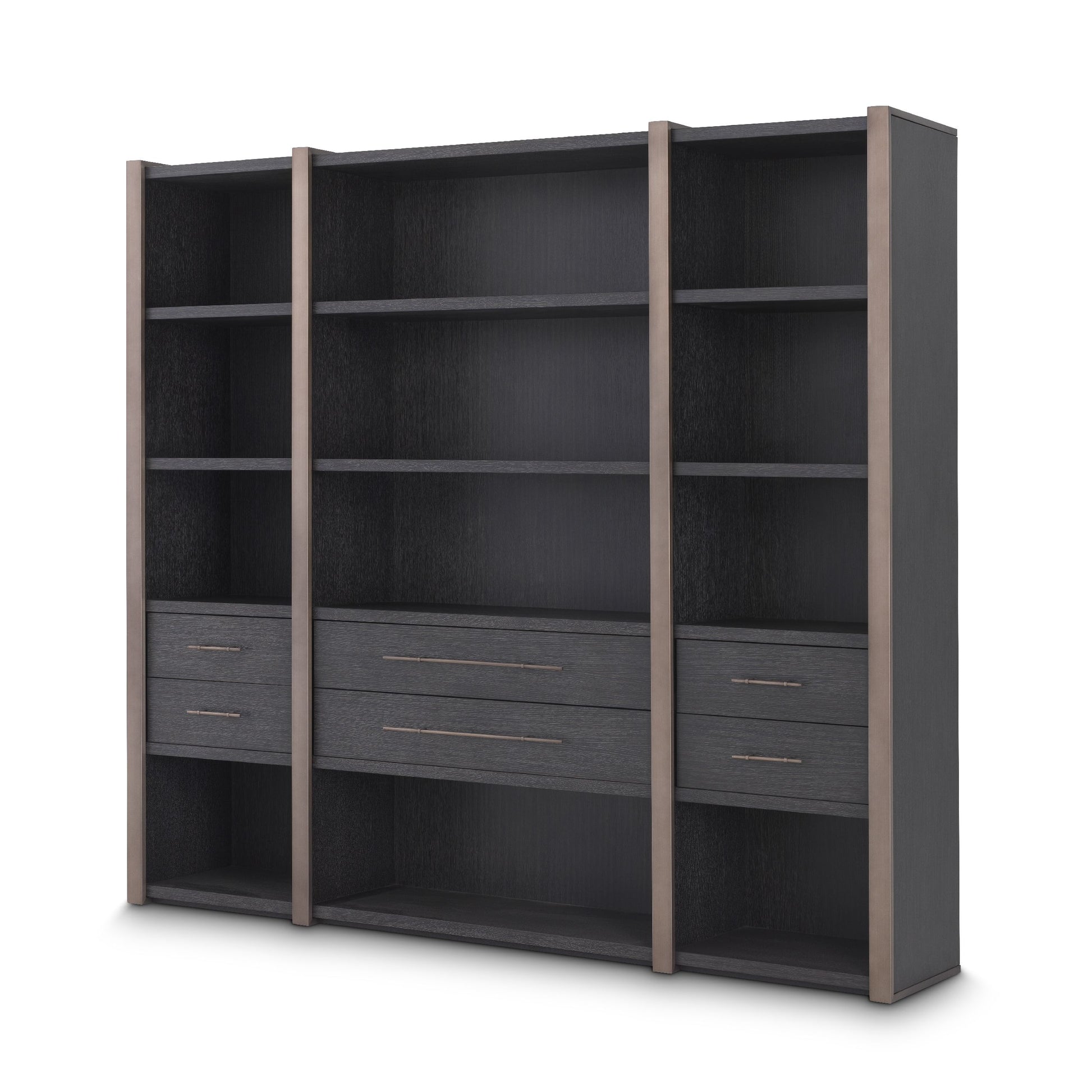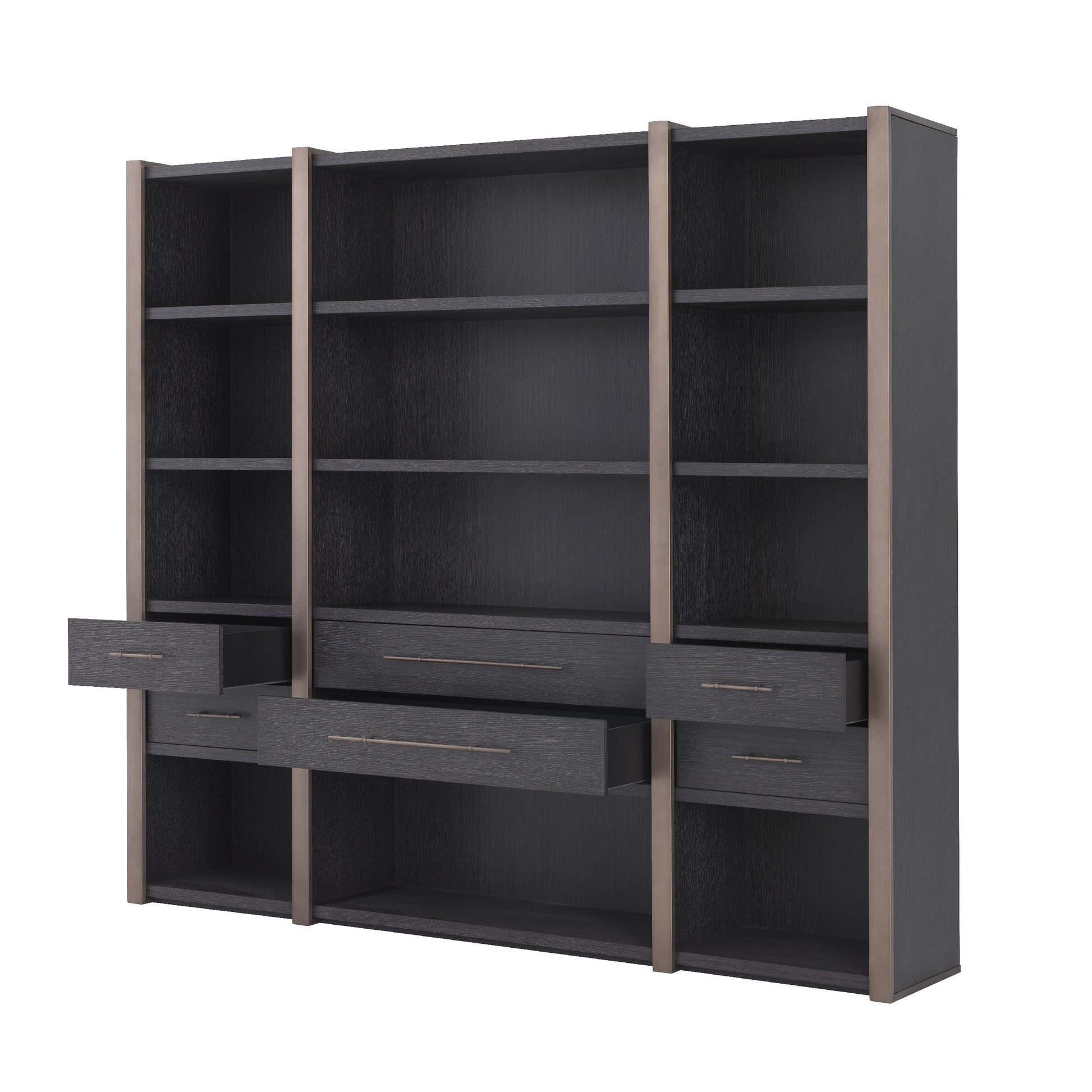 Hylla Canova från Eichholtz är en extremt rejäl, snygg, exklusiv och mångsidig bokhylla. Perfekt för att visa dina dekorativa favoritföremål, tavelramar och böcker och utstrålar modernitet. Fodralet i kolgrå ek passar bra med ramens och handtagens bronsfinish. Praktisk och elegant. Denna moderna möbel erbjuder gott om förvaringsutrymme med en synlig del för att visa upp dina prydnadsföremål, 2 stora lådor i mitten och 2 mindre lådor på vardera sidan. En inredningsdetalj som garanterat drar ögonen åt sig.