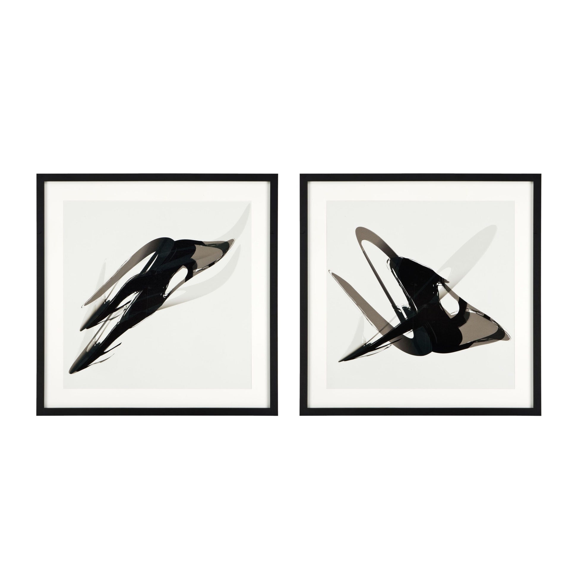 Set of two abstract prints by artist Ivan Melotti. Combining black, coffee and white, these stunning artworks will add graphic appeal to your interior. Both prints come in a sleek black wood frame with a matching white passe-partout.