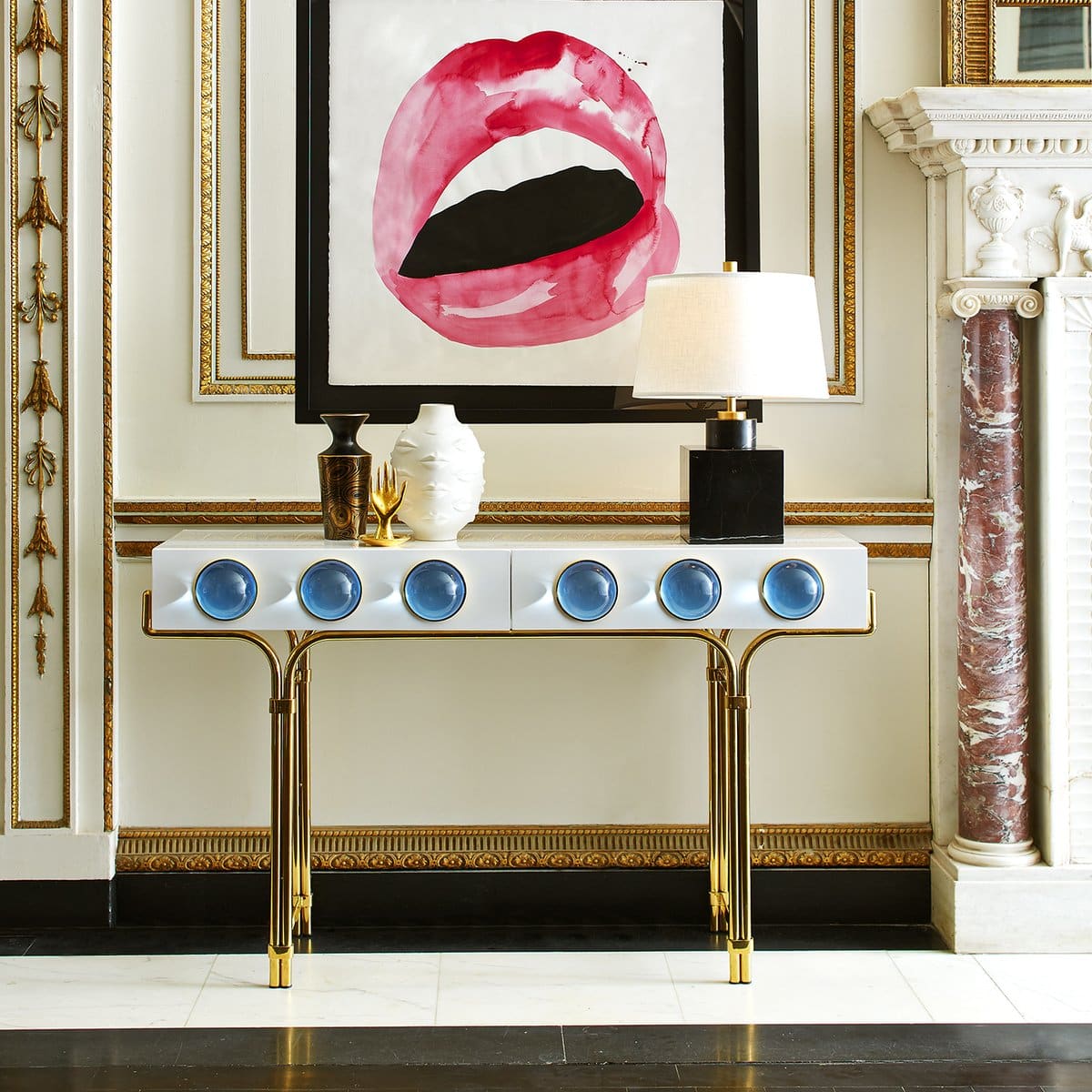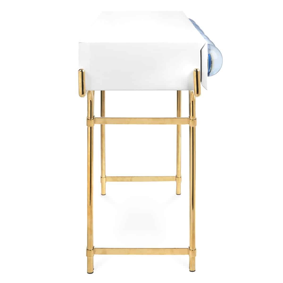 A glossy, white lacquer cabinet cradled by a sinuous brass framework and capped with blue solid acrylic cabochons. Small footprint but big impact, our Globo Console is guaranteed to deliver mega glamour.