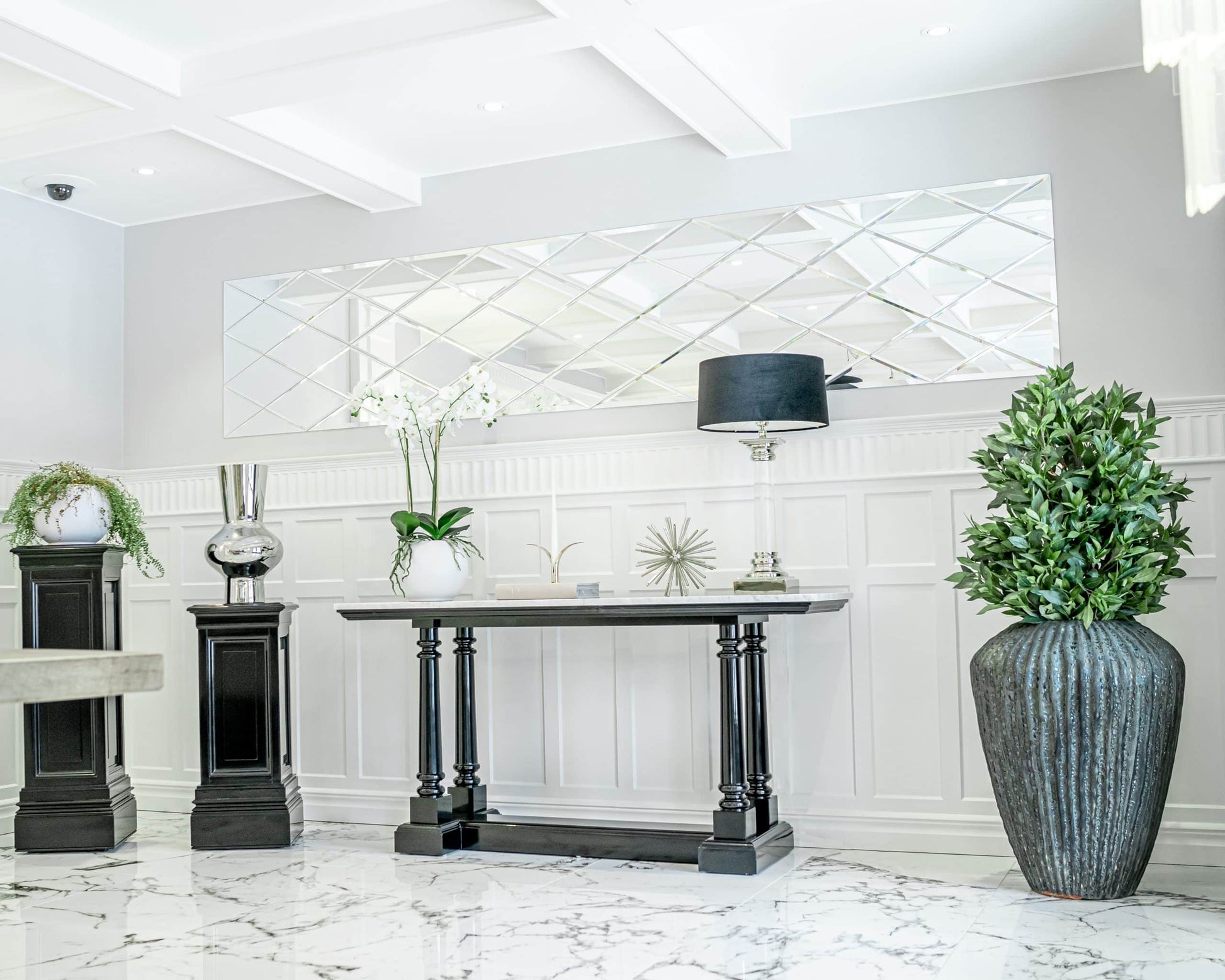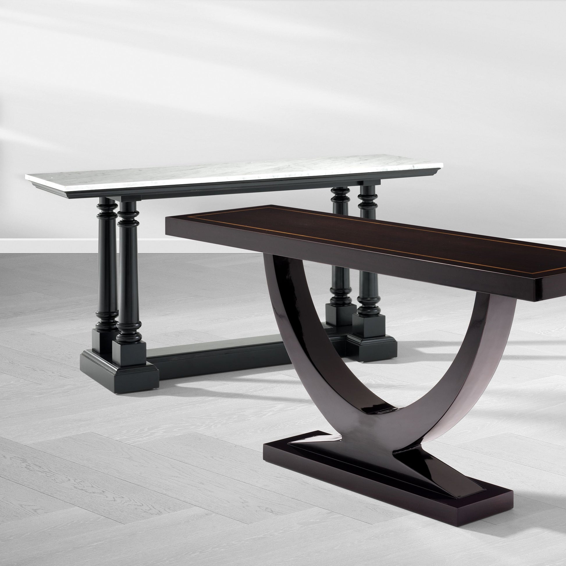 Rejält och stabilt sidobord som känns mycket exklusivt och pampigt med sitt svartvaxade underrede och vita marmorskiva.