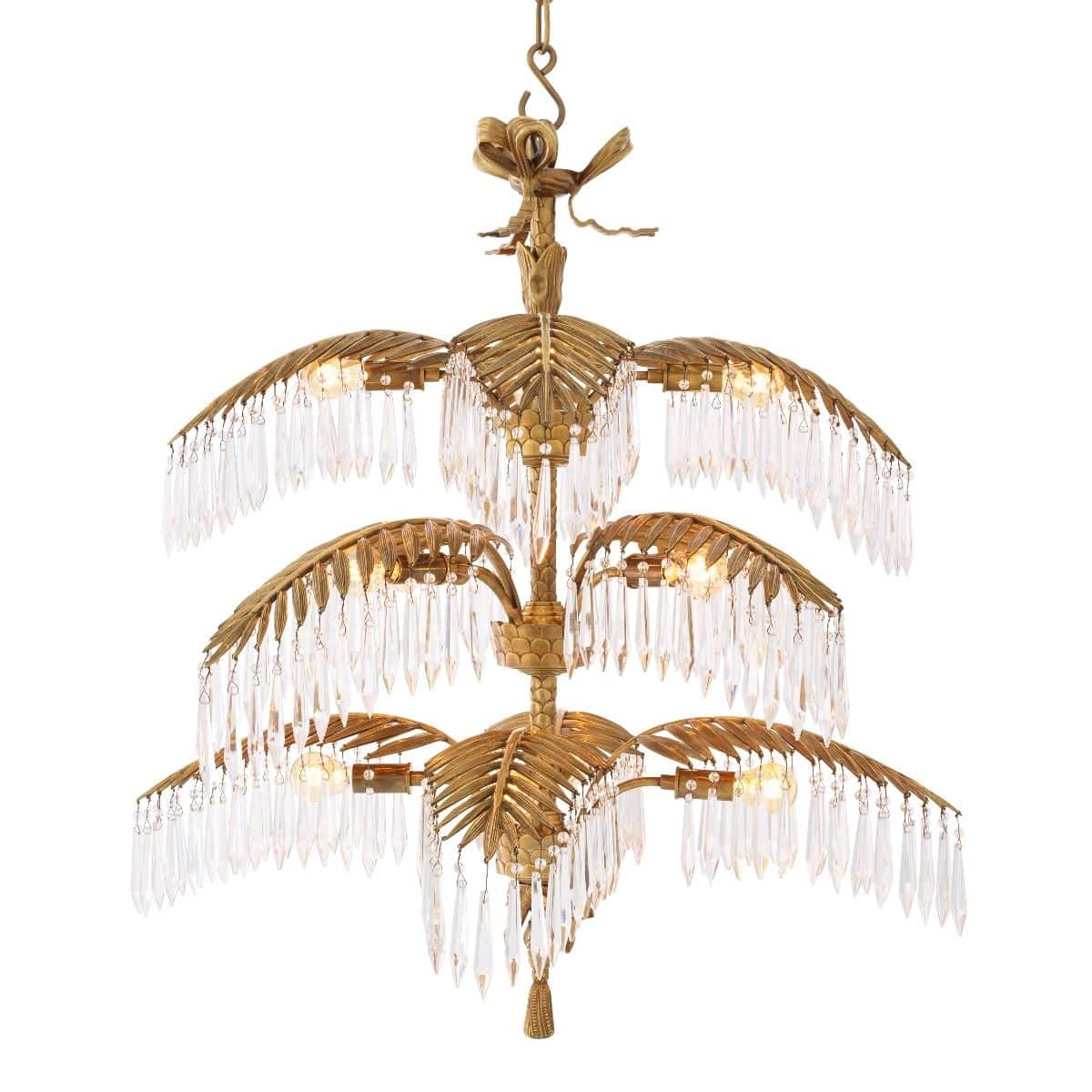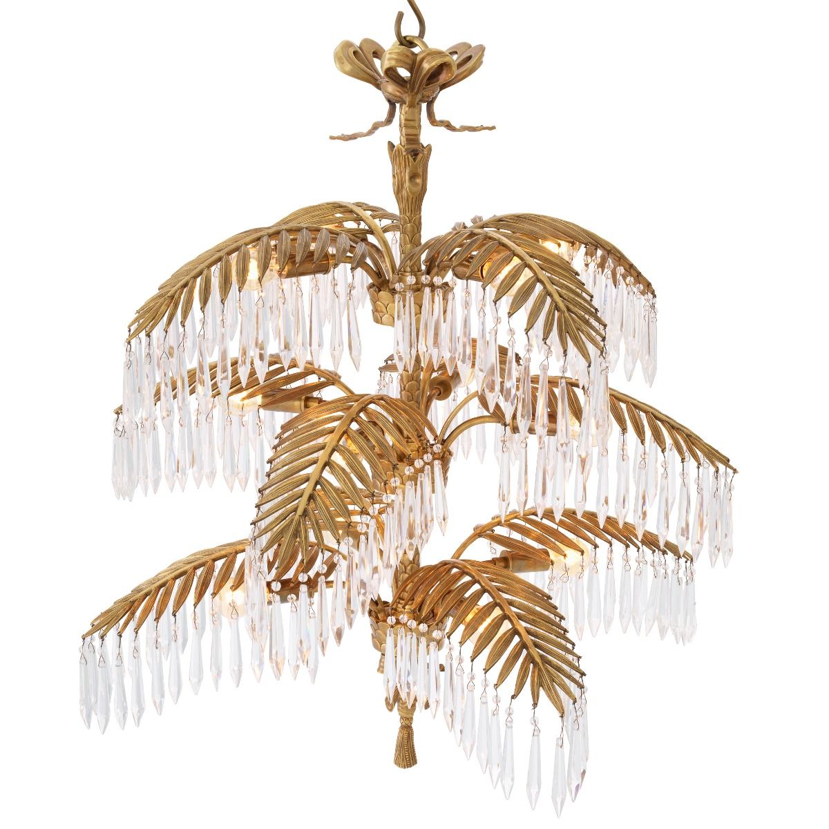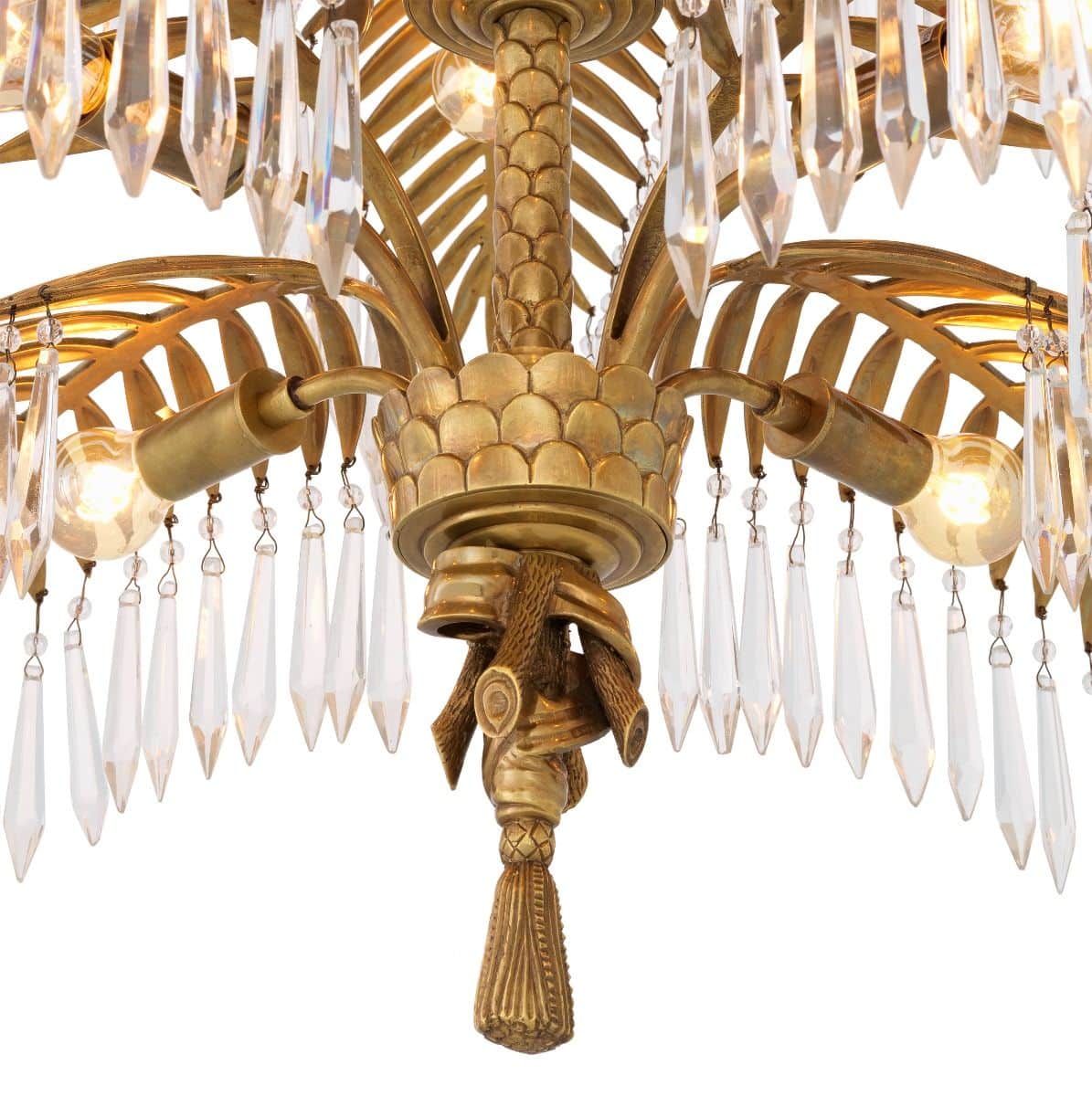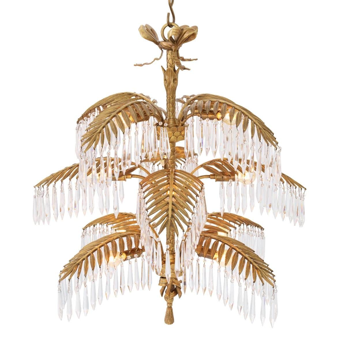 Mycket pampig och ståtlig modern kristallkrona i vintage mässingsfinish med palmliknande blad från vilken eleganta kristallprismor hänger och hela lampan utstrålar elegans, lyx och exklusivitet. En modern och otroligt exklusiv takkrona som snabbt drar åt sig blickfånget och inte bara blir en lampa utan en fantastisk inredningsdetalj som lyfter hela rummet.