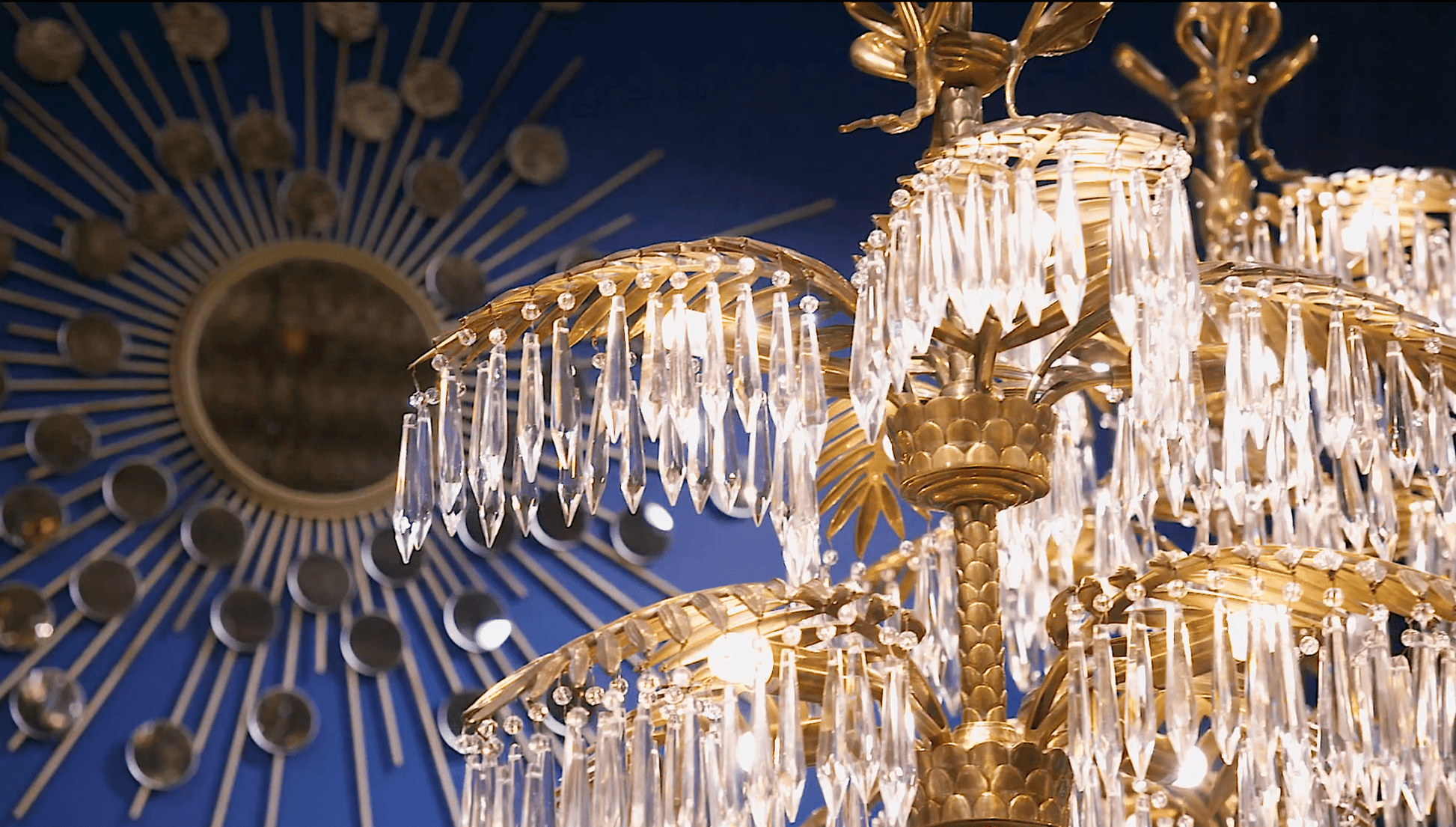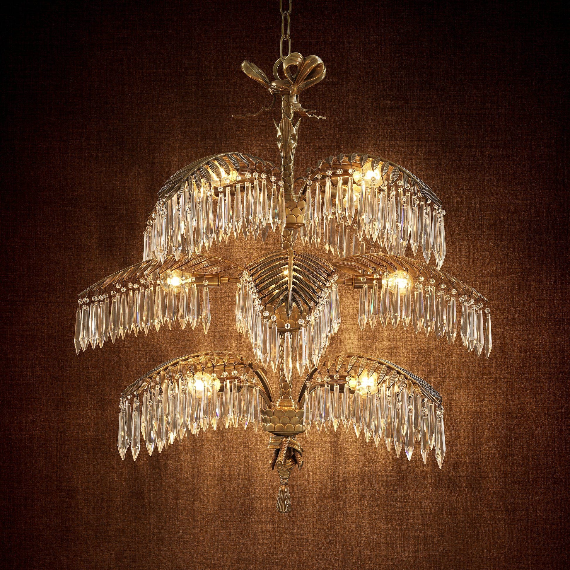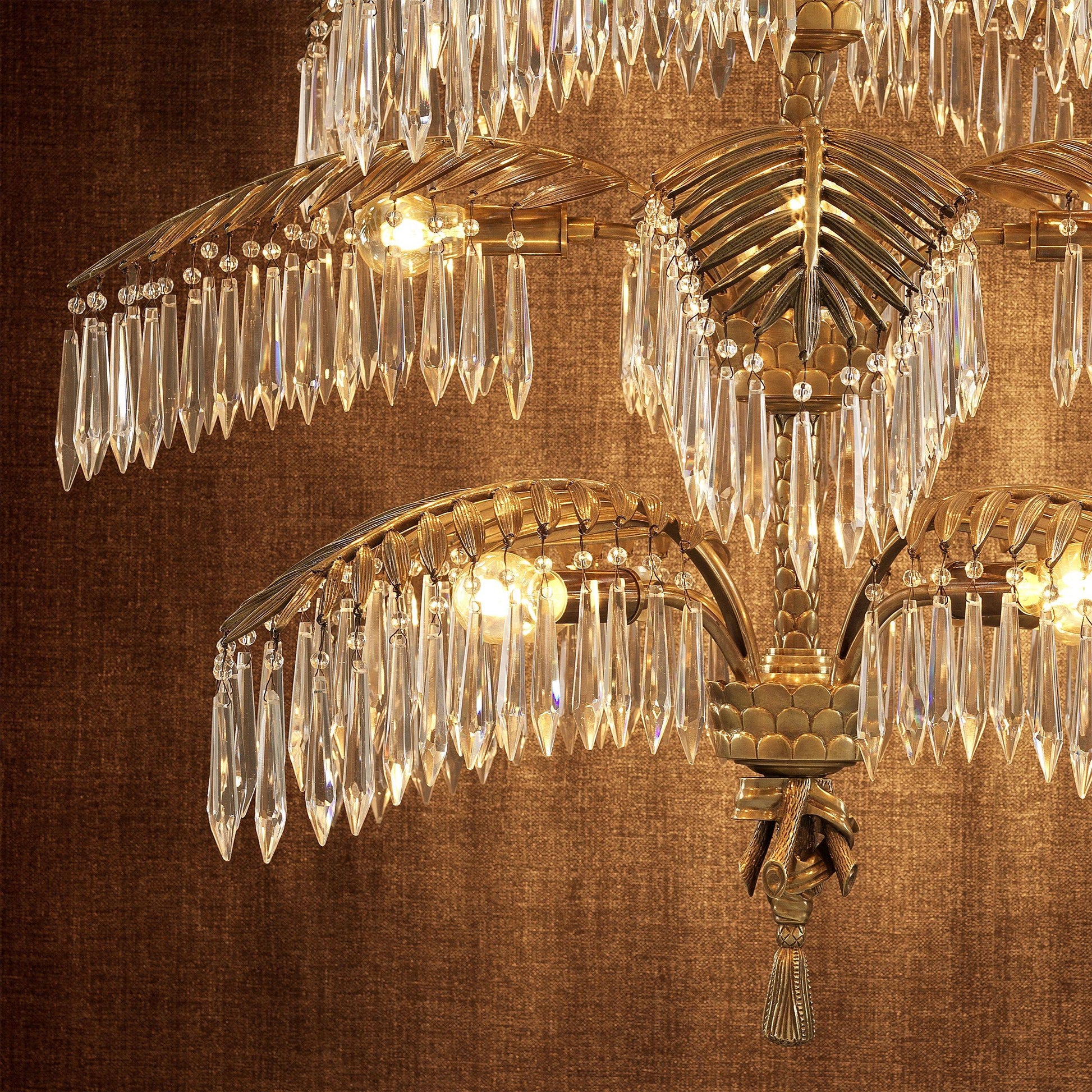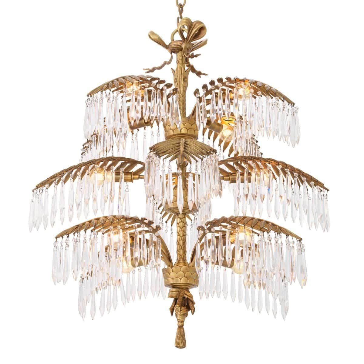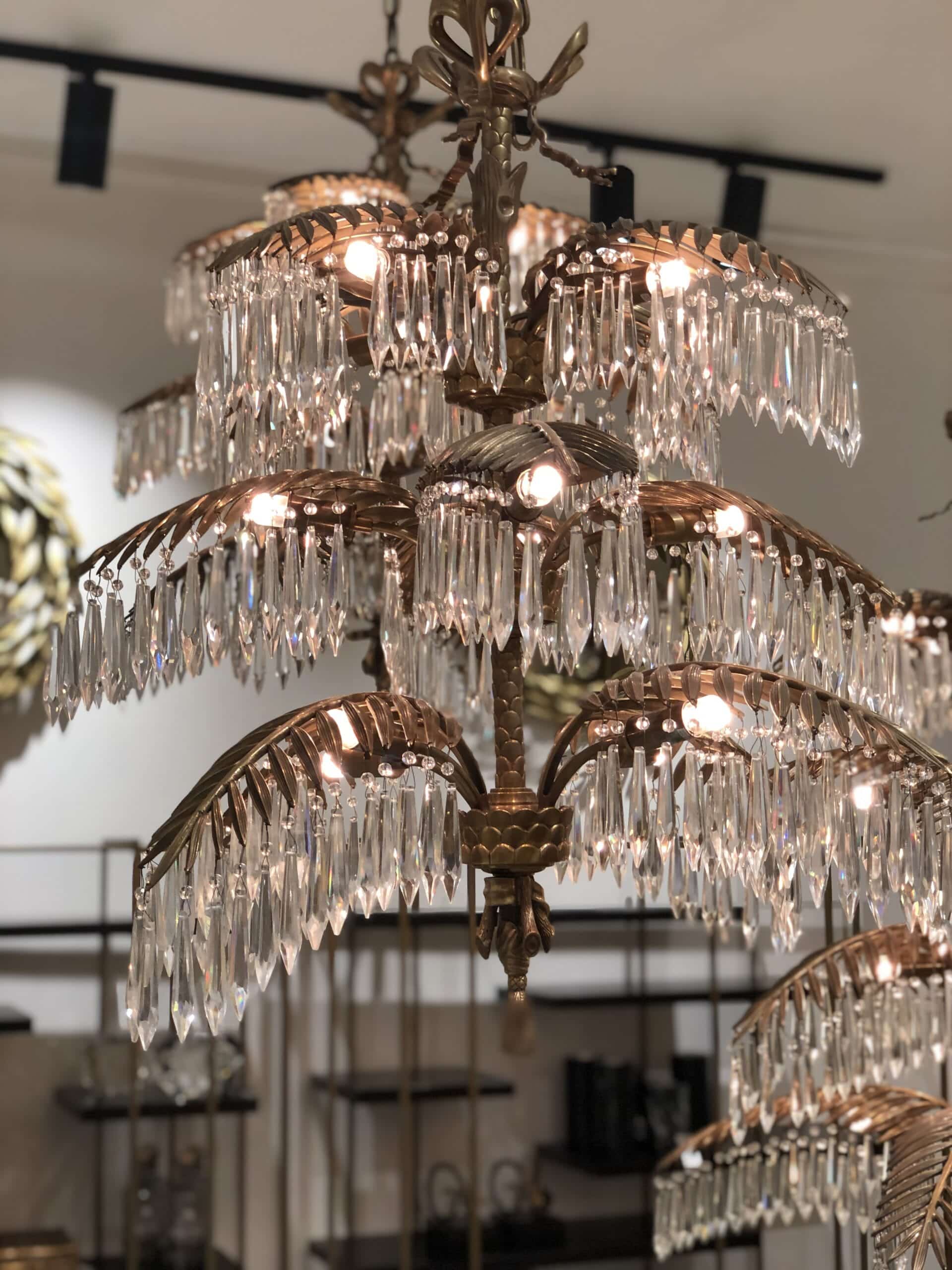 Mycket pampig och ståtlig modern kristallkrona i vintage mässingsfinish med palmliknande blad från vilken eleganta kristallprismor hänger och hela lampan utstrålar elegans, lyx och exklusivitet. En modern och otroligt exklusiv takkrona som snabbt drar åt sig blickfånget och inte bara blir en lampa utan en fantastisk inredningsdetalj som lyfter hela rummet.