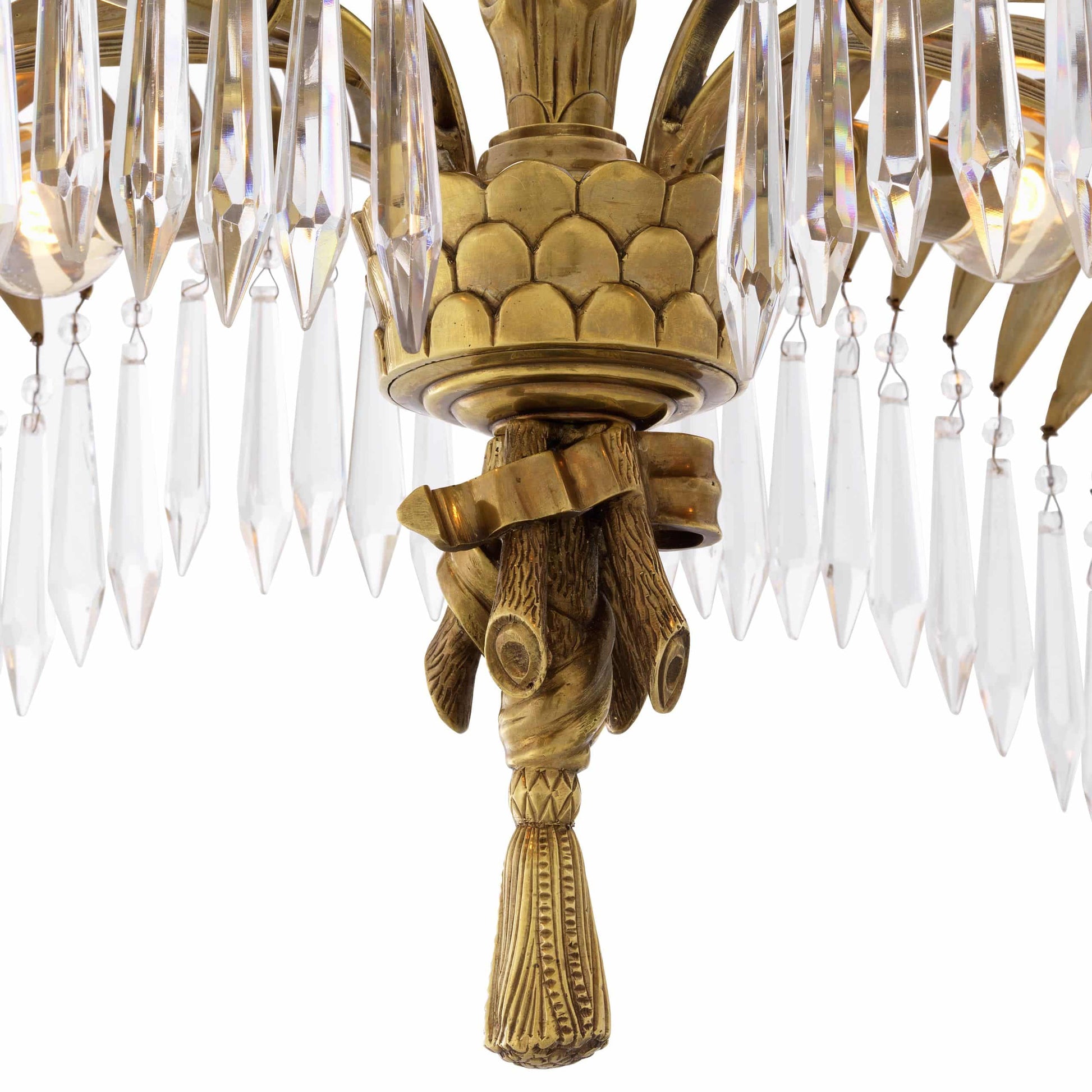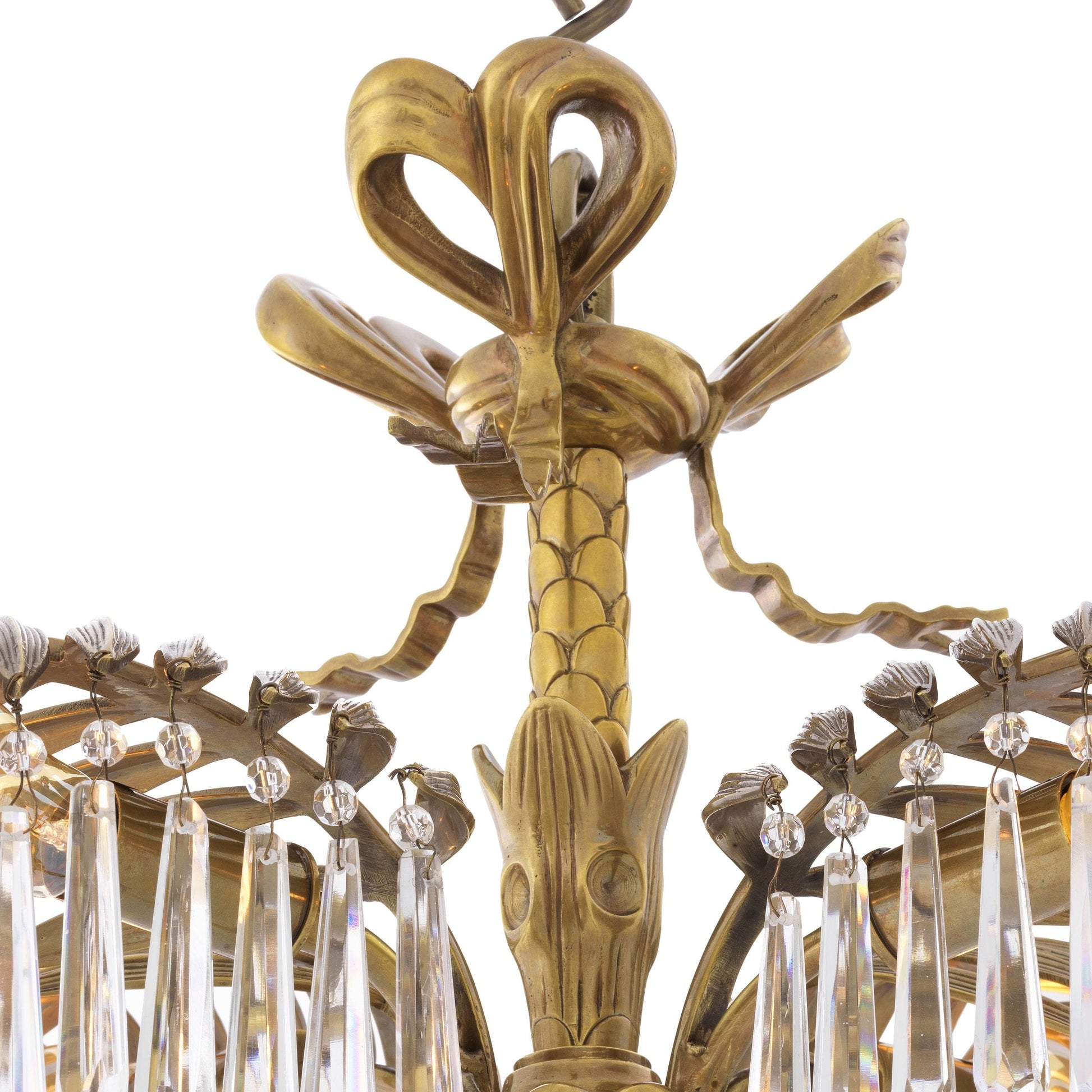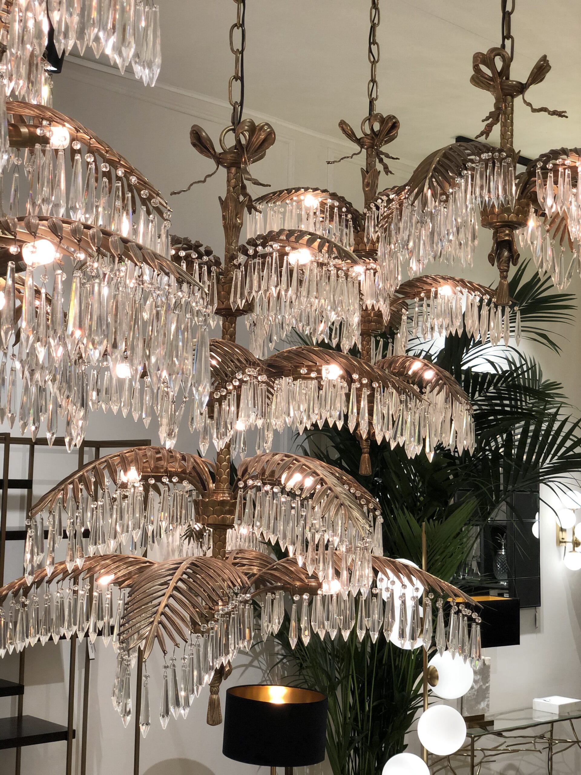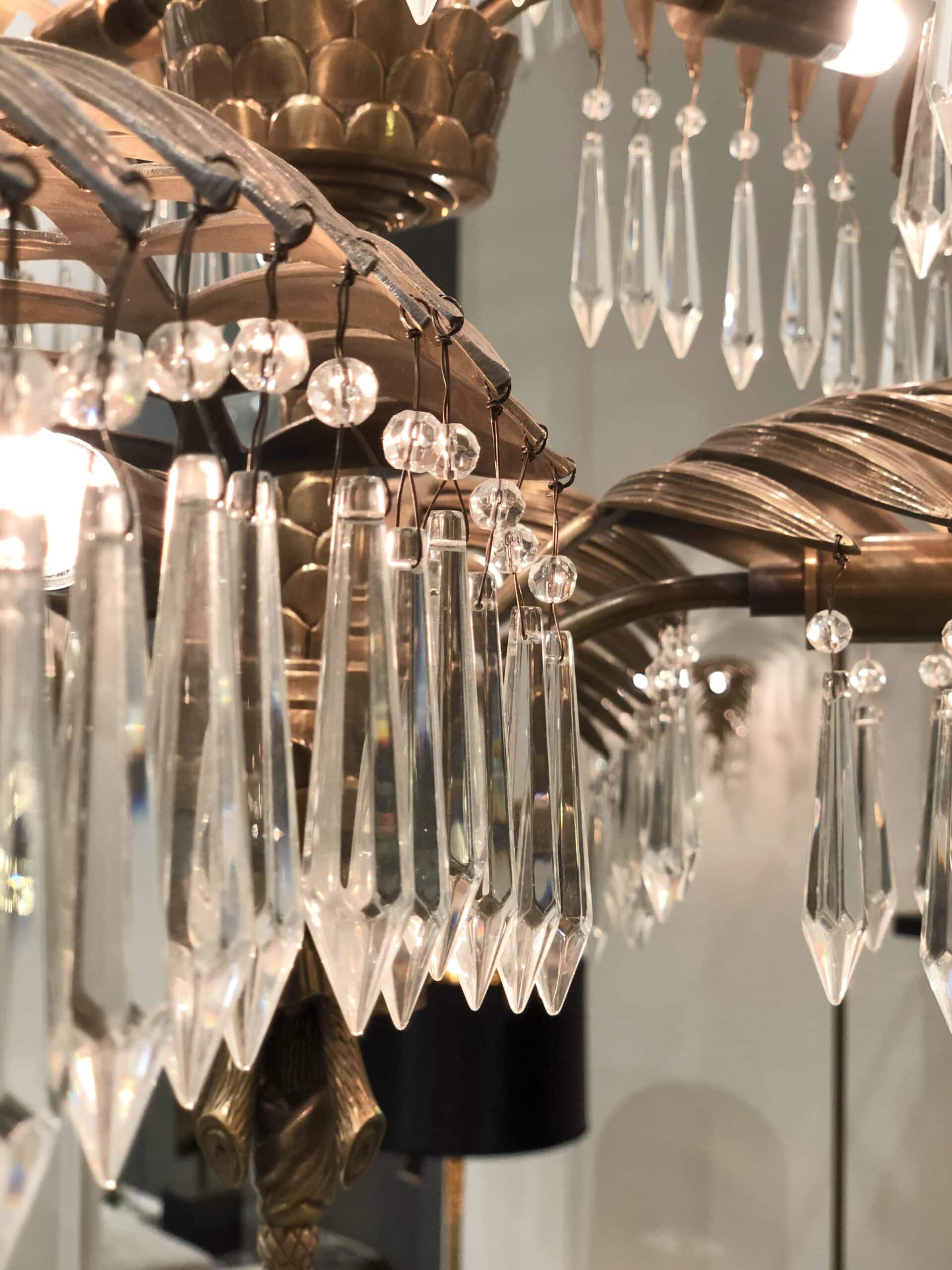 Mycket läcker och exklusiv kristallkrona som för tankarna till tropiska palmblad i vintage mässingsfinish. En underbart snygg modern kristallkrona med fantastiska detaljer och härligt formspråk som snabbt drar åt sig blickarna och blir en underbar inredningsdetalj.