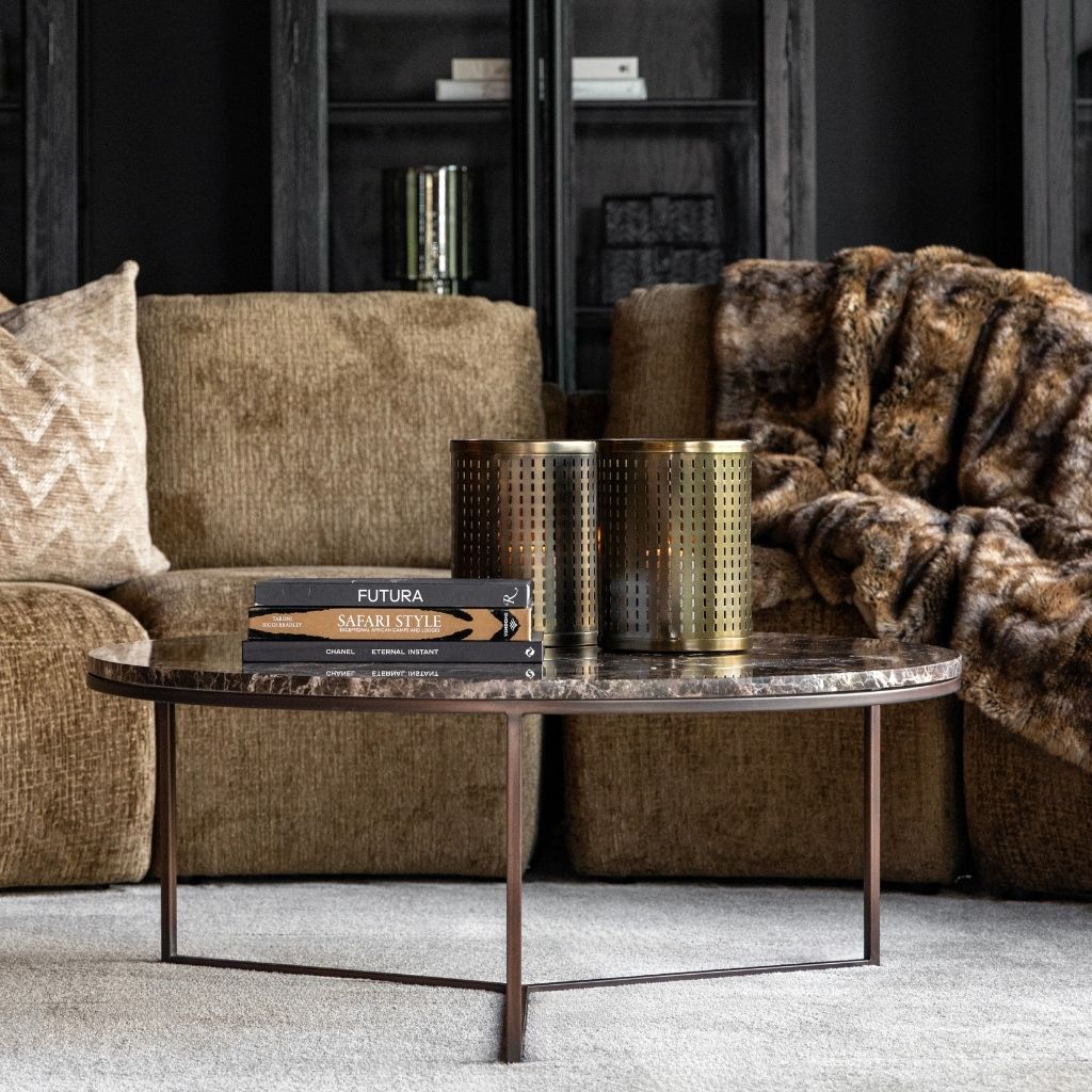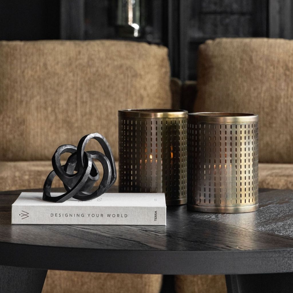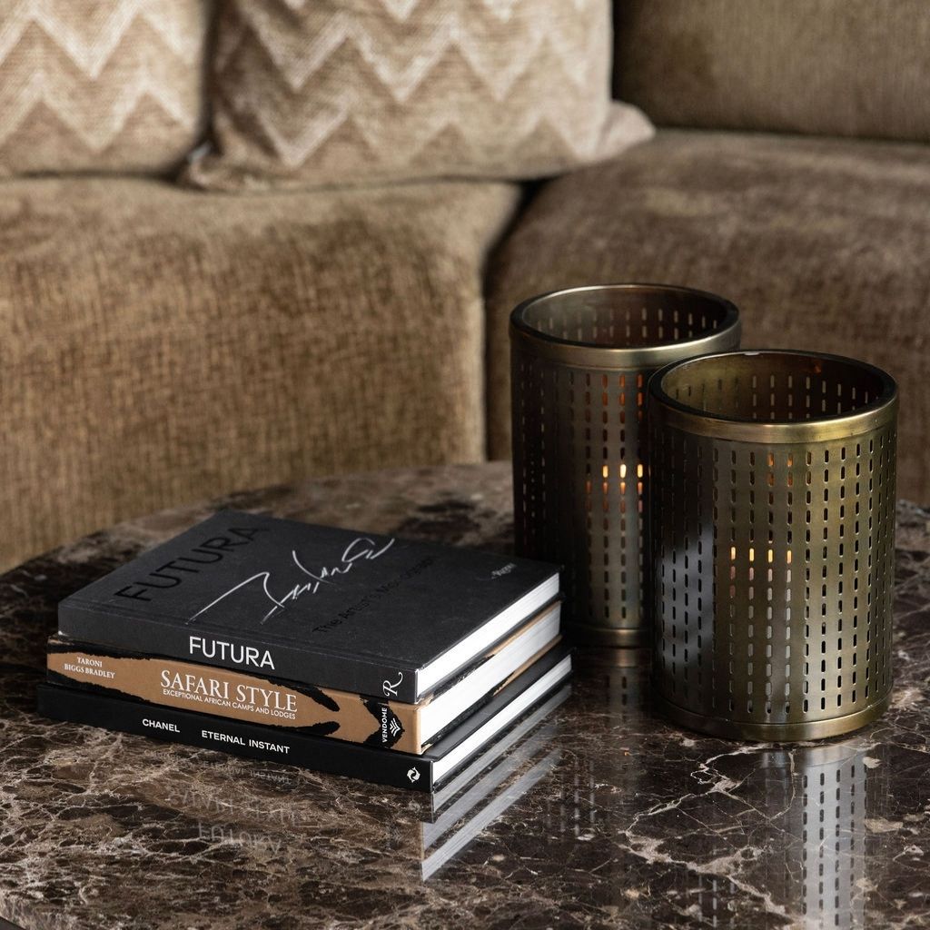 Denna eleganta lykta i perforerad metall sprider ett mjukt och levande ljusspel när du placerar ett värmeljus eller LED-ljus inuti. Den antikbehandlade mässingstonen ger ett varmt uttryck och en tidlös känsla, perfekt för att skapa en inbjudande atmosfär i hemmet.