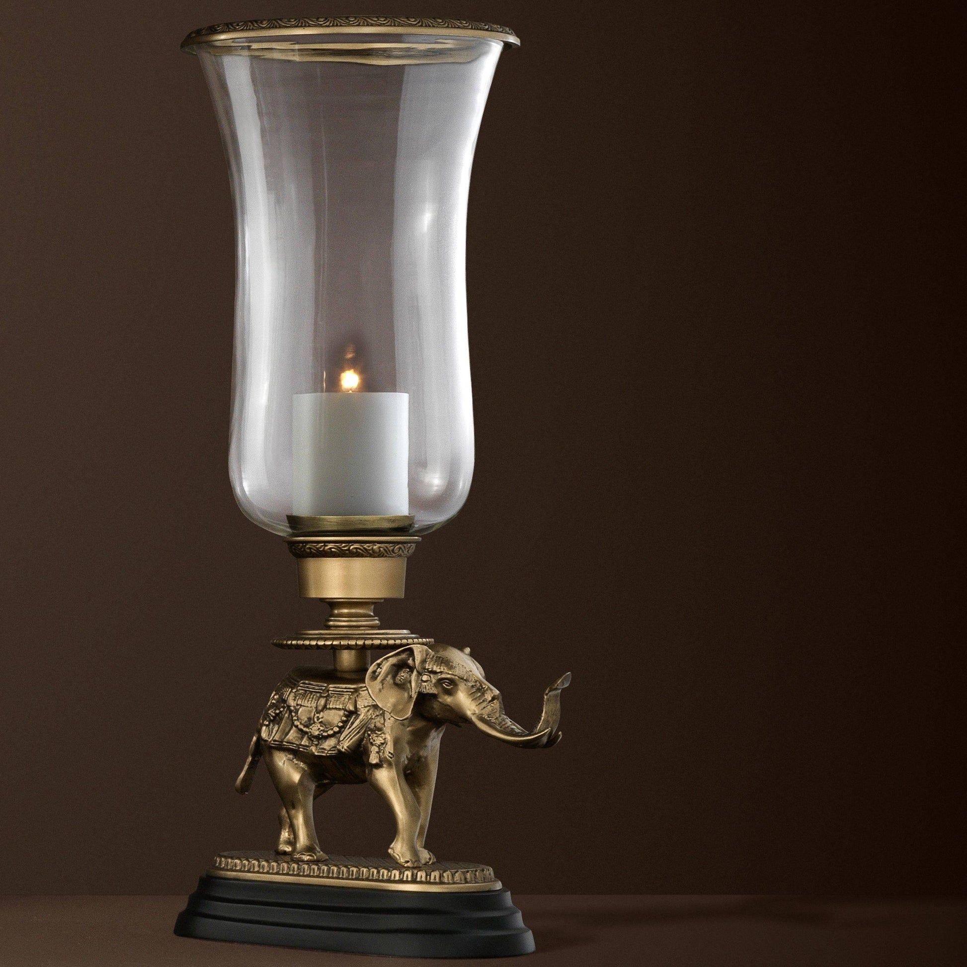 Elegant och ståtlig ljushållare i lyxiga materialval. Härligt detaljerad elefant i vintage mässingsfinish och som står på en fot av svart granit.